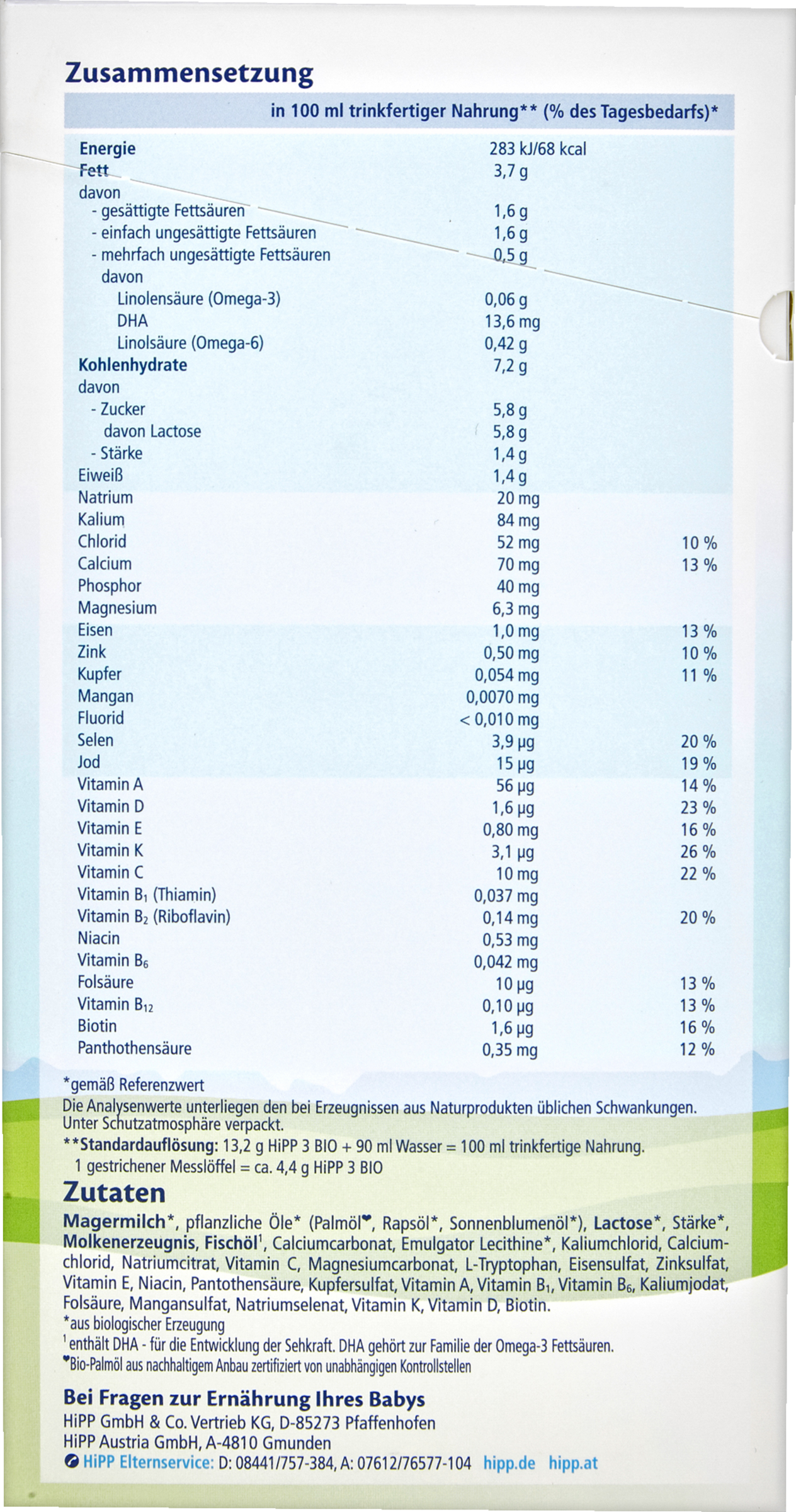 Für die Ernährung Ihres Babys - Ausschließliches Stillen in den ersten sechs Monaten ist ideal für Ihr Baby. Wie jede Folgenahrung sollte HiPP 3 BIO nicht in den ersten sechs Monaten als Muttermilchersatz verwendet werden. Wir empfehlen HiPP 3 BIO ab dem 10. Monat als Bestandteil einer gemischten Ernährung. Die individuellen Wachstums- und Entwicklungsbedürfnisse Ihres Babys können es erf orderlich machen, Folgenahrungen als Teil einer gemischten Ernährung bereits zum Ende des 6. Monats oder ggf. zu einem früheren Zeitpunkt in den Speiseplan Ihres Babys einzuführen. Hierfür eignet sich HiPP 2 BIO. Bitte lassen Sie sich von Ihrem Kinderarzt beraten. Achten Sie auf eine ausgewogene Ernährung und eine gesunde Lebensweise.