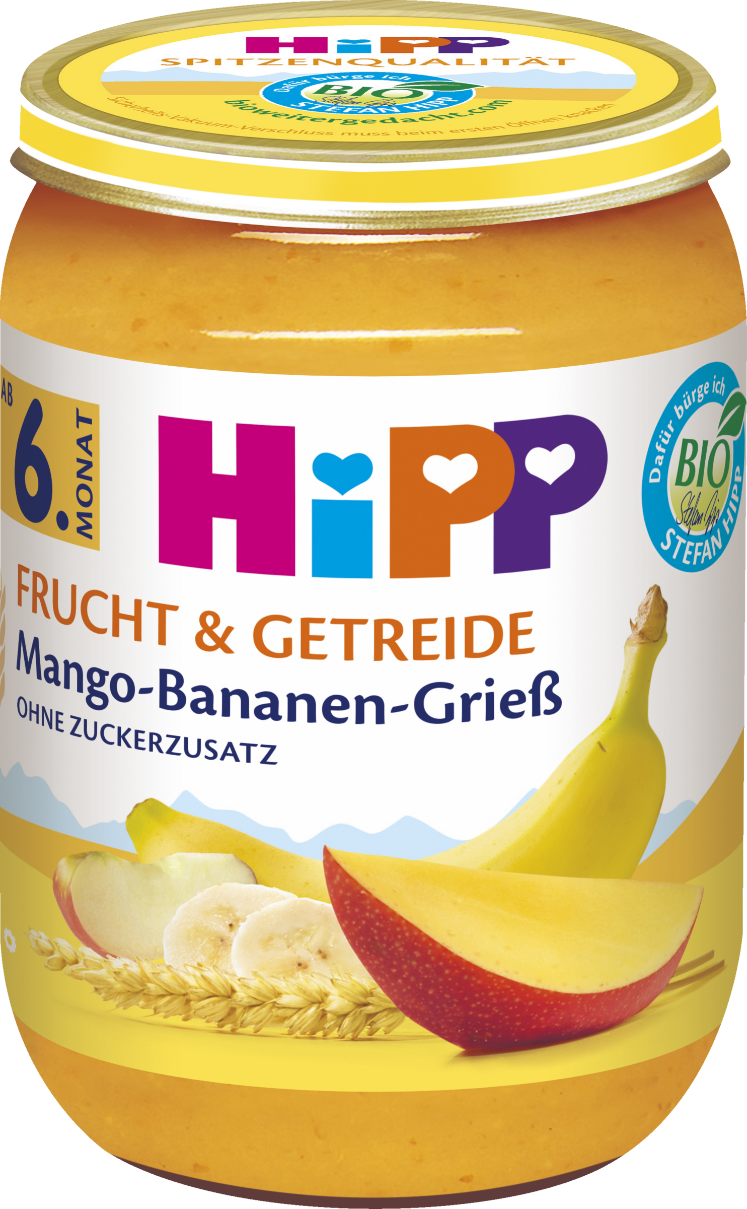 Das HiPP Gläschen Mango-Bananen-Grieß besteht aus speziellen Obstsorten, die genügend Zeit zum Reifen hatten und so ganz natürlich ihren vollen Fruchtgeschmack entwickeln konnten. Natürlich in 100% HiPP Bio Qualität und ohne Zuckerzusatz (Zutaten enthalten von Natur aus Zucker) und süßende Fruchtsaftkonzentrate.