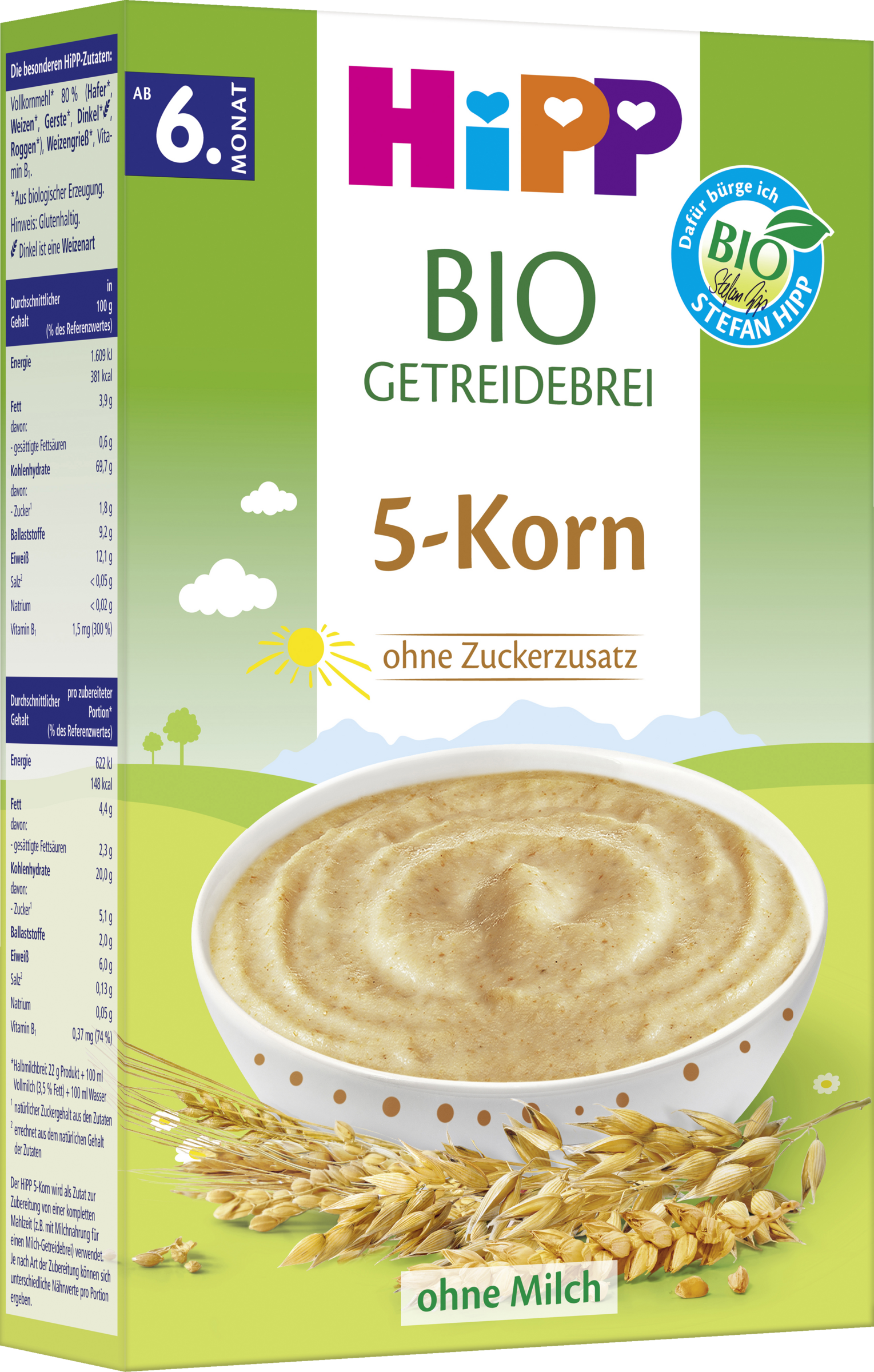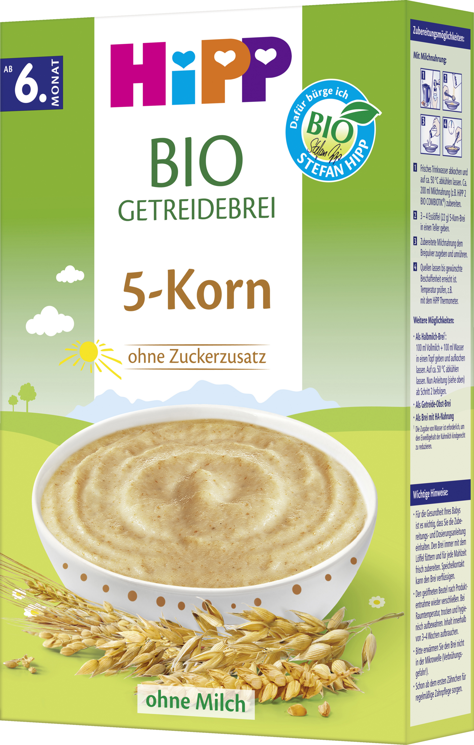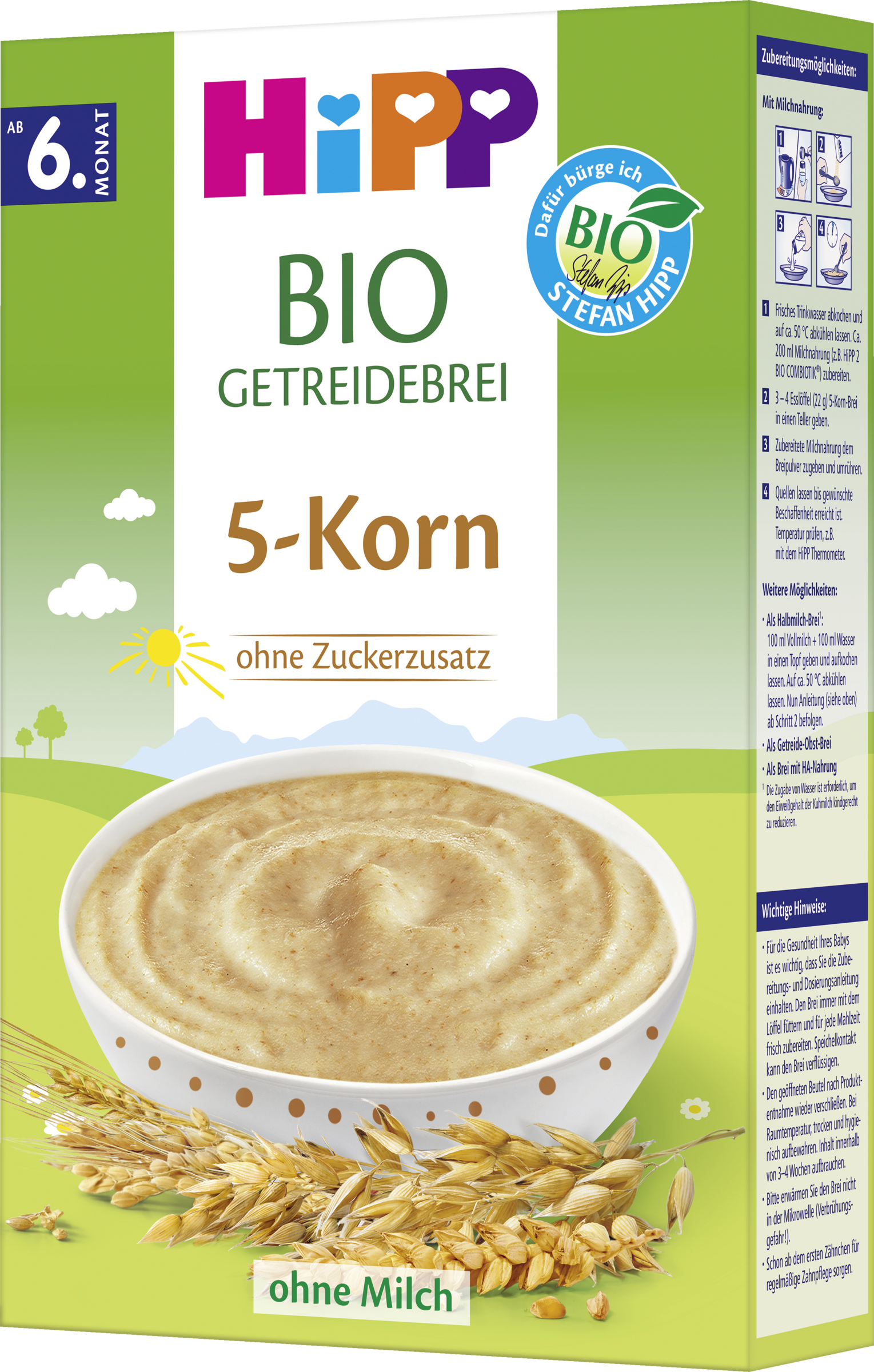 100 ml Wasser abkochen, auf ca. 50°C abkühlen lassen (4). 2 Esslöffel (11 g) HiPP 5-Korn-Brei in einen Teller geben. Das abgekühlte Wasser hinzugeben und umrühren. Gewünschte Teilmenge (ca. 100 g) HiPP Früchte (z.B. Williams-Christ-Birne) oder wahlweise HiPP Gemüse (z.B. Kürbis) hinzugeben und einen Teelöffel HiPP Bio Rapsöl einrühren. Quellen lassen bis gewünschte Beschaffenheit erreicht ist. Temperatur überprüfen.