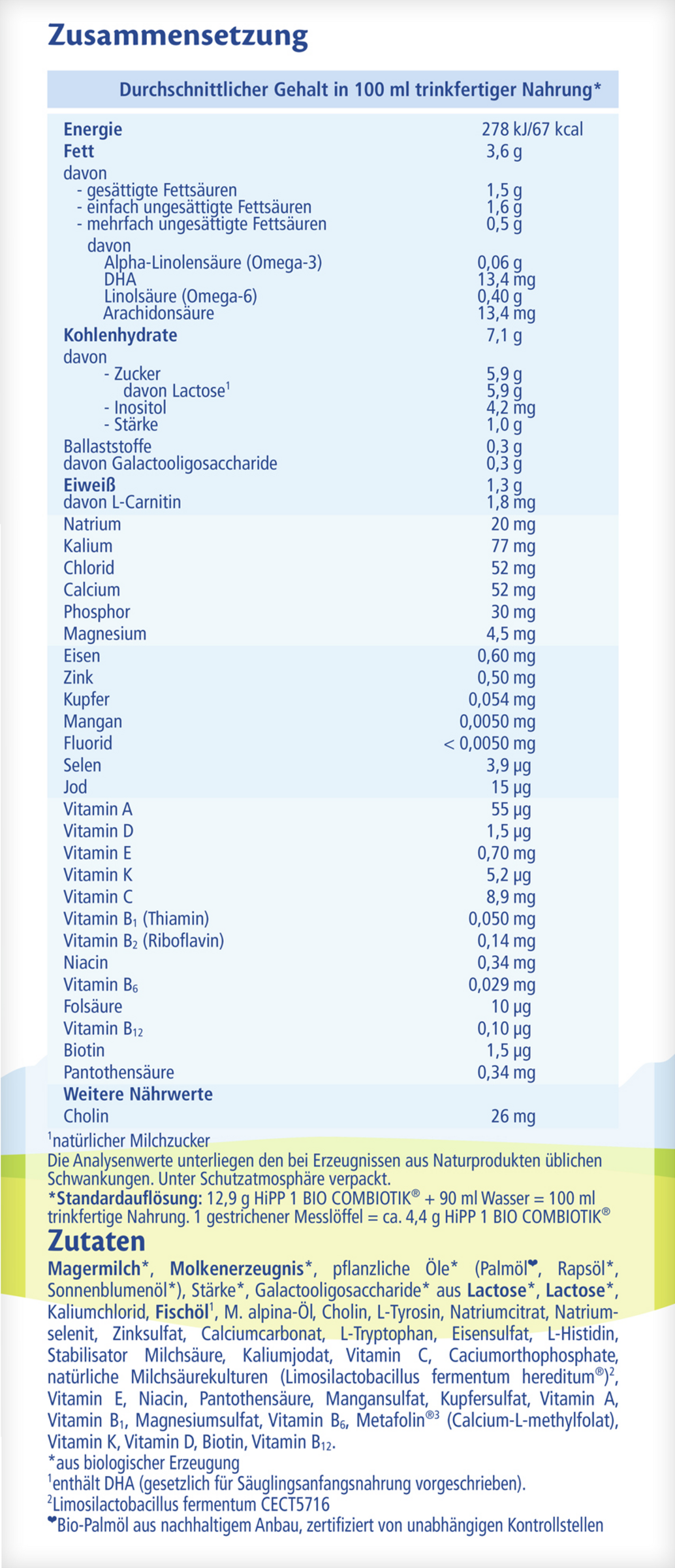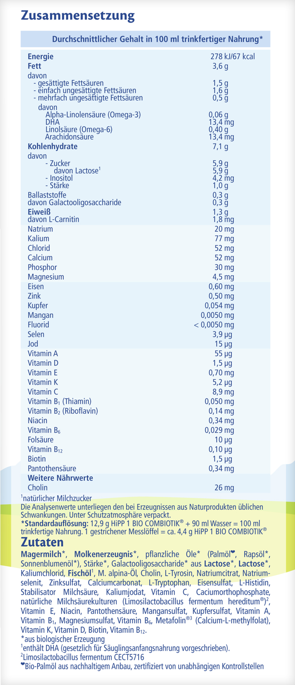 MAGERMILCH*, MOLKENERZEUGNIS*, pflanzliche Öle* (Palmöl**, Rapsöl*, Sonnenblumenöl*), Stärke*, Galactooligosaccharide* aus LACTOSE*, LACTOSE*, Kaliumchlorid, FISCHÖL¹, M. alpina-Öl, Cholin, L-Tyrosin, Natriumcitrat, Natriumselenit, Zinksulfat, Calciumcarbonat, L-Tryptophan, Eisensulfat, L-Histidin, Stabilisator Milchsäure, Kaliumjodat, Vitamin C, Caciumorthophosphate, natürliche Milchsäurekulturen (Limosilactobacillus fermentum hereditum®)², Vitamin E, Niacin, Pantothensäure, Mangansulfat, Kupfersulfat, Vitamin A, Vitamin B1, Magnesiumsulfat, Vitamin B6, Metafolin®³ (Calcium-L-methylfolat), Vitamin K, Vitamin D, Biotin, Vitamin B12.