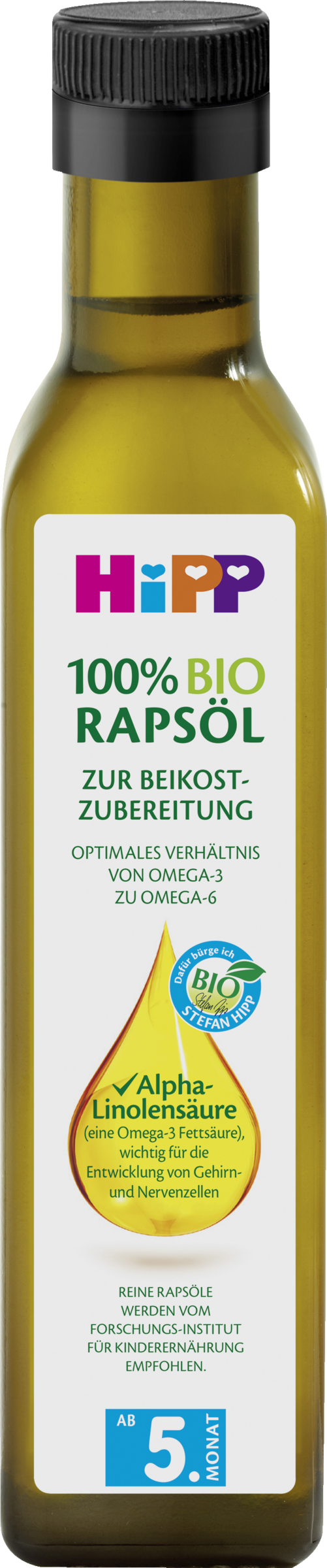 - das HiPP 100% Bio-Rapsöl hat im Vergleich zu vielen anderen Speiseölen einen hohen Gehalt an Omega-3, das wichtig ist für die Entwicklung von Gehirn- und Nervenzellen