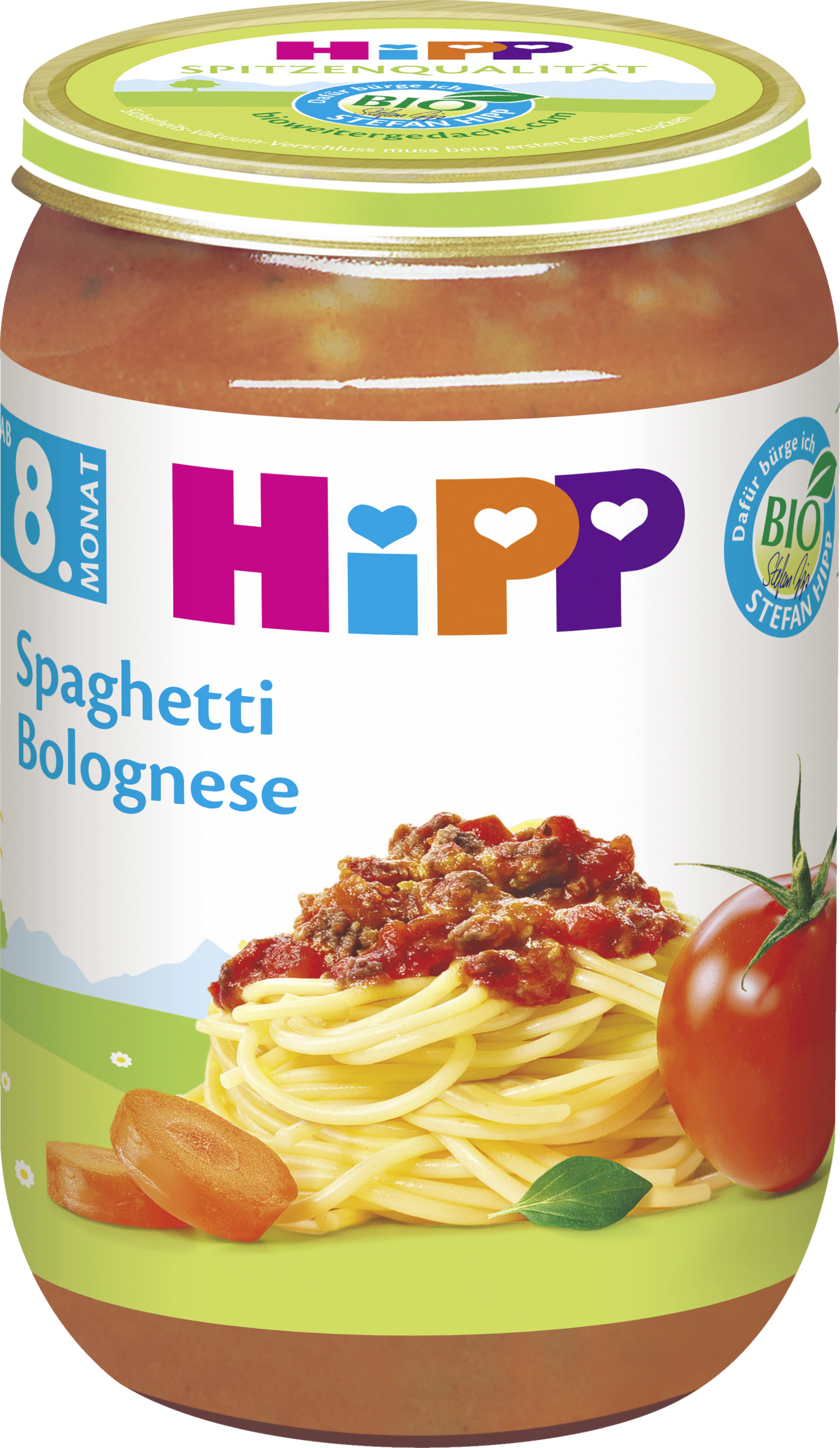 HiPP Spaghetti Bolognese, eine vollwertige Mahlzeit ab dem 8. Monat.