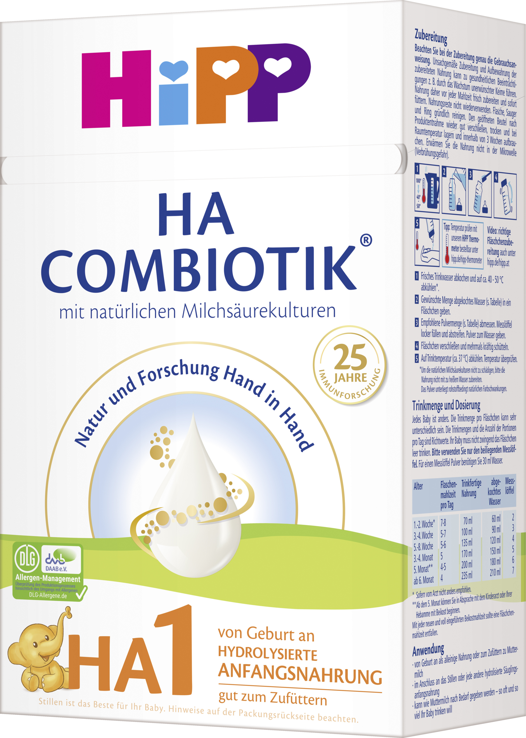 HiPP HA 1 COMBIOTIKĀ® darf nicht verwendet werden, wenn bereits eine KuhmilcheiweiĆallergie besteht oder der Verdacht auf eine solche vorliegt.