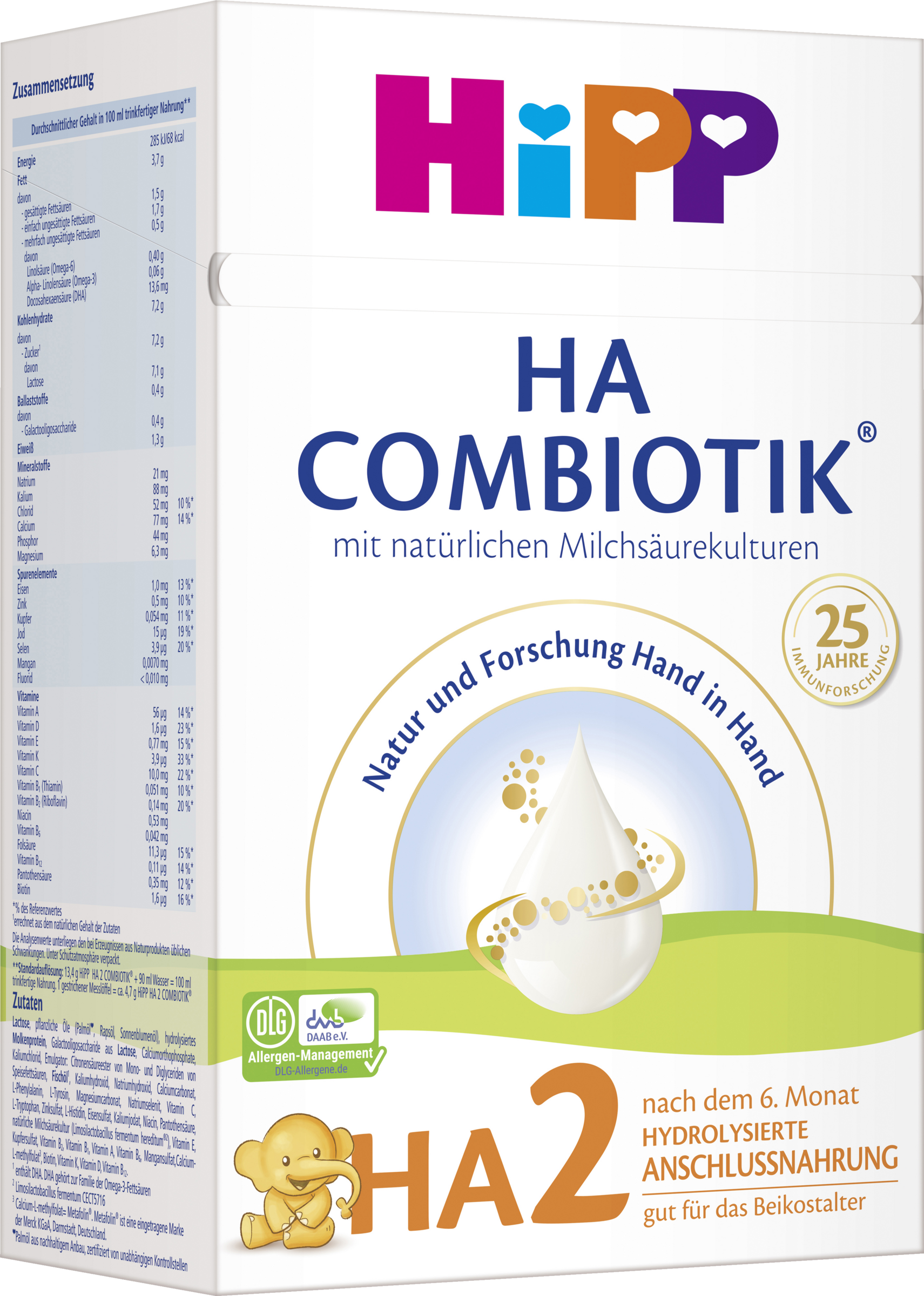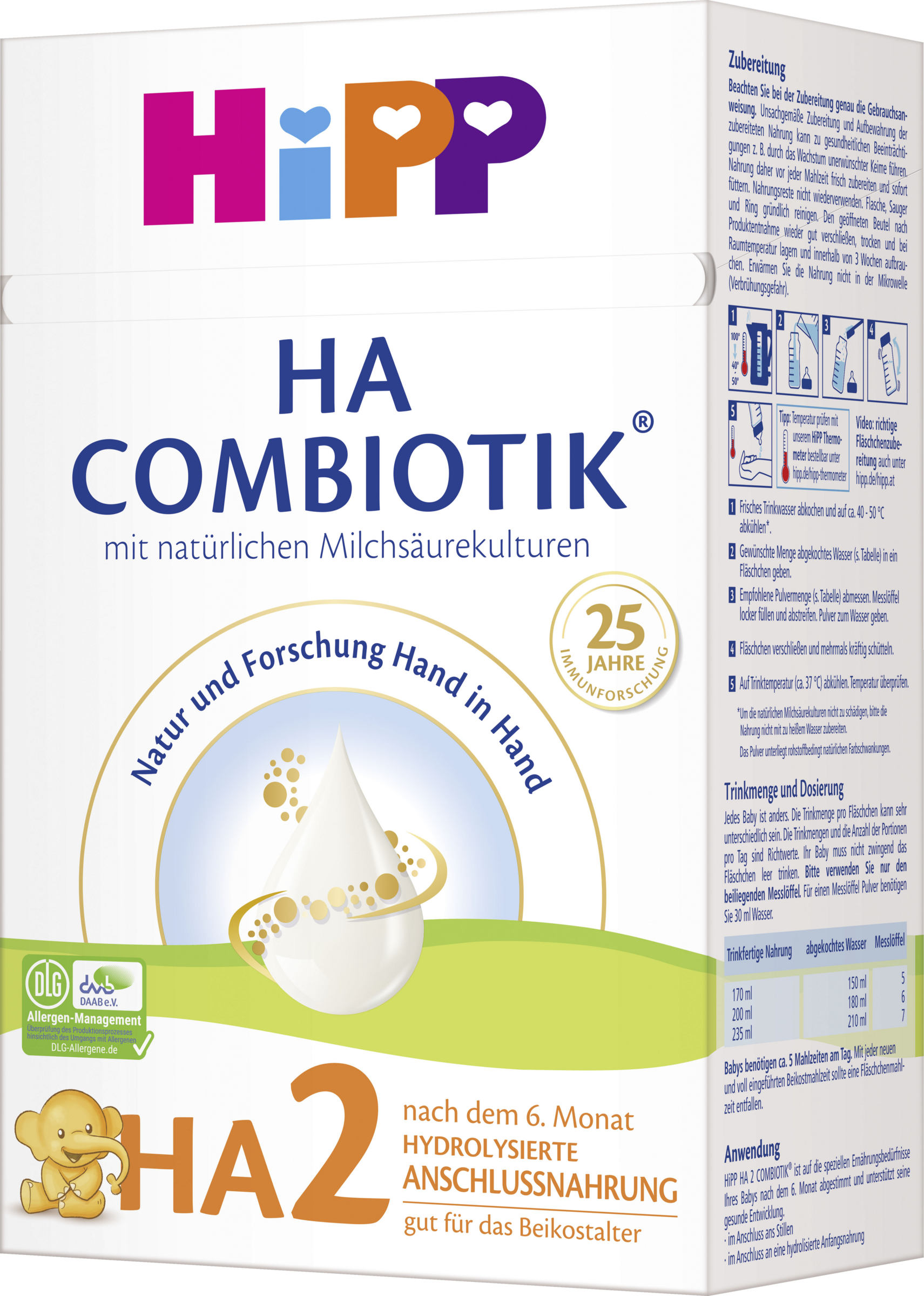 HiPP HA 2 COMBIOTIKĀ® darf nicht verwendet werden, wenn bereits eine KuhmilcheiweiĆallergie besteht oder der Verdacht auf eine solche vorliegt.