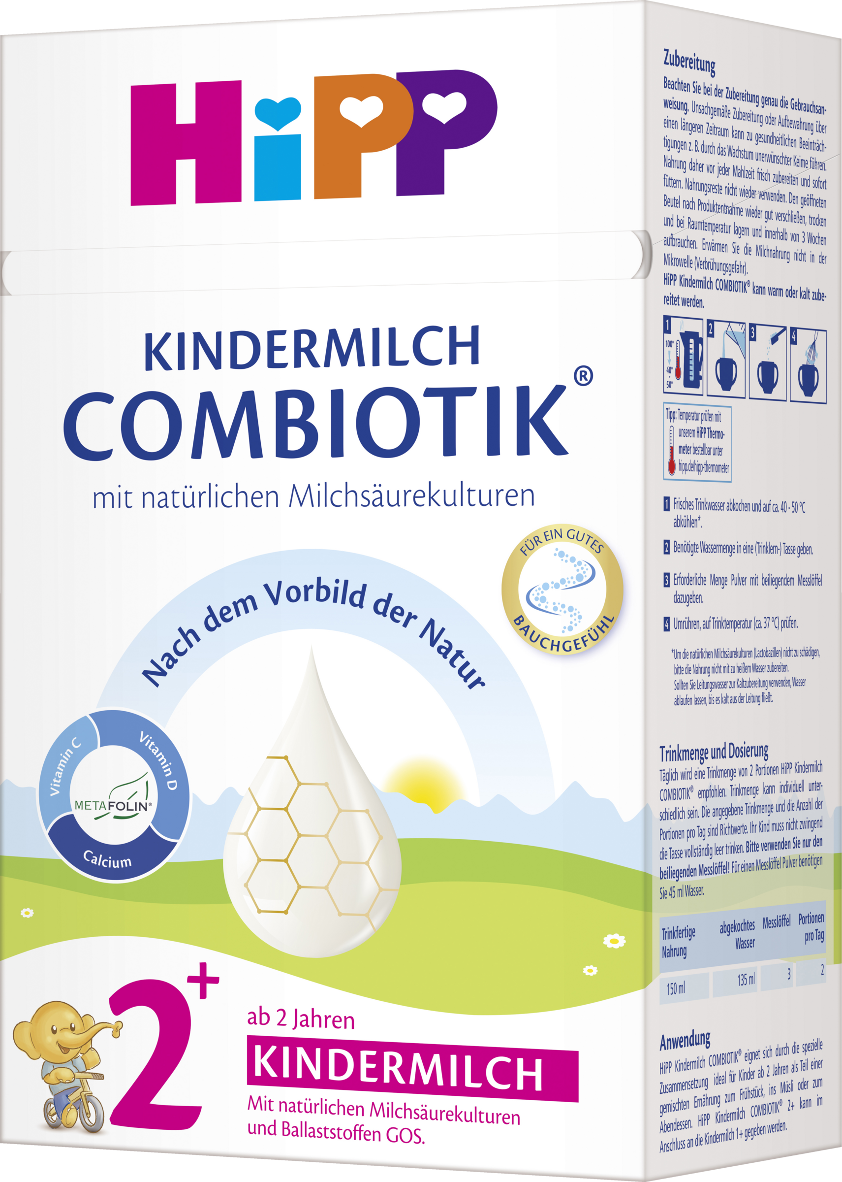 Täglich wird eine Trinkmenge von 2 Portionen HiPP Kindermilch COMBIOTIK® empfohlen. Trinkmenge kann individuell unterschiedlich sein. Empfohlene Trinkmenge und Anzahl der Portionen pro Tag sind Richtwerte. Ihr Kind muss nicht zwingend die Tasse vollständig leer trinken. Für einen Messlöffel Pulver benötigen Sie 45 ml Wasser. 150 ml trinkfertige Nahrung = 135 ml abgekochtes Wasser + 3 Messlöffel, Portionen pro Tag: 2