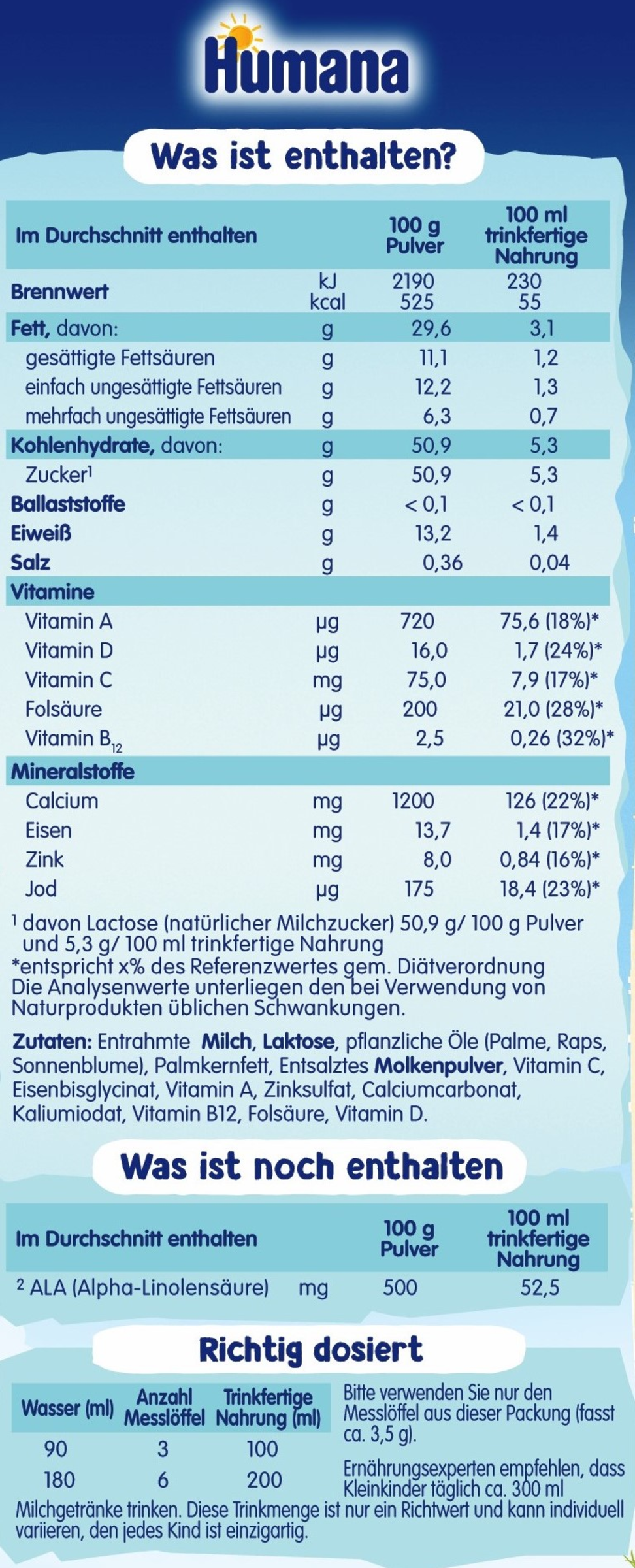 Entrahmte MILCH, LAKTOSE, pflanzliche Öle (Palme, Raps, Sonnenblume), Palmkernfett, Entsalztes MOLKENPULVER, Vitamin C, Eisenbisglycinat, Vitamin A, Zinksulfat, Calciumcarbonat, Kaliumiodat, Vitamin B12, Folsäure, Vitamin D.