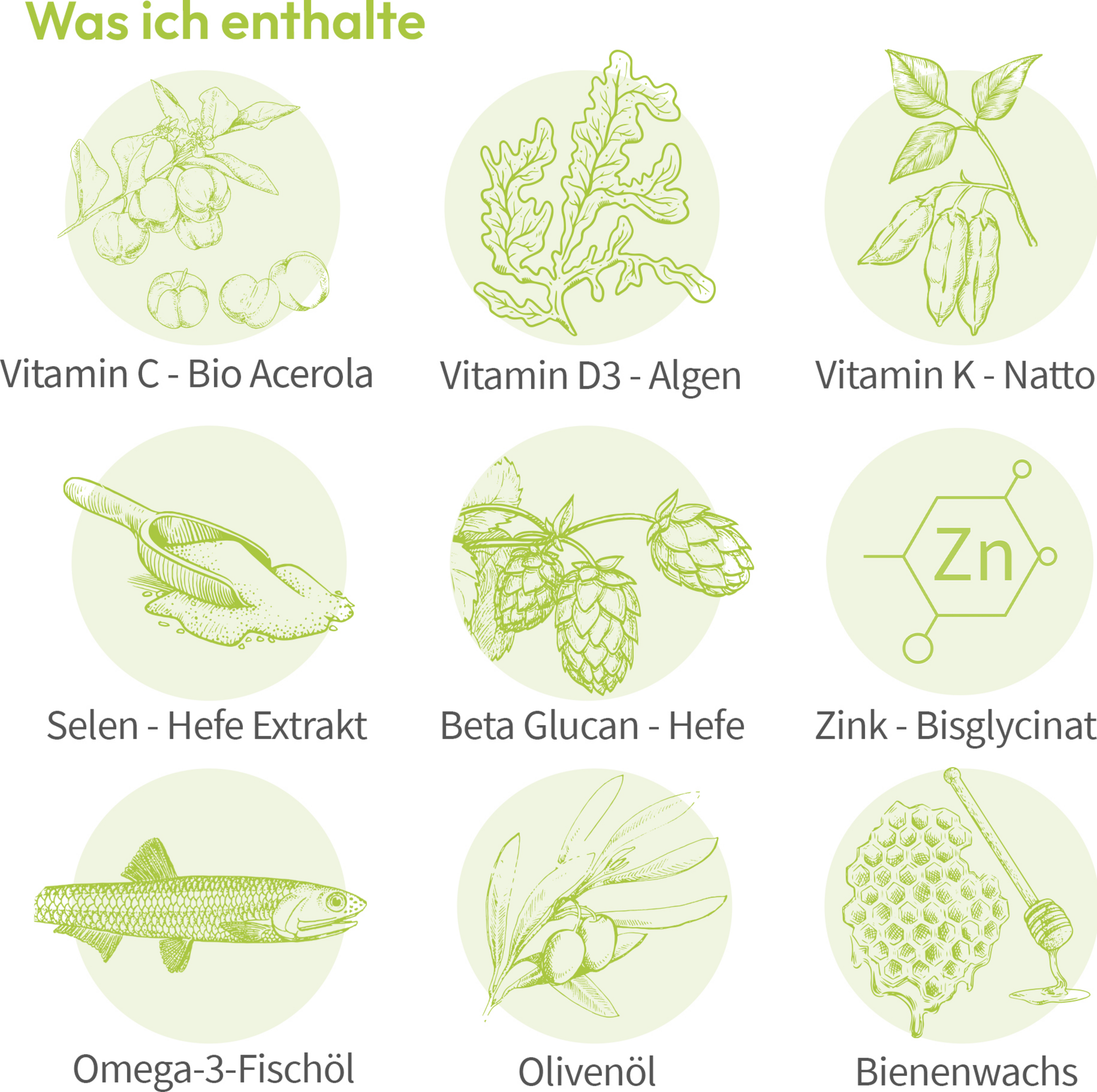 Fischöl; Olivenöl; Acerola-Extrakt (Vitamin C); Hefe-Extrakt (Beta-Glucan); Bienenwachs; Zink; Bisglycinat; Wasser; fermentiertes Natto (Vitamin K2); Algen-Extrakt (Vitamin D3) Kapselhülle: Fischgelantine (Überzugsmittel); Glycerin (Feuchthaltemittel)