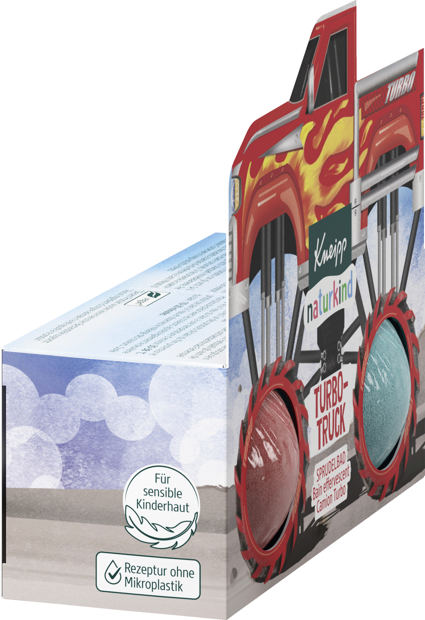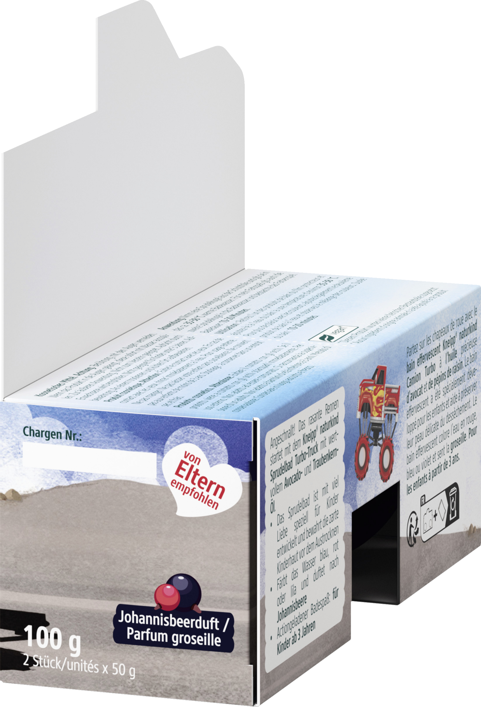 Angeschnallt! Das rasante Rennen startet mit dem Kneipp® naturkind Sprudelbad Turbo-Truck mit wertvollem Avocado- und Traubenkern-Öl. Das Sprudelbad ist mit viel Liebe speziell für Kinder entwickelt und bewahrt die zarte Kinderhaut vor dem Austrocknen. Färbt das Wasser blau, rot oder lila und duftet nach Johannisbeere. Actiongeladener Badespaß: für Kinder ab 3 Jahren.