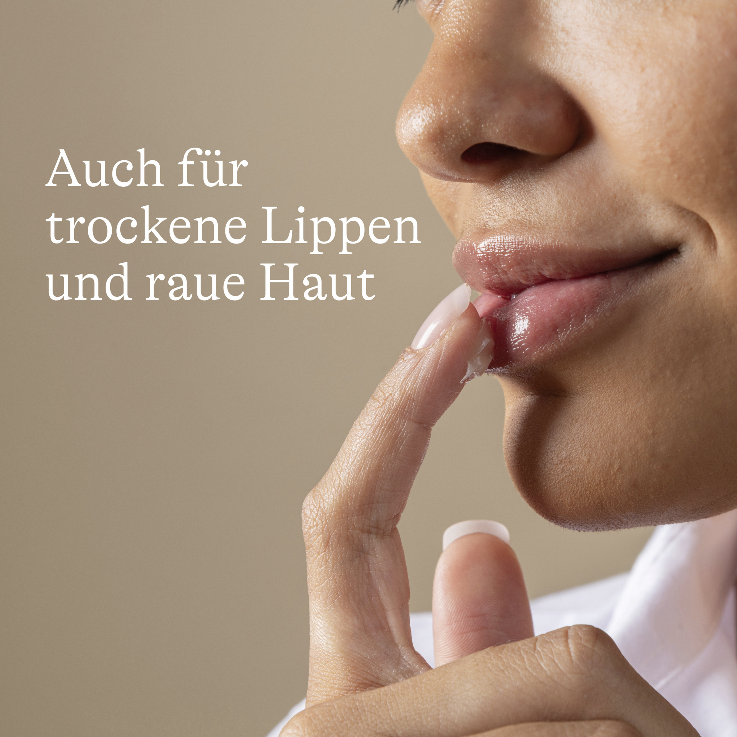 Erwärme eine erbsengroße Menge zwischen den Fingern und trage sie behutsam auf die Haut auf. Auch bei trockener, rauer Haut und für den Babypo geeignet.