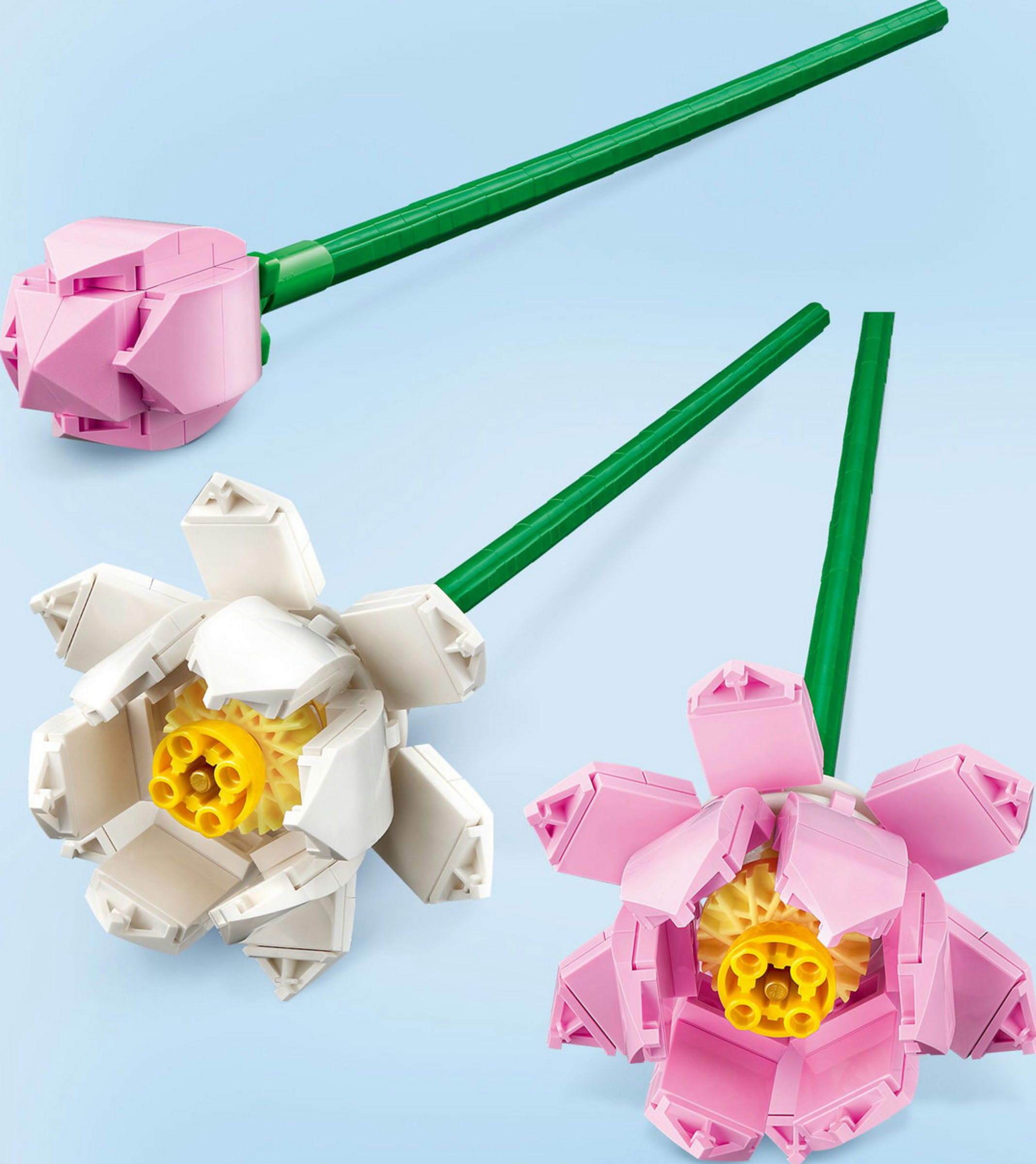 Das LEGO Set für Mädchen und Jungen enthält 2 Lotusblumen in voller Blüte sowie einen knospenden Blütenkopf. Die künstlichen Blumen sind in zarten Rosa- und Weißtönen und mit langen grünen Stängeln dargestellt, deren Länge angepasst werden kann, um sie in jeder Vase ausstellen zu können.