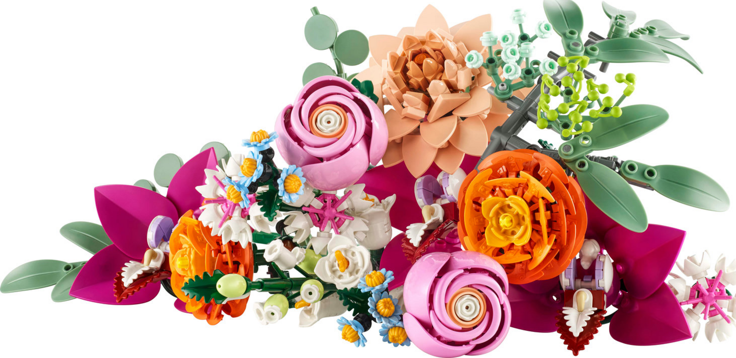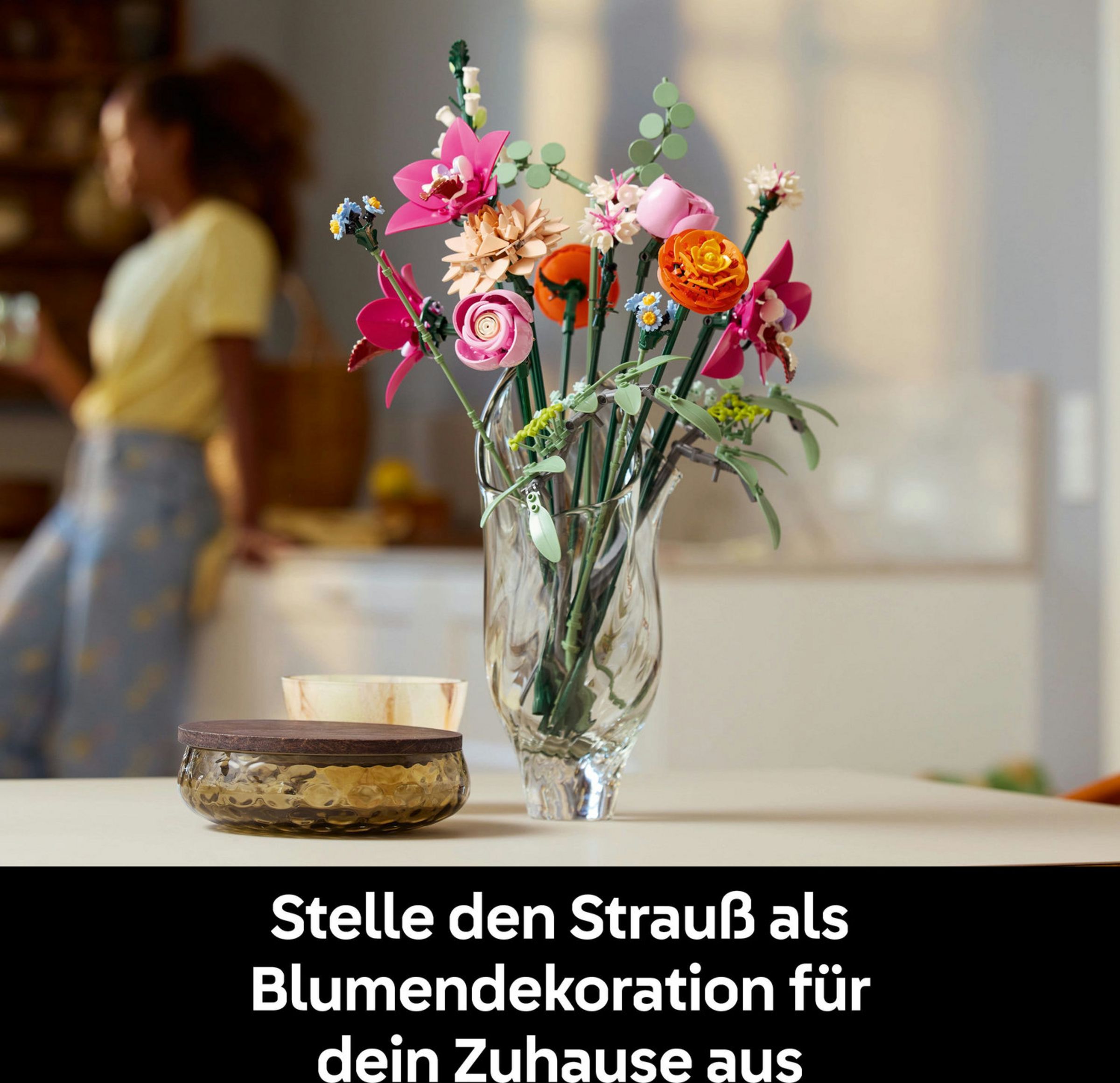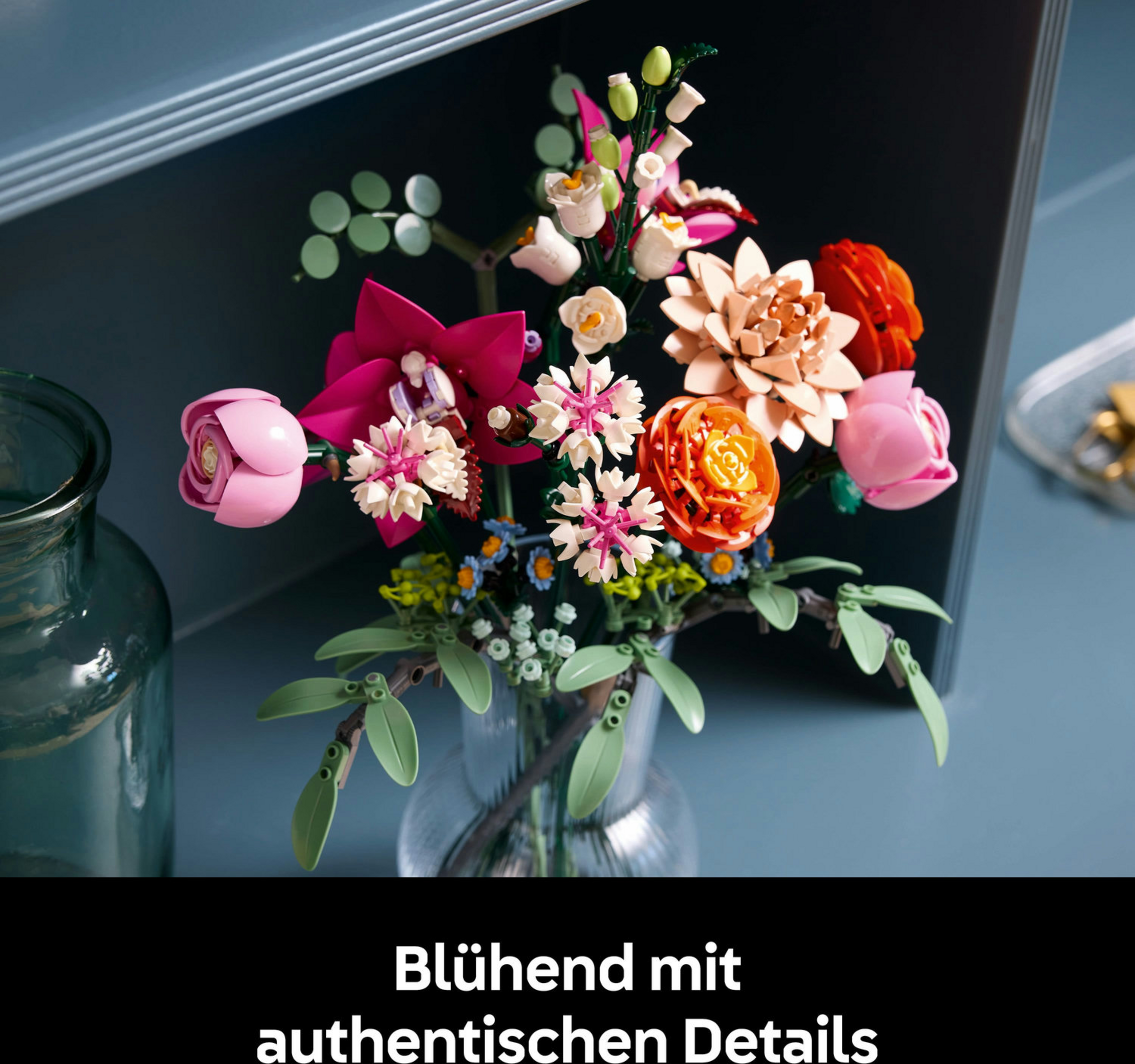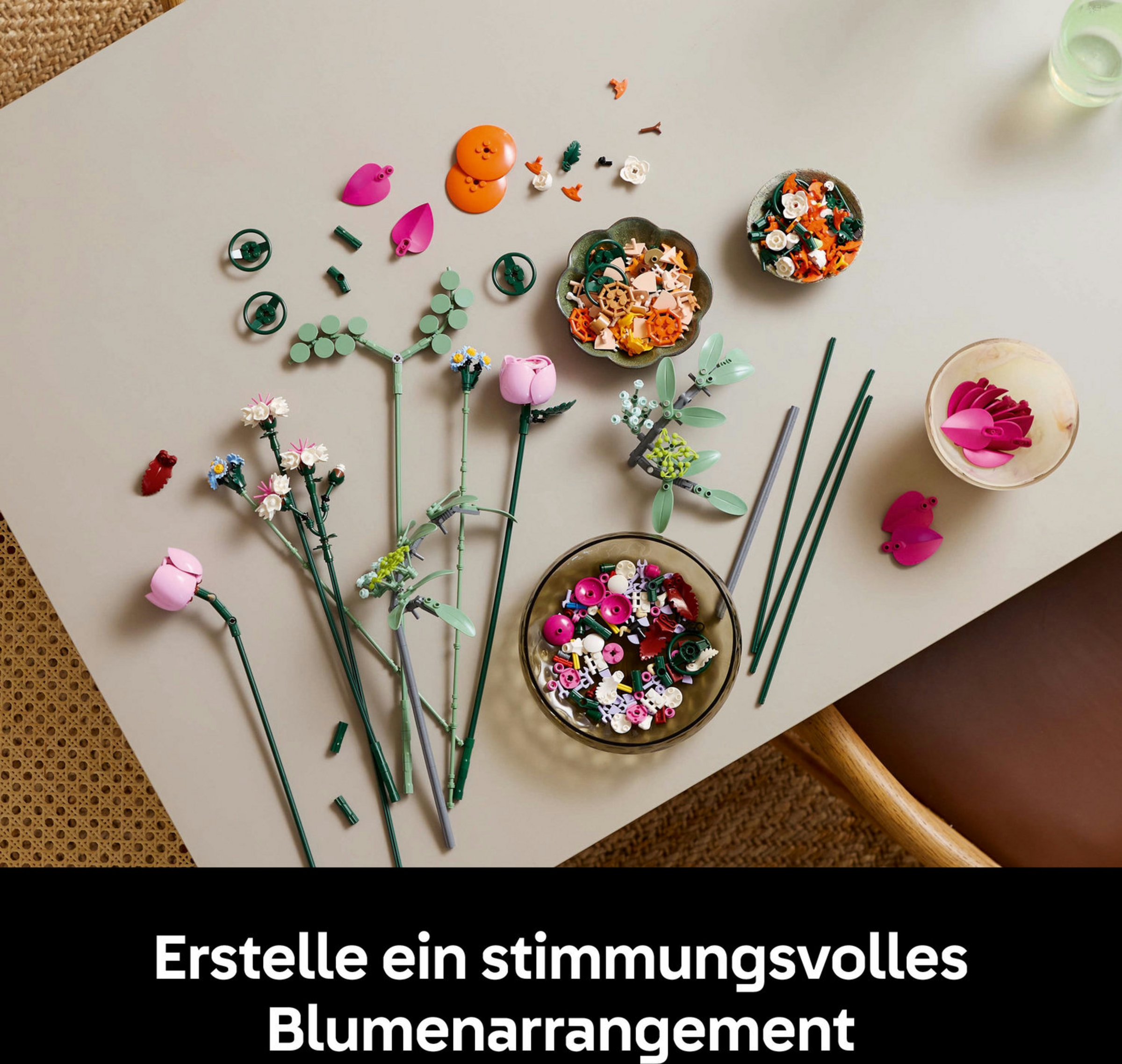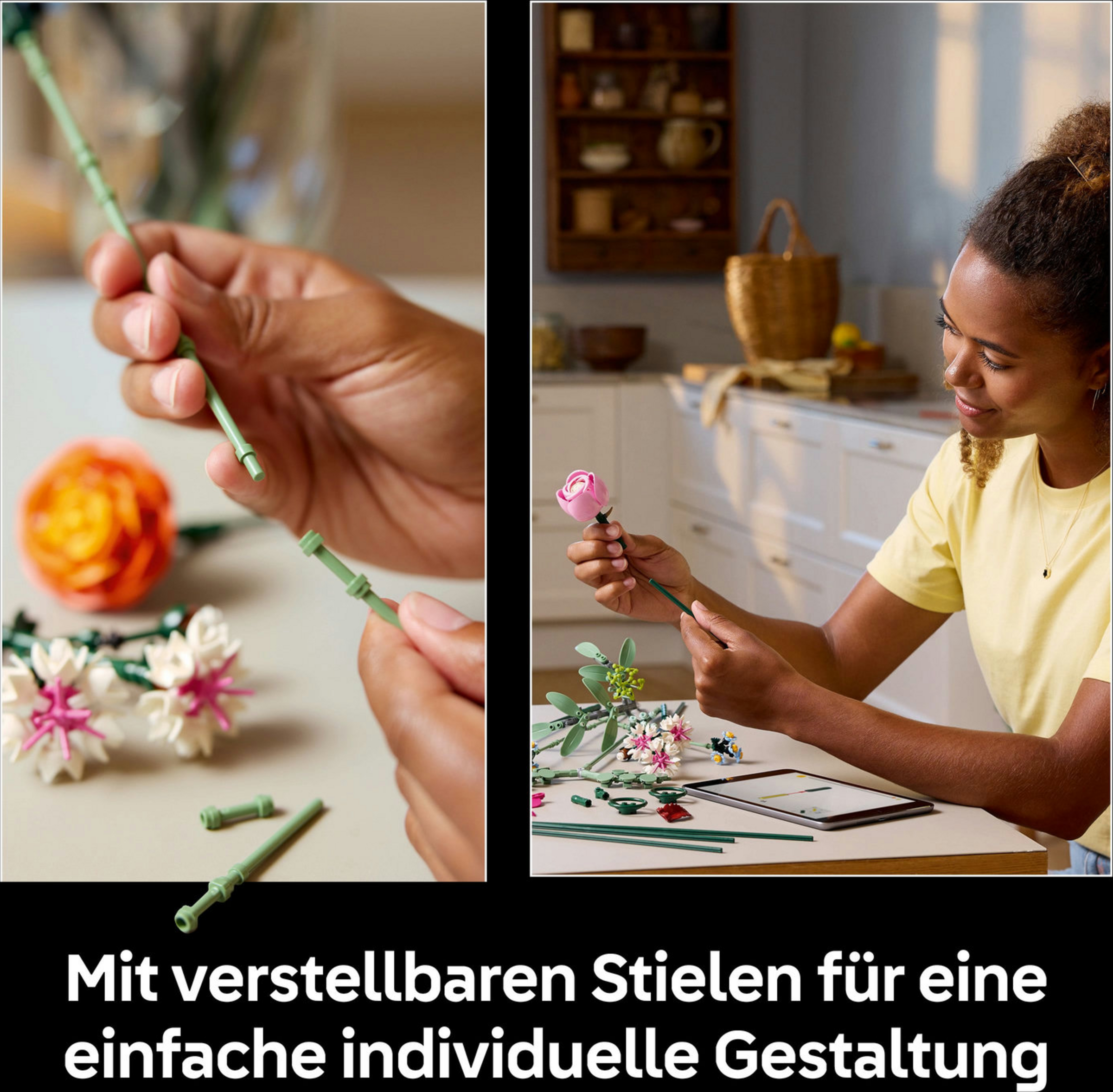 Aufstrebende Floristen können beim Bauen des Blumenstraußes wunderbar abschalten und 15 LEGO Blumen erschaffen, darunter auch Gänseblümchen, Kornblumen, Eukalyptus, Holunderblüten, Rosen, Butterblumen, Cymbidium-Orchideen, eine Seerosen-Dahlie und eine Glockenblume. Alle Stiele der Kunstblumen kann man verstellen, damit die Baumeister einen maßgeschneiderten Blumenstrauß zusammenstecken und ins Wohnzimmer oder Büro als Bürodekoration stellen können. Darüber hinaus kann man die Kunstblumen auch mit anderen separat erhältlichen LEGO Blumensträußen der Botanik Kollektion zu größeren Arrangements kombinieren.