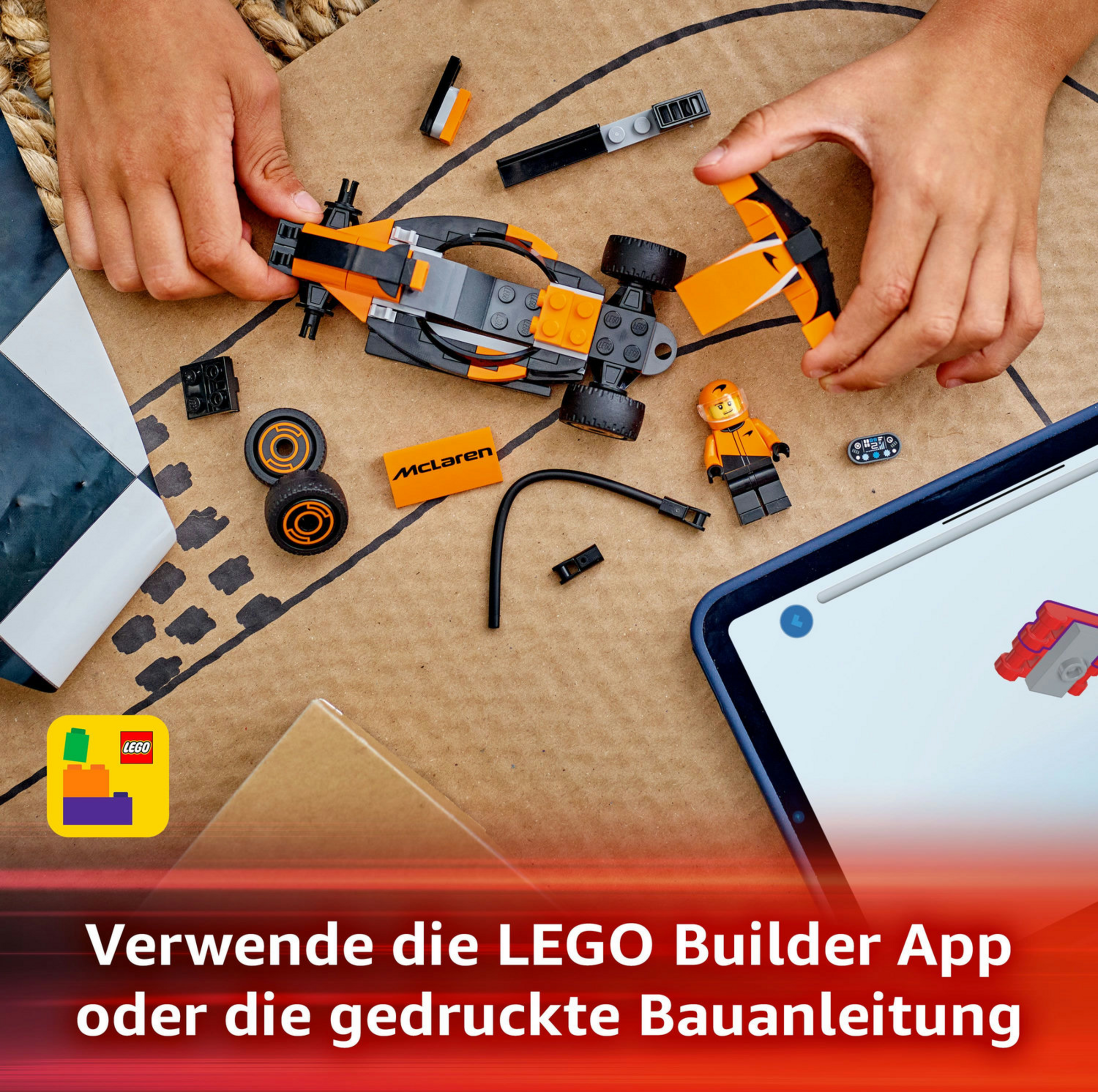 Zu diesem LEGO Formel 1 Modellauto ist neben der beiliegenden Schritt-für-Schritt-Bauanleitung auch eine digitale Anleitung in der LEGO Builder App verfügbar. In der App können Kinder 3D-Ansichten des Bauspielzeugs vergrößern und drehen, beim Bauen ihren Baufortschritt verfolgen oder andere Spielsets erkunden und speichern.