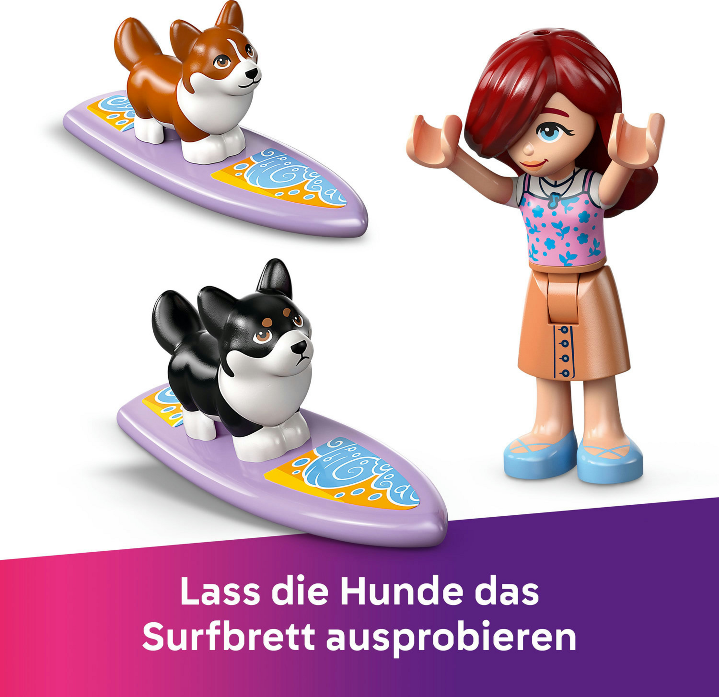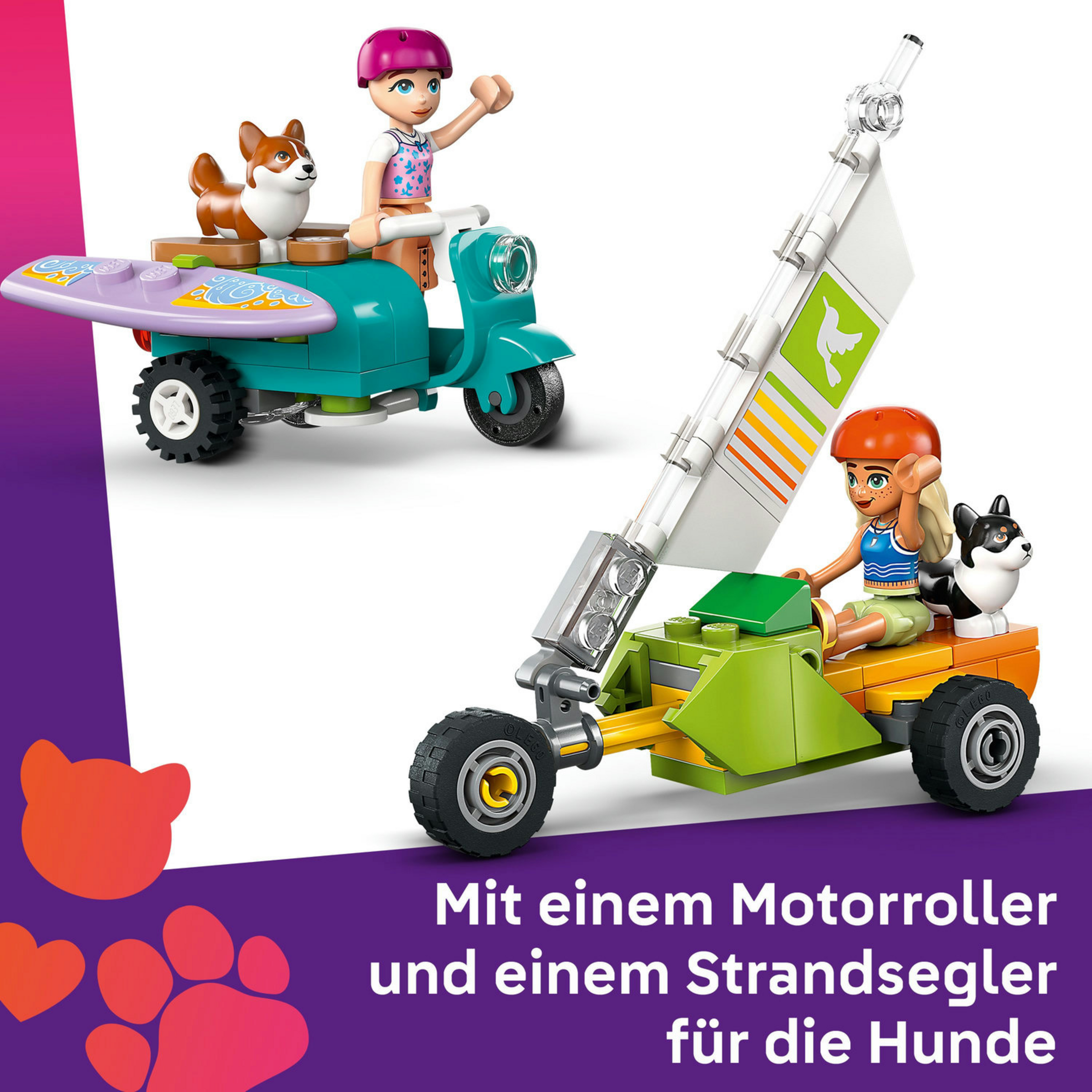 LEGO Friends Strandabenteuer mit Hunden (42641) ist ein Bauspielzeug für Rollenspiele, mit dem Mädchen, Jungen und kleine Tierfreunde ab 6 Jahren viele eigene Strandabenteuer darstellen können. Das Set beinhaltet ein Mini-Surfbrett, einen Motorroller, einen Strandsegler und Liegestühle. Außerdem laden die 2 LEGO Friends Mini Puppen Sage und Paisley und 2 Corgi Tierfiguren zu kreativen Geschichten ein. Das Set ist eine tolle Geschenkidee für Kinder, die gern fantasievoll spielen.