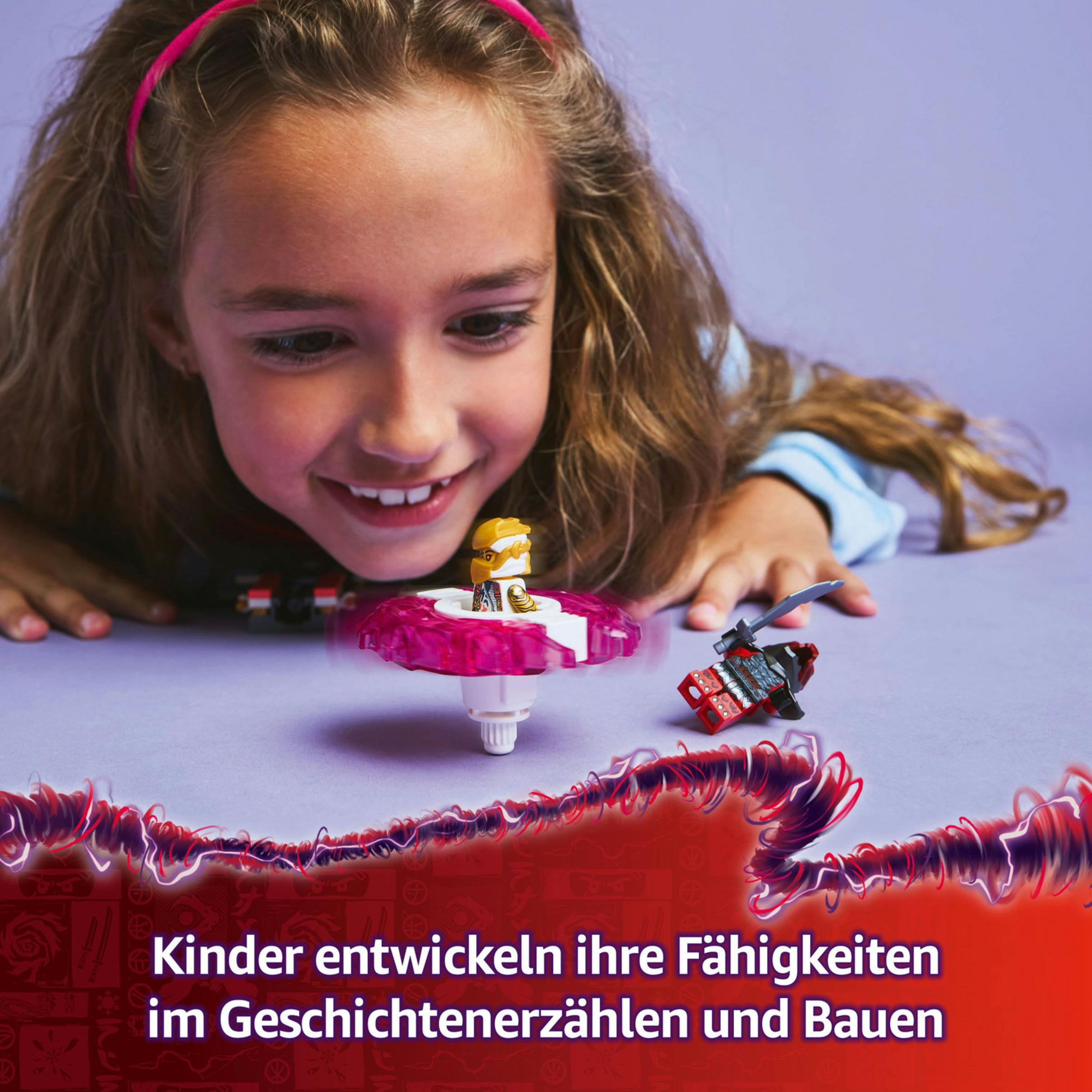 Das LEGO Bauspielzeug beinhaltet das Modell einer kleinen Drachenkreatur und 2 Minifiguren. Sora trägt ein Schwert und sitzt im Drachen-Spinjitzu-Spinner. Der böse Drachenkämpfer schwingt dagegen sein eigenes Schwert. Diese beliebten NINJAGO Figuren laden Kinder zu vielen actionreichen Rollenspielen und spannenden Duellen zwischen Gut und Böse ein.