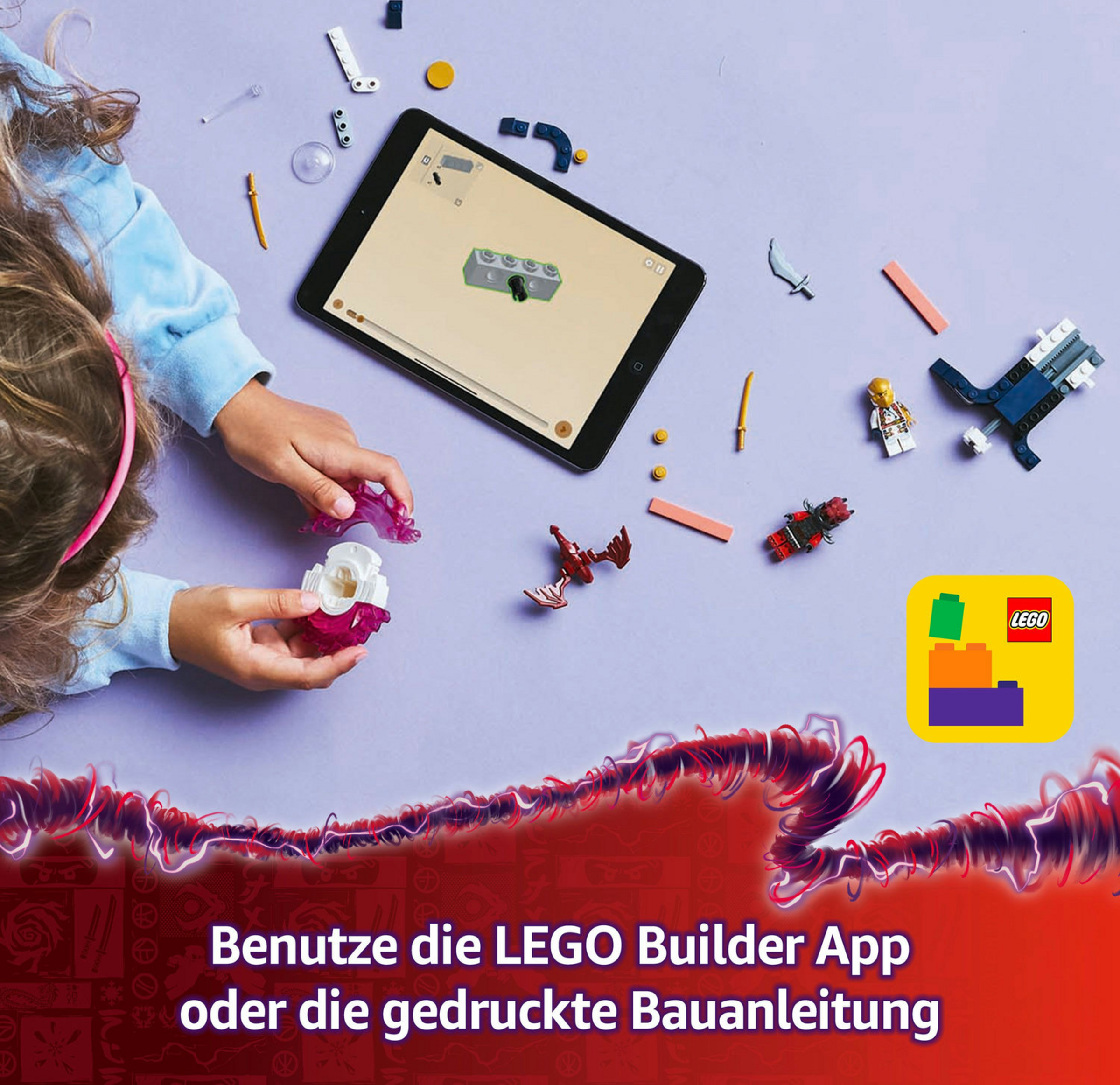 In den anderen LEGO NINJAGO Bau- und Spielsets für Kinder finden junge Ninja-Fans Mechs, Drachen und Tempel für weitere spannende Actionrollenspiele und Geschichten mit ihren Helden. Jedes dieser Ninja Spielzeuge kann auch mithilfe der LEGO Builder App gebaut werden, die dich und dein Kind auf ein ebenso einfaches wie intuitives Bauabenteuer mitnimmt.