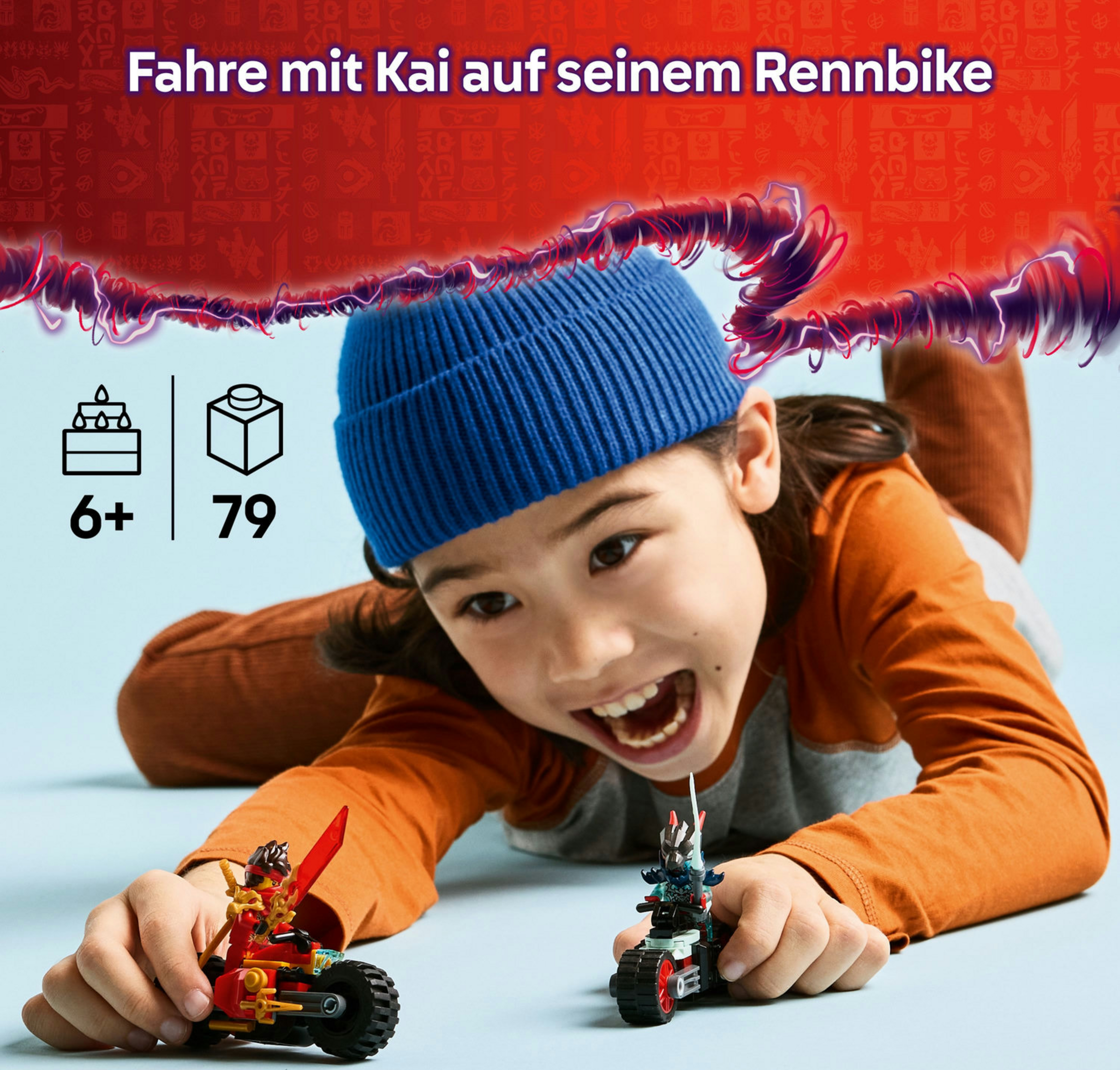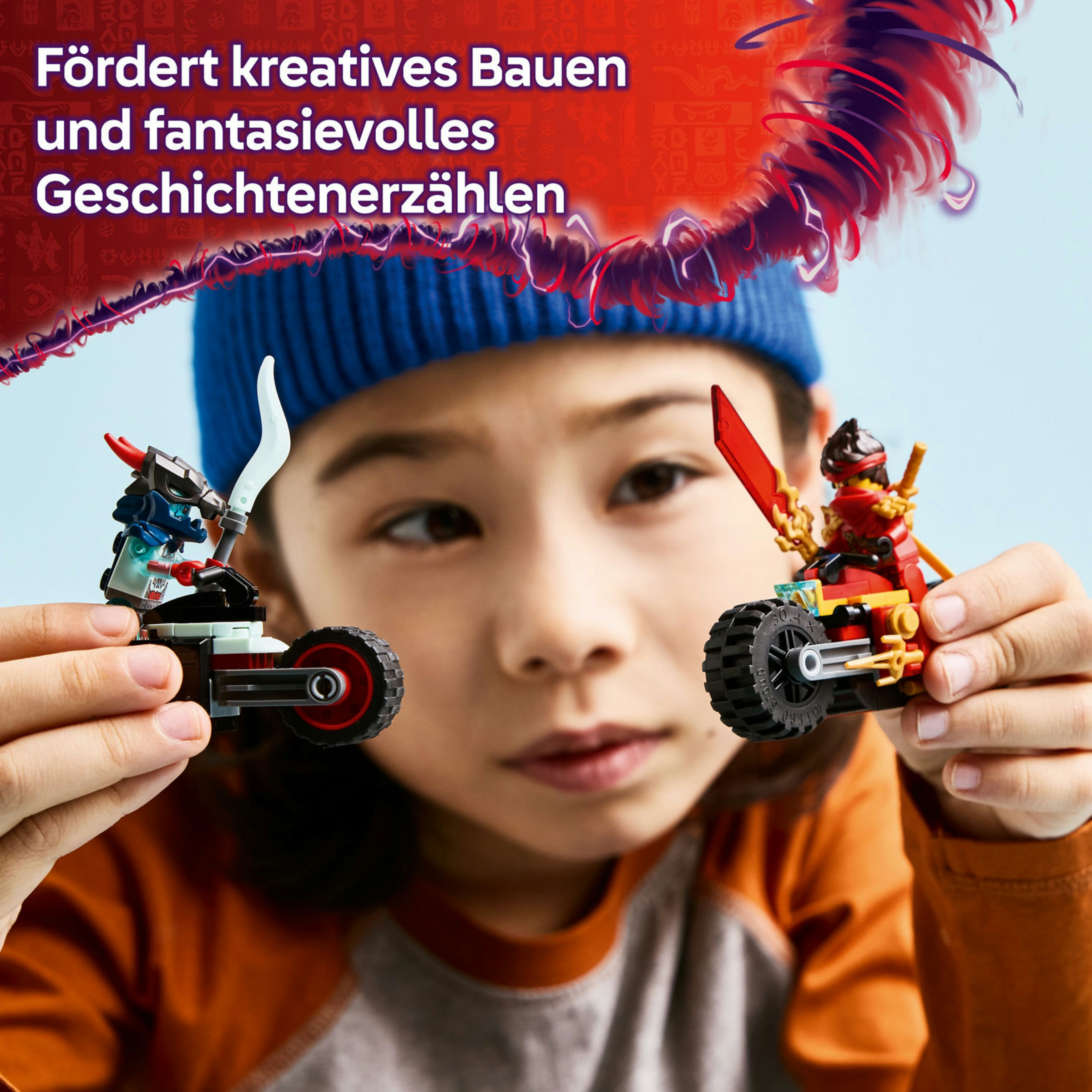 Das Spielset beinhaltet 2 NINJAGO Minifiguren, die die beiden Bikes fahren: Kai trägt eine durchscheinende Enthüllungsklinge und 2 goldene Katanas, und der Geisterdrachenmensch schwingt ein Schwert, damit Kinder fantasievoll spielen und auch zusammen mit einem Freund Duelle zwischen Gut und Böse austragen können.