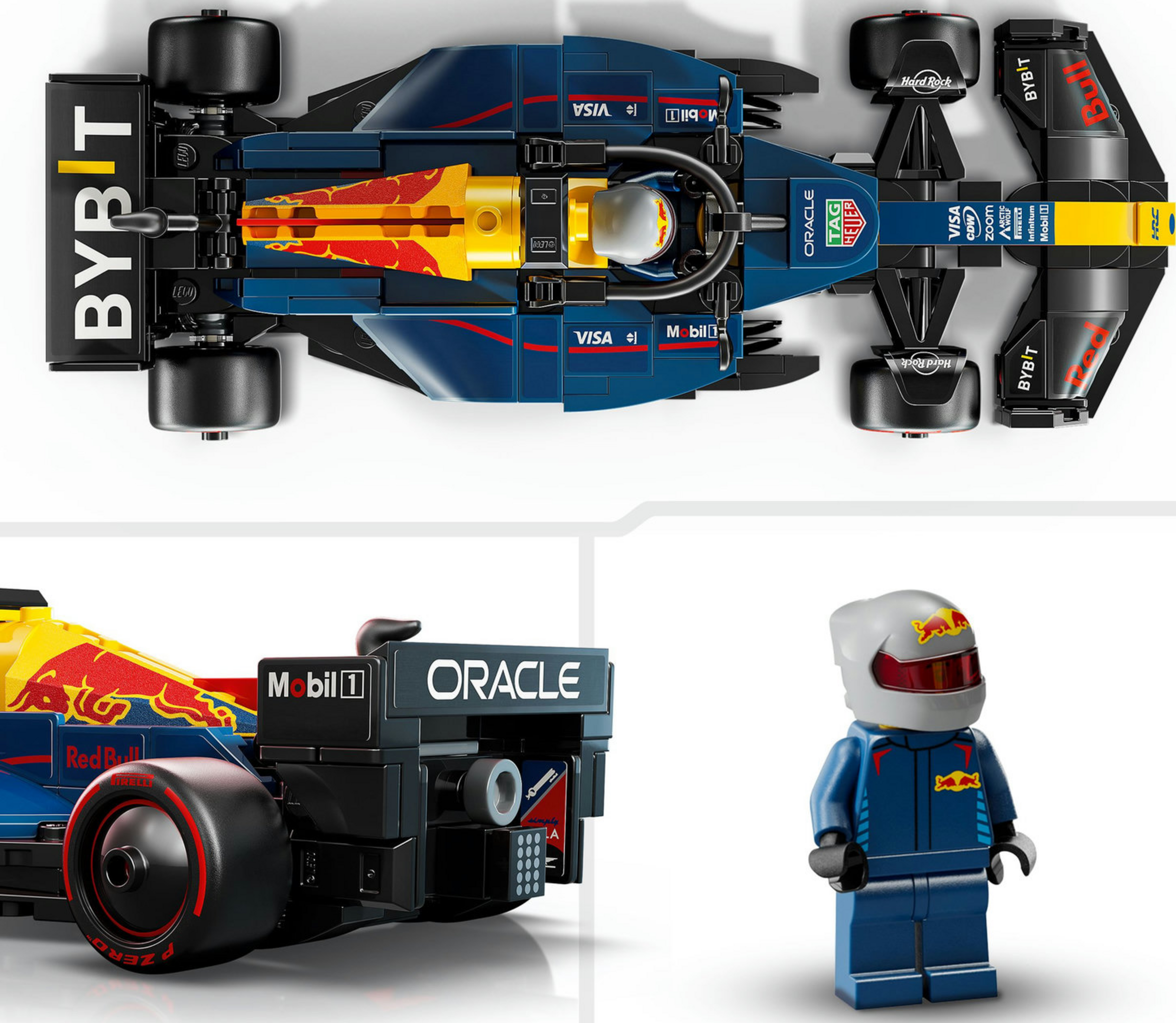Das LEGO Modell des F1-Rennwagens hat ein Cockpit, das sich öffnen lässt, indem man den Halo-Bügel hochklappt, einen Heckflügel, einen Querlenker, Sponsorenaufkleber und breitere Hinterreifen mit dem Aufdruck „Pirelli“. Zu dem Fahrzeug Bauset gehört auch eine Rennfahrer Figur im Red Bull-Rennoverall und mit Helm. Die Minifigur kann für das Rennen ins Cockpit gesetzt werden.