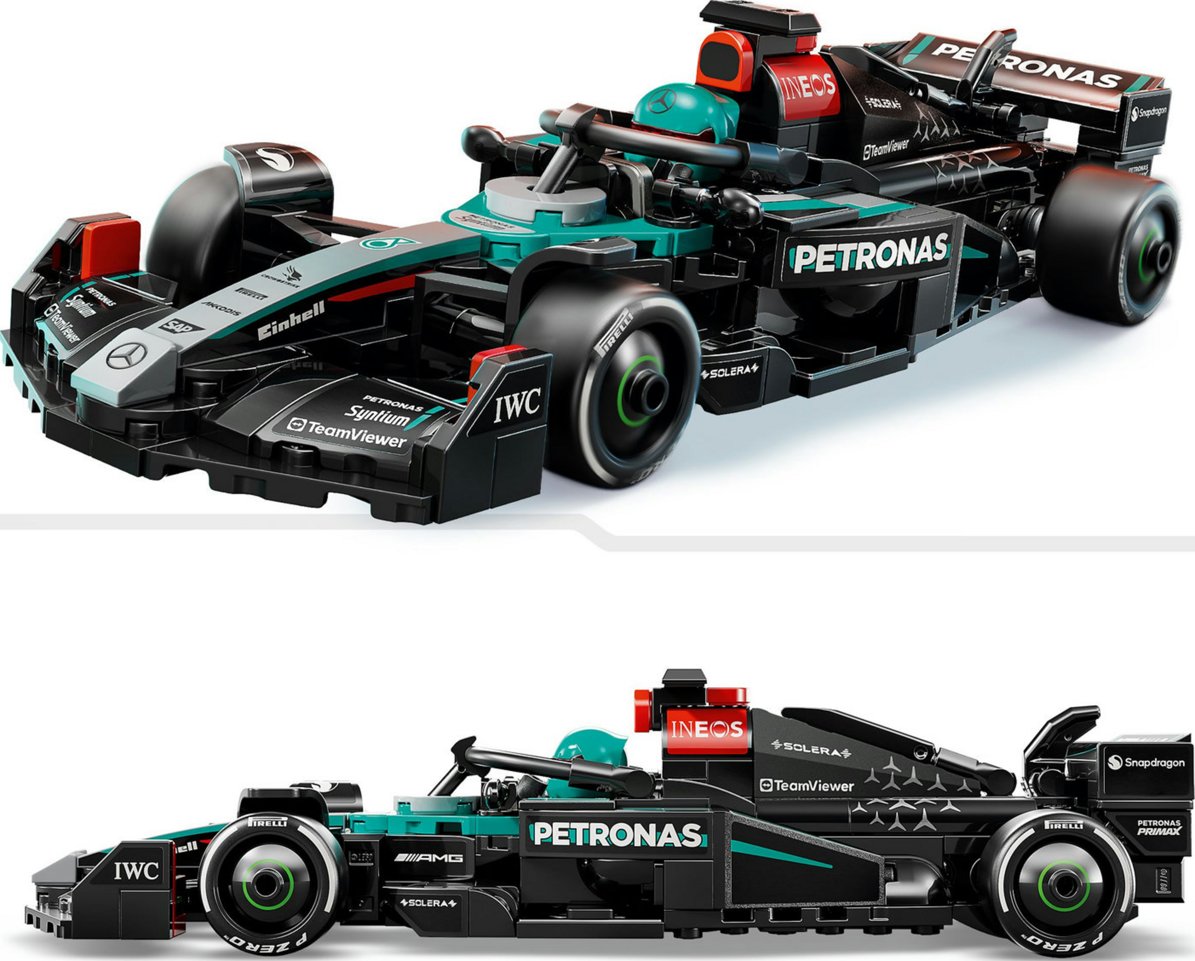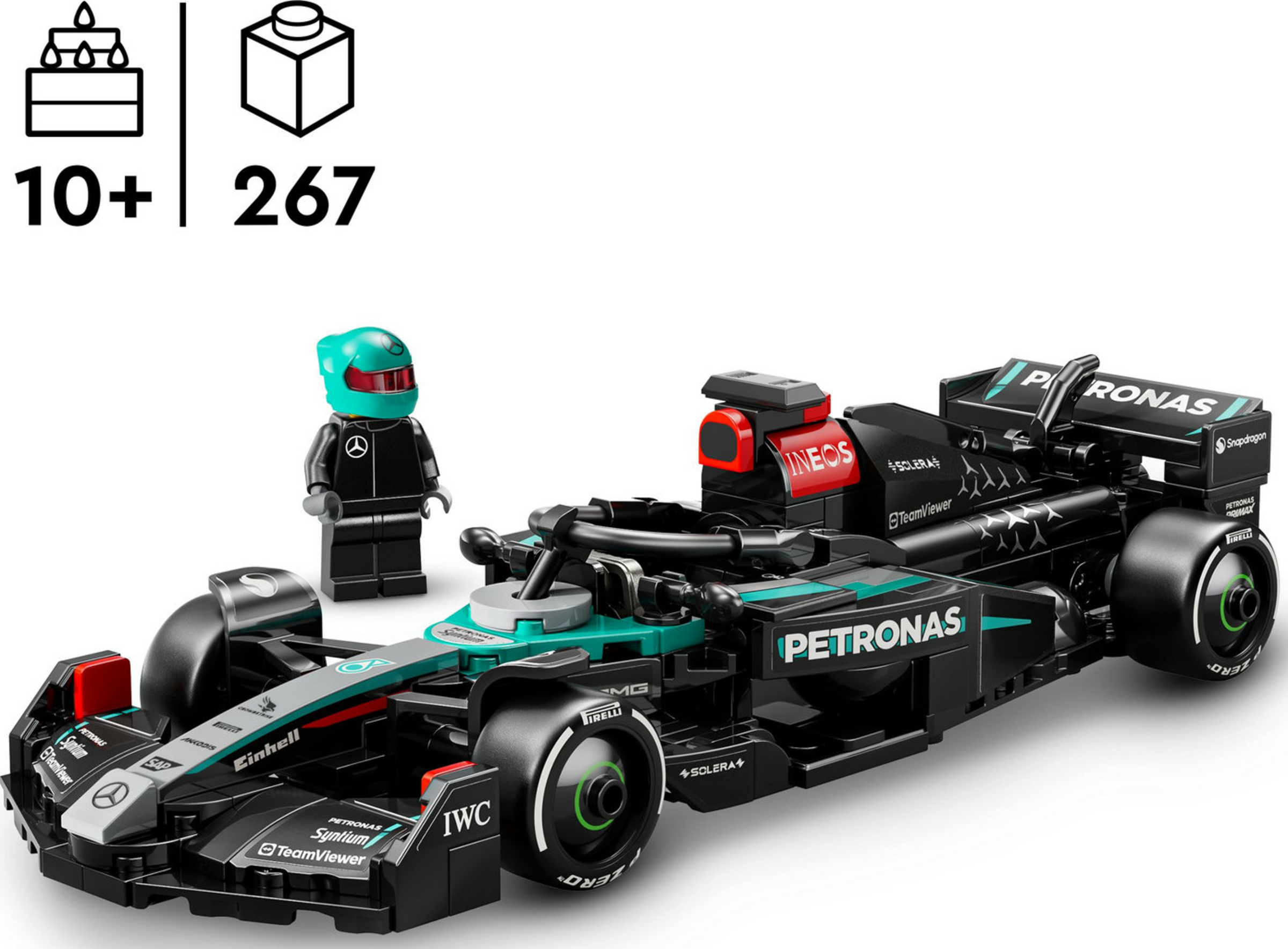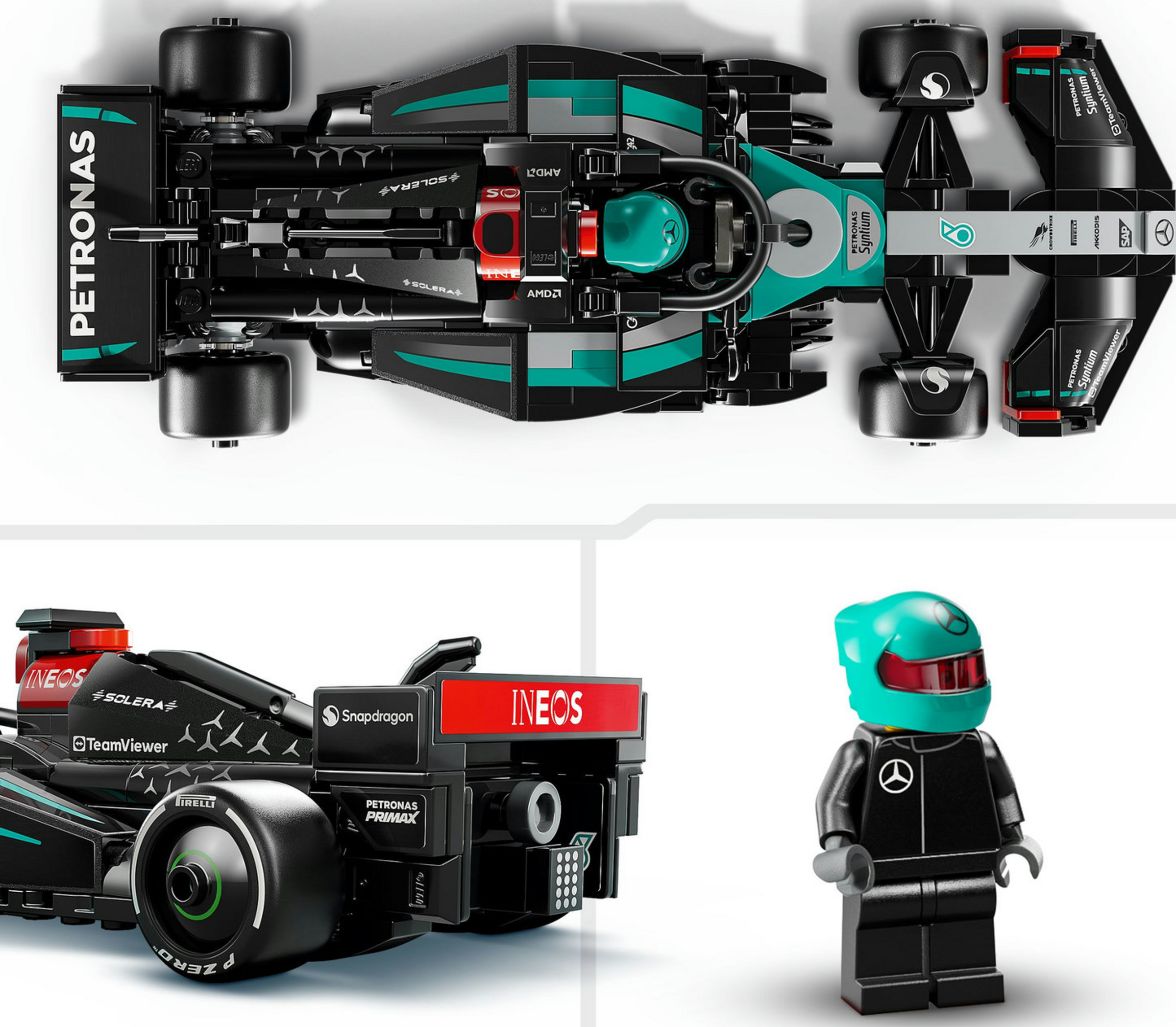 Das Modell des F1-Rennwagens hat ein Cockpit, das sich öffnen lässt, indem man den Halo-Bügel hochklappt, einen Heckflügel, einen Querlenker, Sponsorenaufkleber und breitere Hinterreifen mit dem Aufdruck „Pirelli“. Zu dem baubaren Modellauto gehört eine Minifigur im Rennoverall des F1 Teams. Diese Rennfahrer Figur trägt auch einen Helm und passt ins Cockpit, um spannende Rennen fahren zu können.