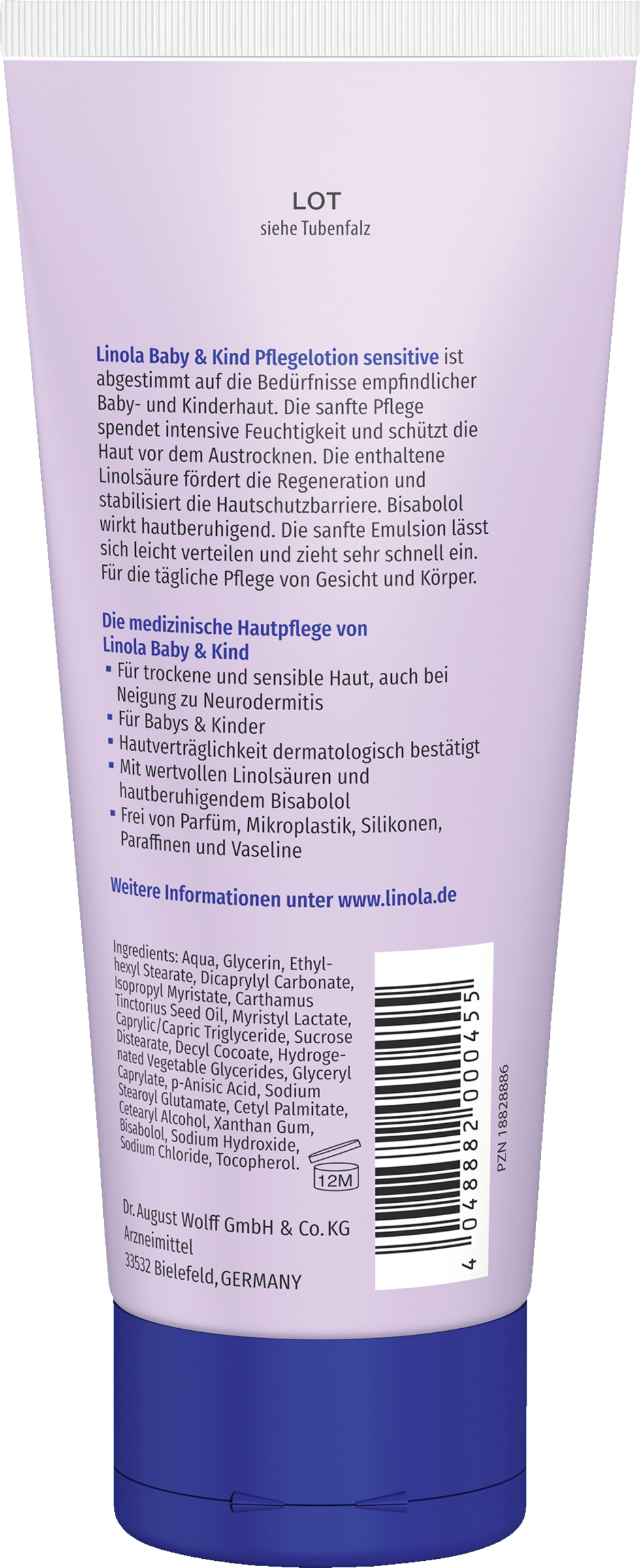 Linola Baby & Kind Pflegelotion sensitive ist abgestimmt auf die Bedürfnisse empfindlicher Baby- und Kinderhaut. Die sanfte Pflege spendet intensive Feuchtigkeit und schützt die Haut vor dem Austrocknen. Die enthaltene Linolsäure fördert die Regeneration und stabilisiert die Hautschutzbarriere. Bisabolol wirkt hautberuhigend. Die sanfte Emulsion lässt sich leicht verteilen und zieht sehr schnell ein. Für die tägliche Pflege von Gesicht und Körper.