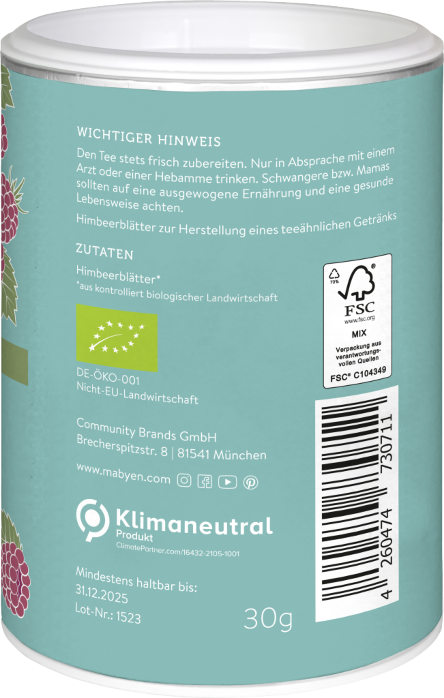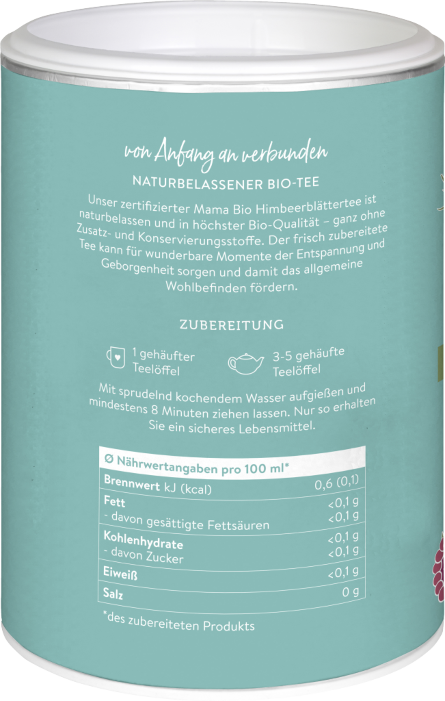 Der zertifizierte Mama Bio Himbeerblättertee ist naturbelassen und in höchster Bio-Qualität - ganz ohne Zusatz- und Konservierungsstoffe. Der frisch zubereitete Tee kann für wunderbare Momente der Entspannung und Geborgenheit sorgen und damit das allgemeine Wohlbefinden fördern.