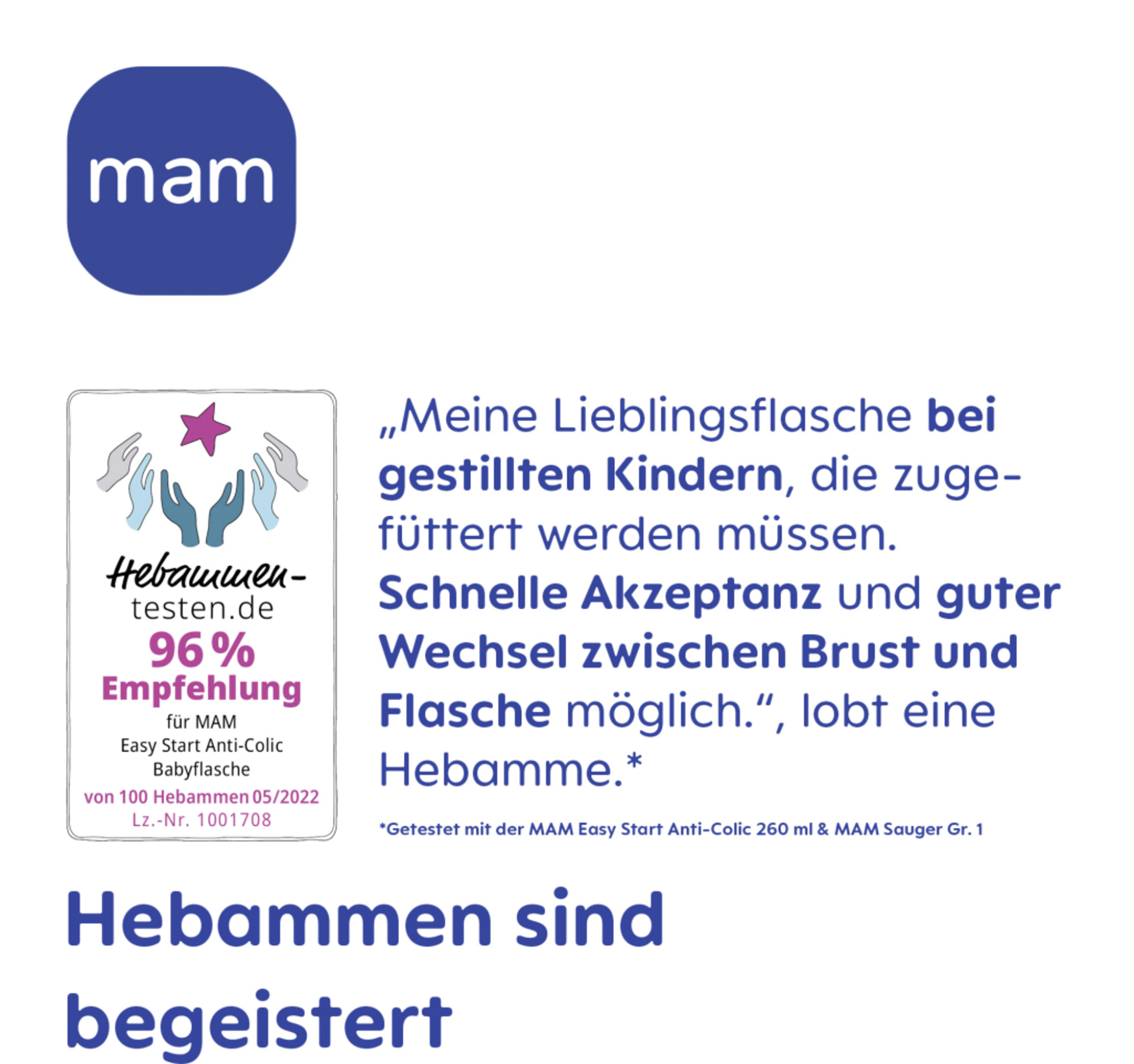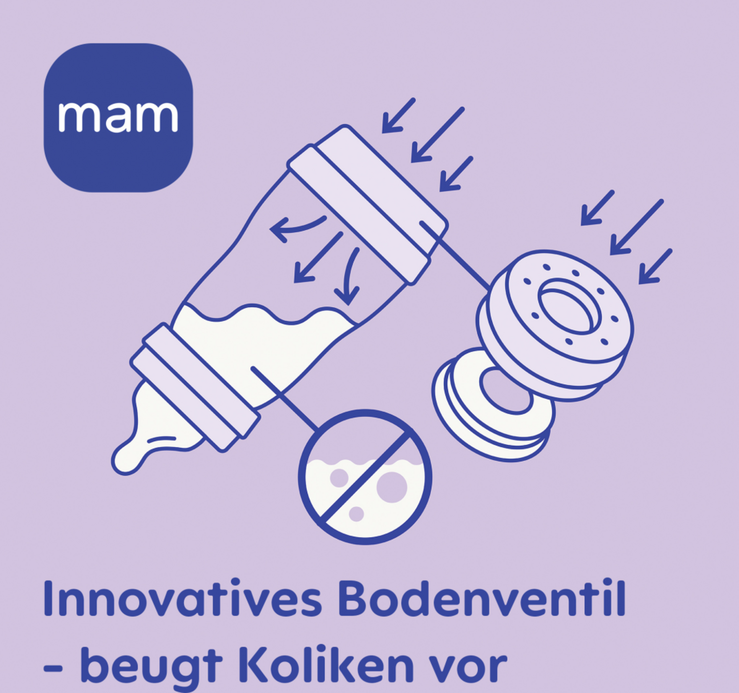 Weitere wichtige Informationen: Die Flasche besteht aus Polypropylen, einem hygienischen, leicht zu reinigenden und relativ weichen Material. Die Flasche sollte nicht zu stark gedrückt werden, da dies die Funktion beeinträchtigen kann. Versuchen Sie nicht, mit einer Nadel oder scharfen Gegenständen die Öffnung des Saugers zu vergrößern. Babys nicht unbeaufsichtigt trinken lassen. Flasche immer in trockenem Zustand aufbewahren. Sauger und Ventile in einem trockenen, verschlossenen Behälter aufbewahren. Zum Einfrieren von Muttermilch bitte die MAM Aufbewahrungsbecher verwenden. Nur MAM Sauger mit den MAM Flaschen verwenden. Nur zuckerfreie Nahrung oder Flüssigkeiten verwenden. Um Verletzungen zu vermeiden, das Baby nicht mit der Flasche herumlaufen lassen. Das Baby NIEMALS mit der Flasche schlafen legen. Länger anhaltender Kontakt mit Flüssigkeiten kann Karies verursachen. Der Flaschensauger ist mit allen MAM Flaschen und dem Trainer+ kompatibel. Bitte bewahren Sie die Hinweise gut auf.