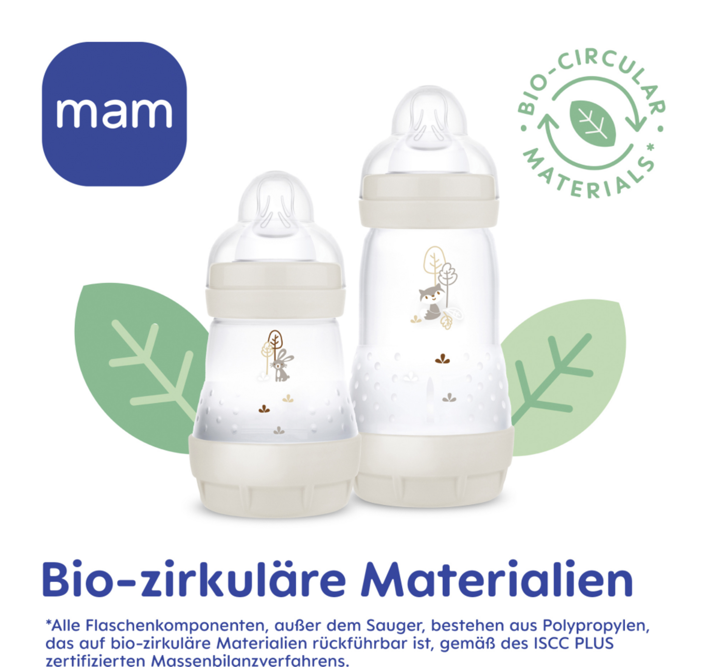 ³alle Flaschenkomponenten, außer dem Sauger, bestehen aus Polypropylen, das auf bio-zirkuläre Materialien rückführbar ist, gemäß des ISCC PLUS zertifizierten Massenbilanzverfahrens.