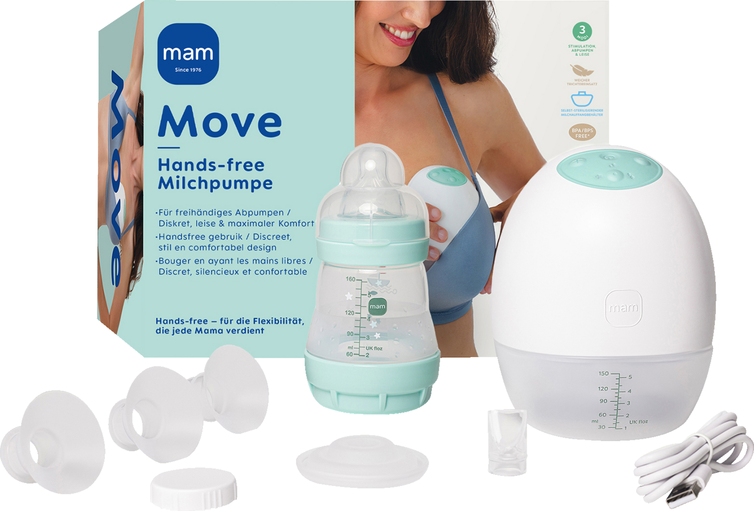 Die MAM Move Hands-free Milchpumpe ist eine im BH tragbare Milchpumpe, die ein freihändiges Abpumpen jederzeit und überall ermöglicht. Ohne Schläuche oder Kabel macht die MAM Move das Abpumpen deiner Muttermilch so frei, komfortabel und flexibel wie möglich.