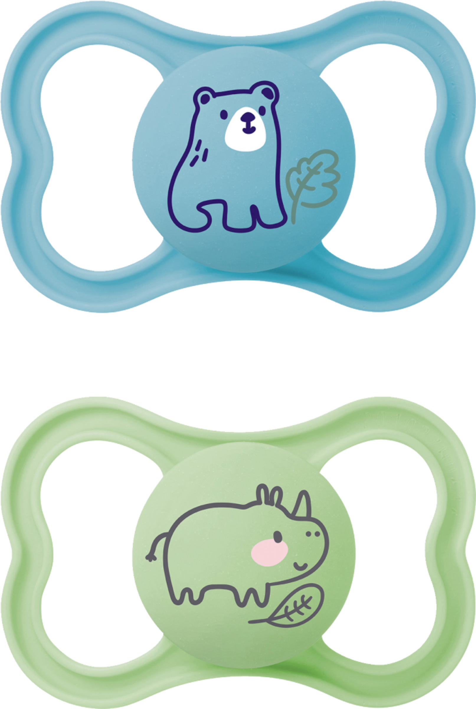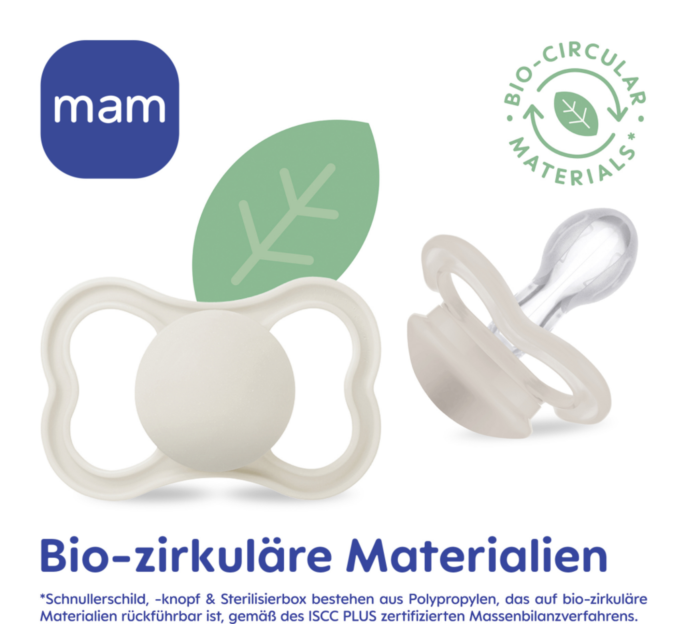 MAM Air 6-16 Silikon Schnuller im 2er-Set – durch innovatives Design extra sanft zu Babys Haut & hohe Sauger-Akzeptanz, Babyhaut ist besonders sensibel und kann leicht gereizt werden. Mit dem MAM Air Silikon Schnuller im 2er-Set wird durch ein innovatives Design besonders viel Wert auf die Vermeidung von Irritationen gelegt. Das Schild besitzt besonders großzügige Belüftungslöcher, um extra viel Luft an Babys Haut zu lassen. Das abgerundete Schild beugt zudem Abdrücken und Hautreizungen vor. Der Sauger besteht aus speziellem SkinSoft Silikon, das sich besonders weich und vertraut anfühlt und so von 94 % der Kinder instinktiv akzeptiert wird.¹ MAM Schnuller werden gemeinsam mit Zahnmediziner*innen entwickelt und sind dank ihres symmetrischen, flachen Saugteils besonders zahn- und kieferfreundlich. Zusammen mit dem symmetrisch geformten Schnullerschild liegt der Schnuller immer richtig herum in Babys Mund. Das Schild ist besonders sanft zu Babys empfindlicher Haut dank großzügiger Luftlöcher und der abgerundeten Form. Der Schnullerknopf ist für kleine Babyhände einfach zu greifen, aber gleichzeitig so flach, dass der Schnuller für Babys in jeder Lage bequem ist. Der MAM Air ist ein klimaneutraler MAM Schnuller. Schild und Knopf bestehen aus nachhaltigen, bio-erneuerbaren Materialien, um einen möglichst geringen CO₂-Fußabdruck zu erzeugen. Der Rest wird durch MAM in Zusammenarbeit mit Climate Partner kompensiert.² Die Schnuller werden in einer praktischen Sterilisier- und Transportbox geliefert. In der Box kann der Babyschnuller einfach und schnell, ohne separates Gerät in der Mikrowelle sterilisiert werden. So können Eltern bis zu 77 % Energie und CO₂ einsparen.³