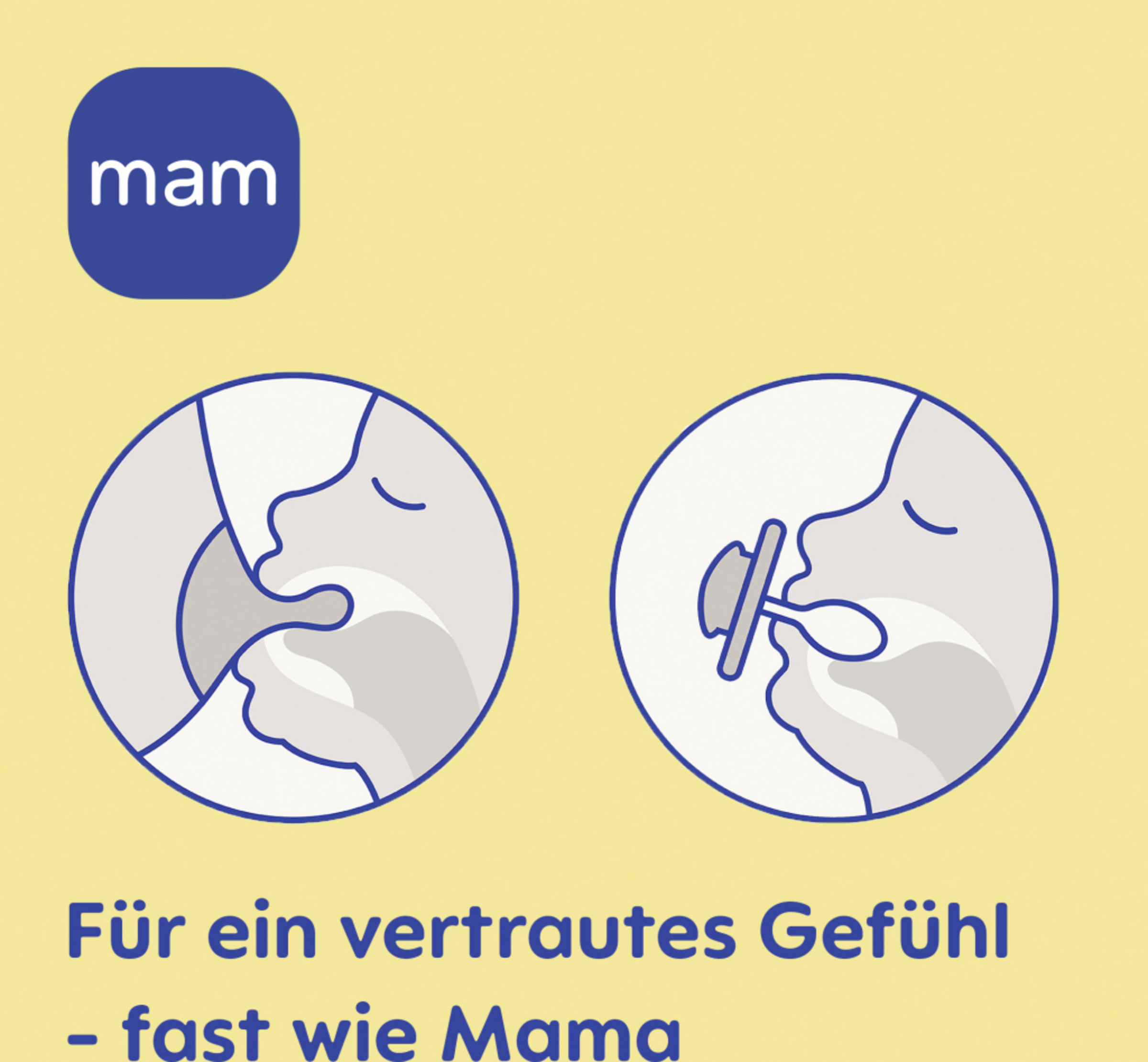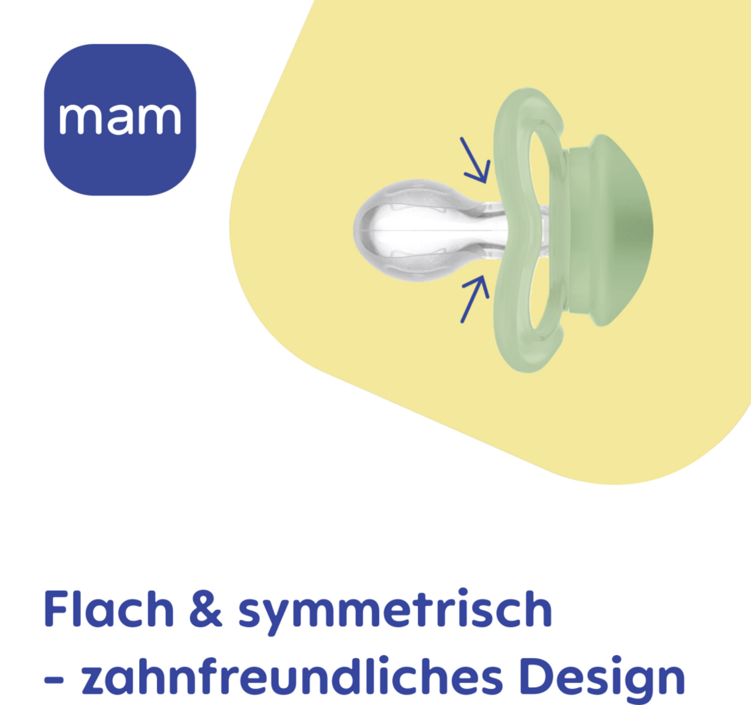 Sterilisationsmethoden: Dampfsterilisation (elektrisch oder in der Mikrowelle), in einer Sterilisationslösung (beides je nach Anweisungen des Herstellers) oder Abkochen (mindestens 5 Minuten lang). Keine aggressiven Reinigungsmittel verwenden. Den Sauger niemals in süße Lebensmittel oder Medikamente eintauchen. Dies kann Karies verursachen. Den Schnuller alle 1 bis 2 Monate ersetzen, um Sicherheit und Hygiene zu gewährleisten. Es besteht kein Grund zur Besorgnis, wenn der Schnuller im Mund stecken bleibt. Das spezielle Schnullerdesign mit Ventilationslöchern ermöglicht Ihrem Baby, auch in diesem Fall zu atmen. Der Schnuller kann nicht verschluckt werden. Entfernen Sie den Schnuller so vorsichtig wie möglich. MAM empfiehlt eine Entwöhnung vom Schnuller bis zum 3. Lebensjahr.