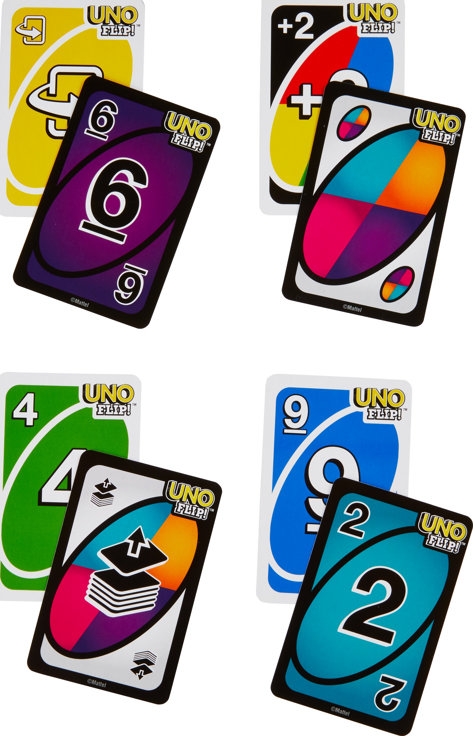 Die neueste Version des klassischen UNO: UNO FLIP! verleiht dem bekannten Kartenspiel einen neuen Twist – mit beidseitig bedruckten Karten und einer speziellen FLIP-Karte. So kommt frischer Wind in das traditionelle Spiel. Die Spieler legen der Reihe nach eine ihrer Handkarten auf den Ablegestapel, sodass sie der dort oben liegenden Karte in Zahl oder Farbe entspricht. Ziel ist es, die Karten auf der Hand so schnell wie möglich abzulegen. Dabei kommen spezielle Karten wie Aussetzen, Retour und Farbenwahl zum Einsatz. UNO FLIP! umfasst auch neue Aktionskarten, die Bewegung ins Spiel bringen, zum Beispiel „Zieh 5“ oder „Alle aussetzen“. Wird die spezielle FLIP-Karte gespielt, dürfen alle Karten auf der Hand des Spielers, dem Ablegestapel und Kartenstapel umgedreht werden. So zeigen sie völlig neue Zahlen und Farben! Der Spieler mit der FLIP-Karte entscheidet, ob die helle oder die dunkle Seite des Decks gespielt wird – und wann dies wieder geändert werden muss.