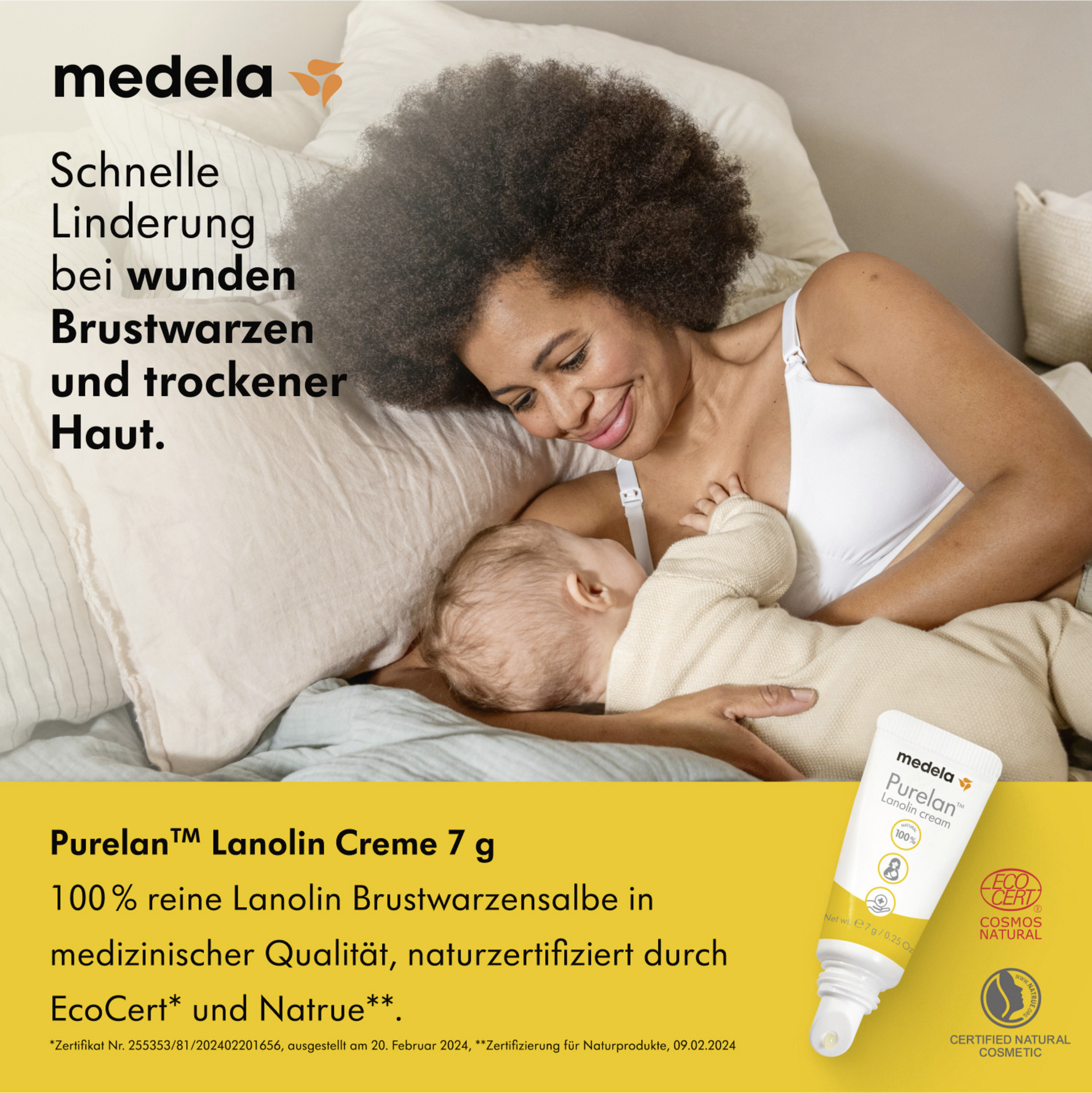 Lanolin ist eine stark feuchtigkeitsspendende, natürlich vorkommende Substanz, die in Schaffell enthalten ist. Das Lanolin in Purelan™ Brustwarzensalbe stammt aus ethisch einwandfreier Herkunft von mulesingfreien Farmen. Es ist hochrein und nach den höchsten Industriestandards (Europäisches Arzneibuch und US Pharmacopoeia) getestet.