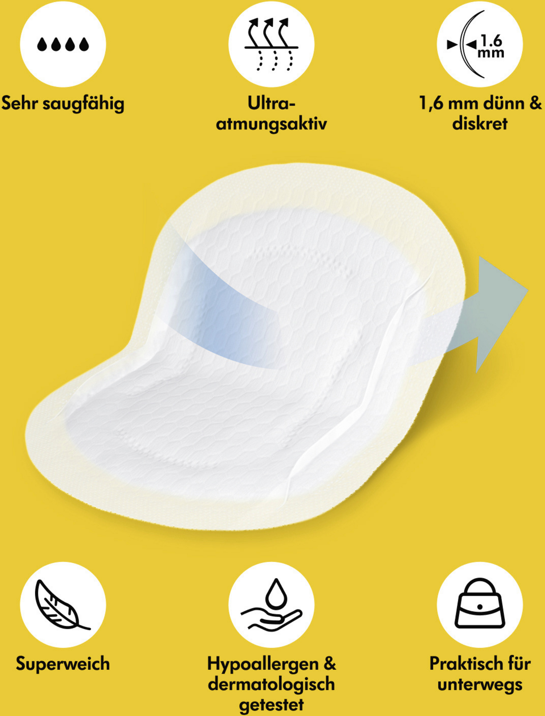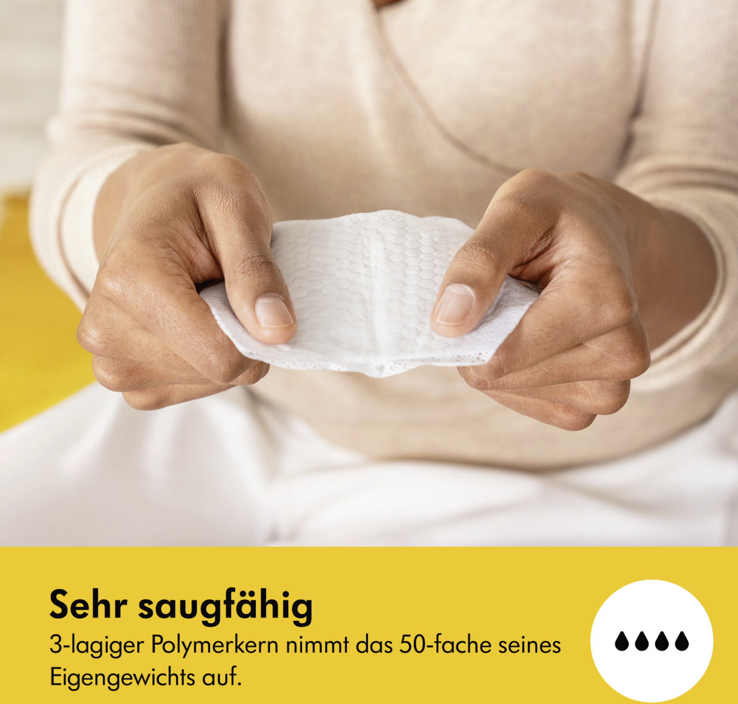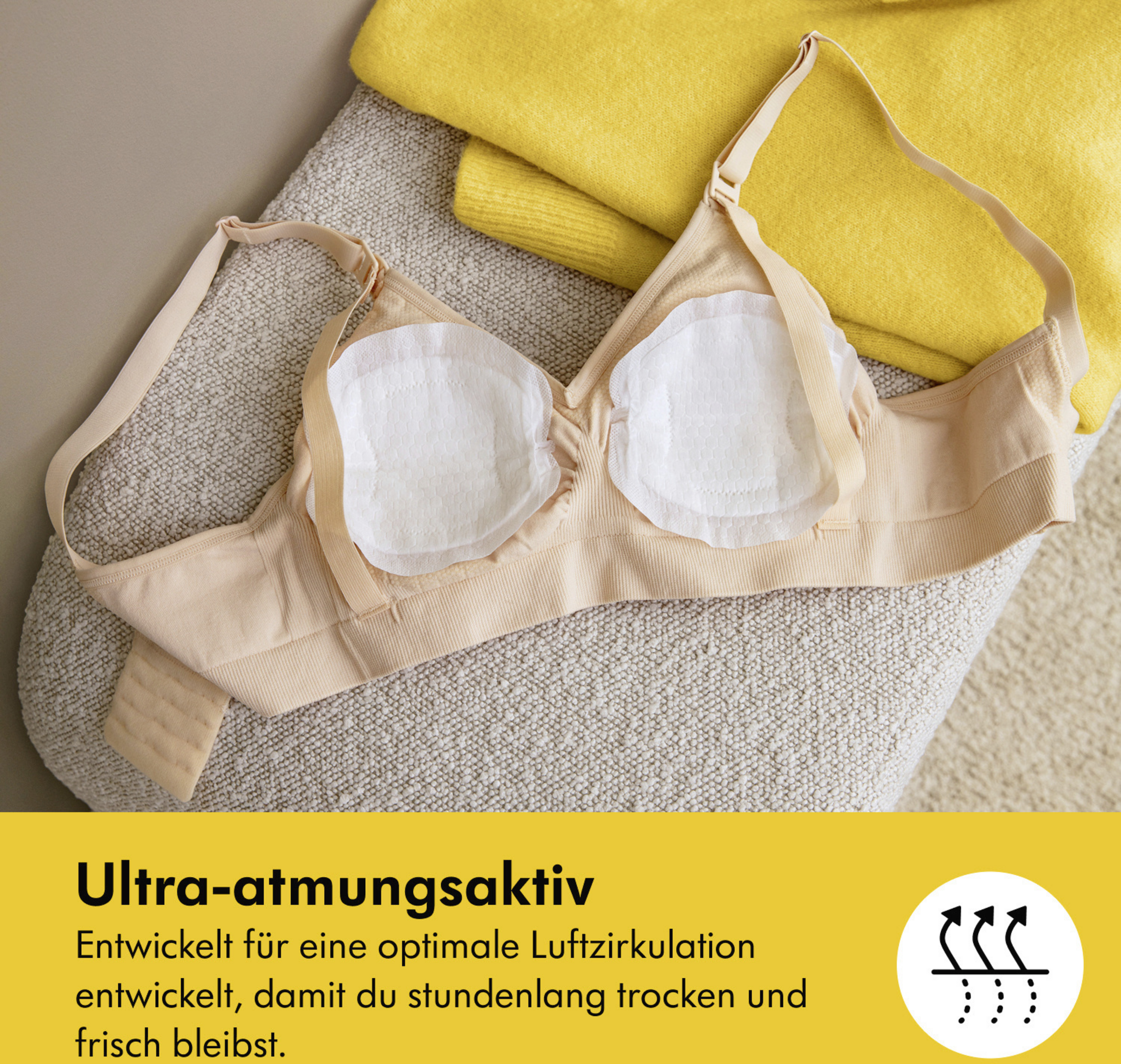 Ultra-atmungsaktive Stilleinlagen nehmen auslaufende Milch auf und halten die Brust trocken. Sie sind höchst saugfähig, diskret und superweich für maximalen Komfort bei Tag und Nacht.