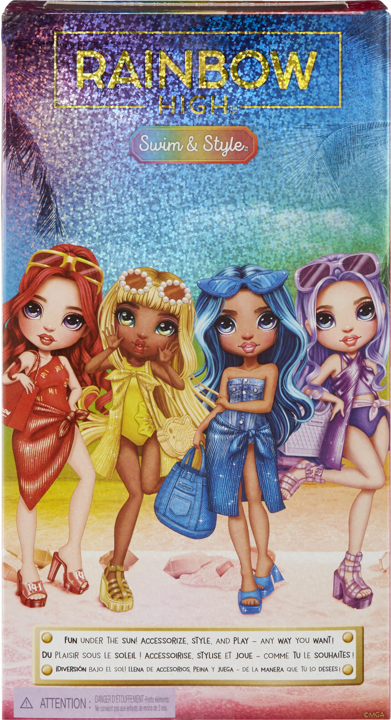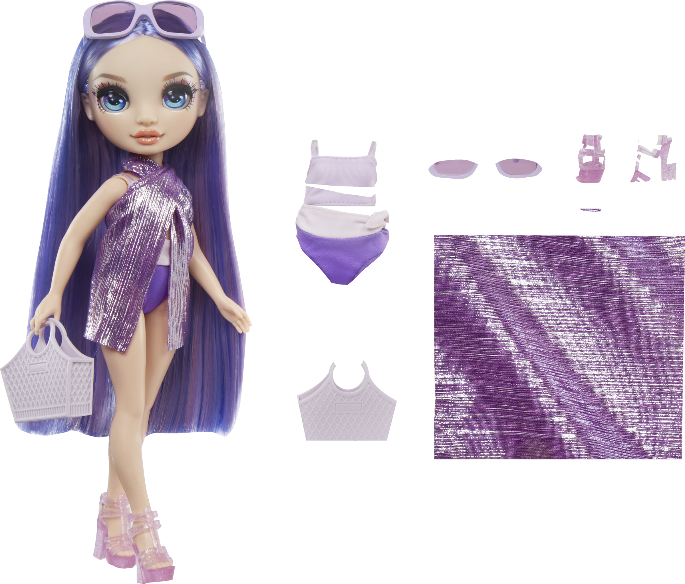Die neuen Bademodepuppen im Look der Lieblingscharaktere von Rainbow High: Ruby, Sunny, Skyler und Violet. Jede Puppe ist mit einem bezaubernden Badeanzug bekleidet und wird mit passenden Accessoires geliefert. Nimm Violet mit in die Badewanne, den Pool, an den Strand und in den Urlaub. Mit Accessoires wie Handtuch, Schuhe, Sonnenbrille und Handtasche.