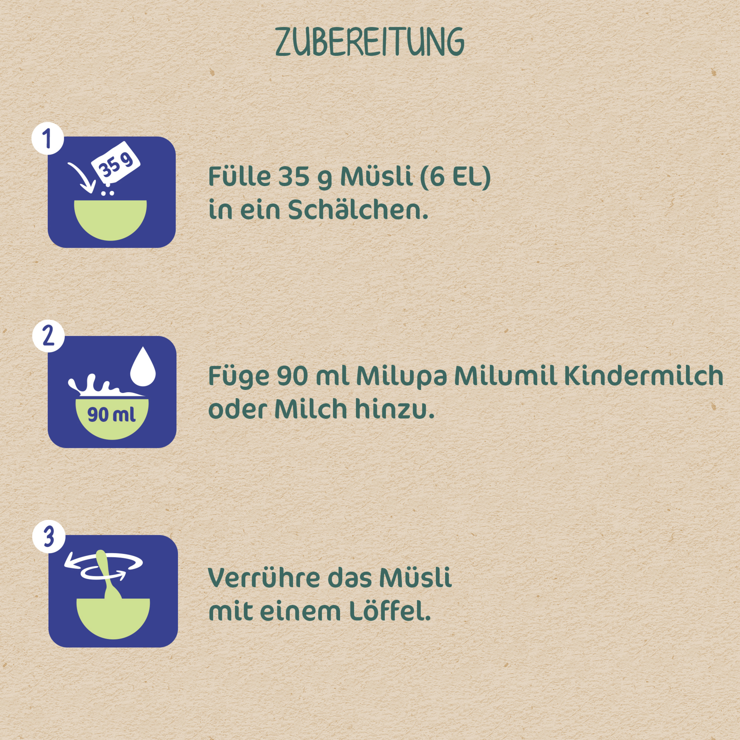 Ca. 6 EL (35 g) Müsli in den Teller geben. 90 ml Milch oder Kindermilch hinzugeben. Mit einem Löffel anrühren - fertig ist das Müsli.C