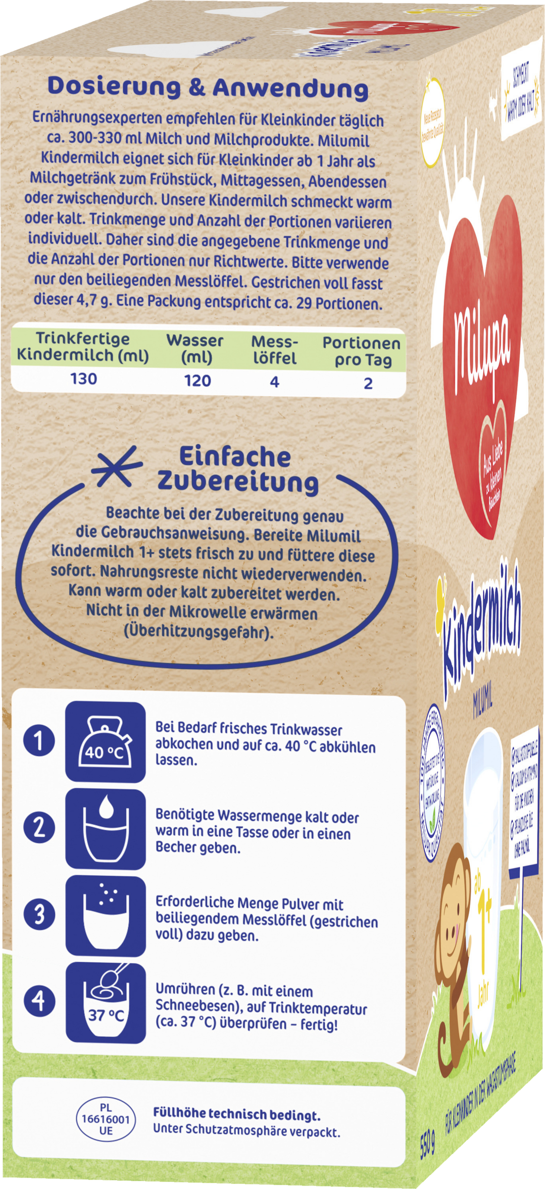 Füllhöhe technisch bedingt. Unter Schutzatmosphäre verpackt. Wichtige Hinweise Milumil Kindermilch 2+ ist für Kleinkinder ab 2 Jahren geeignet und zum Trinken aus der Tasse oder dem Becher bestimmt. Achte bitte auch schon bei den ersten Zähnchen auf eine gründliche Zahnpflege, besonders vor dem Schlafengehen. Bitte achte auf eine abwechslungsreiche und ausgewogene Ernährung sowie eine gesunde Lebensweise deines Kindes.