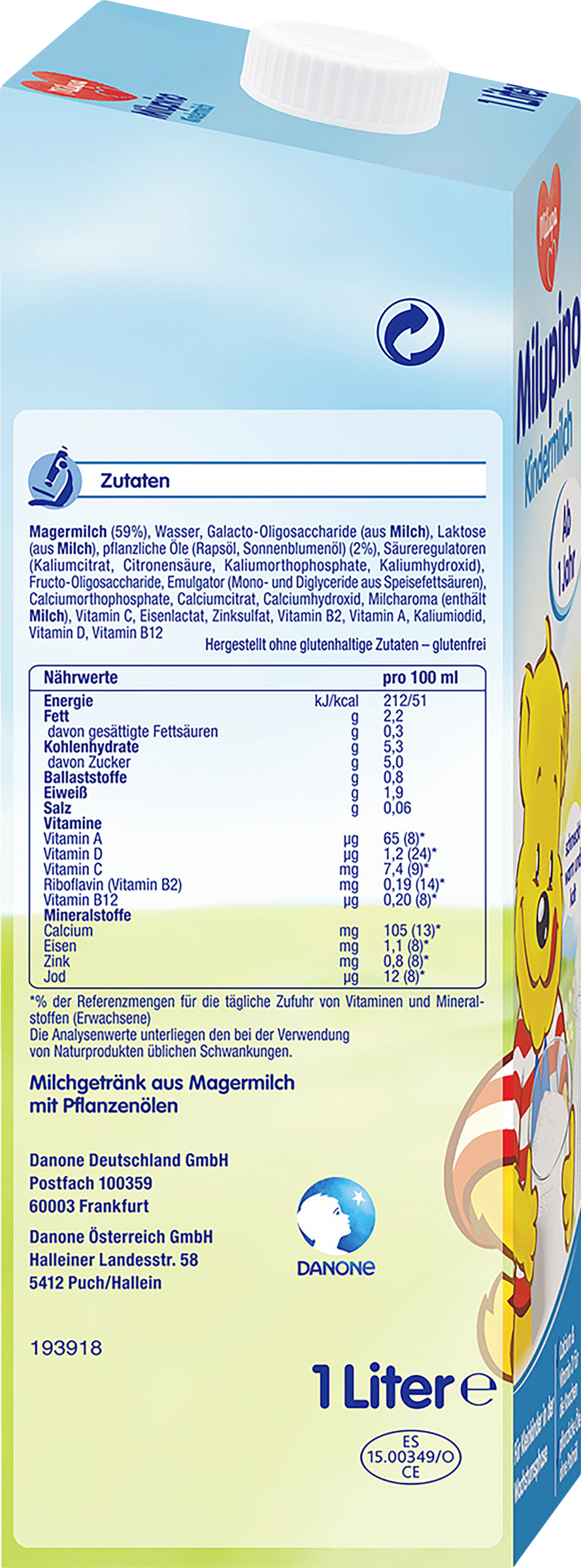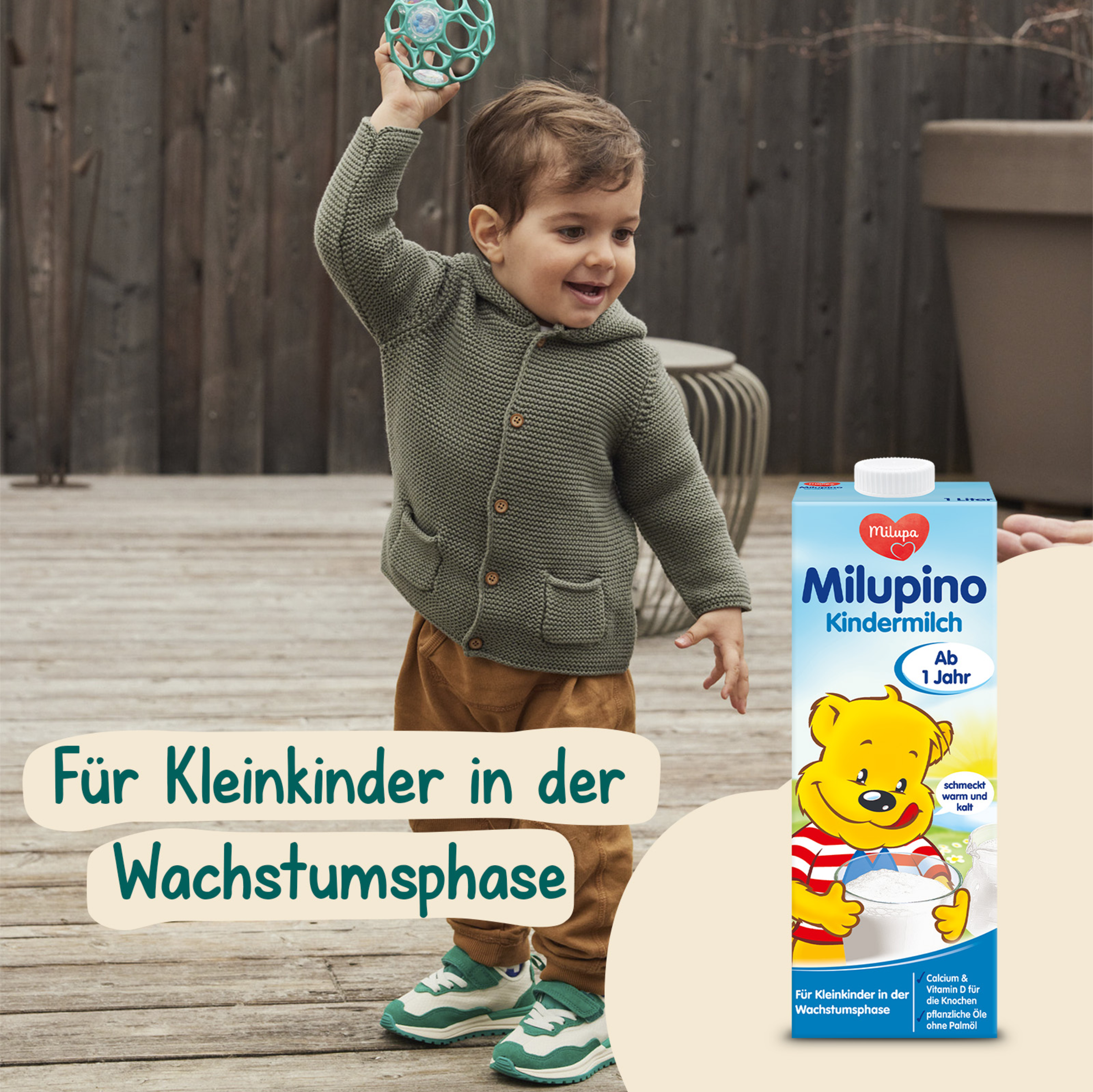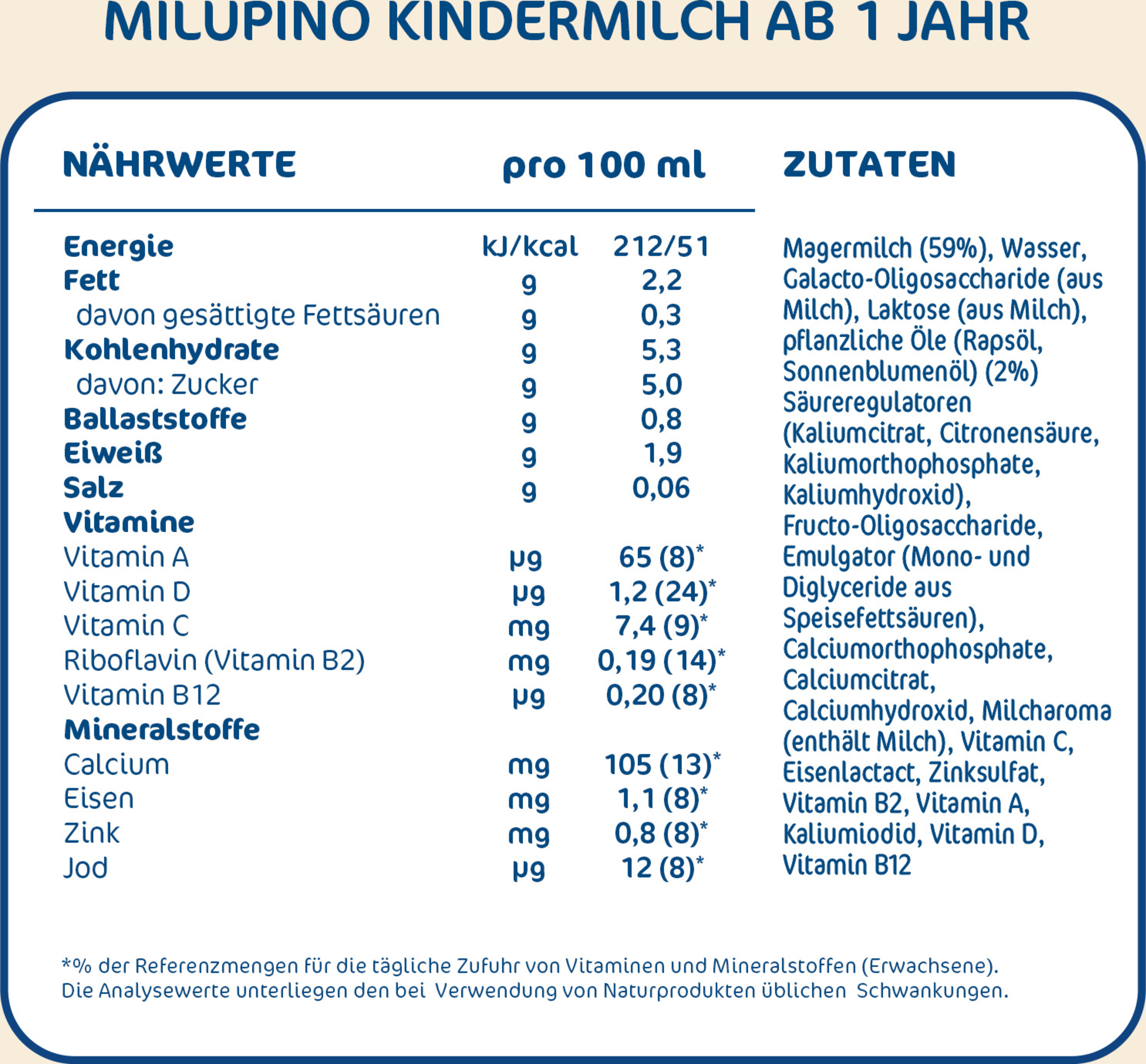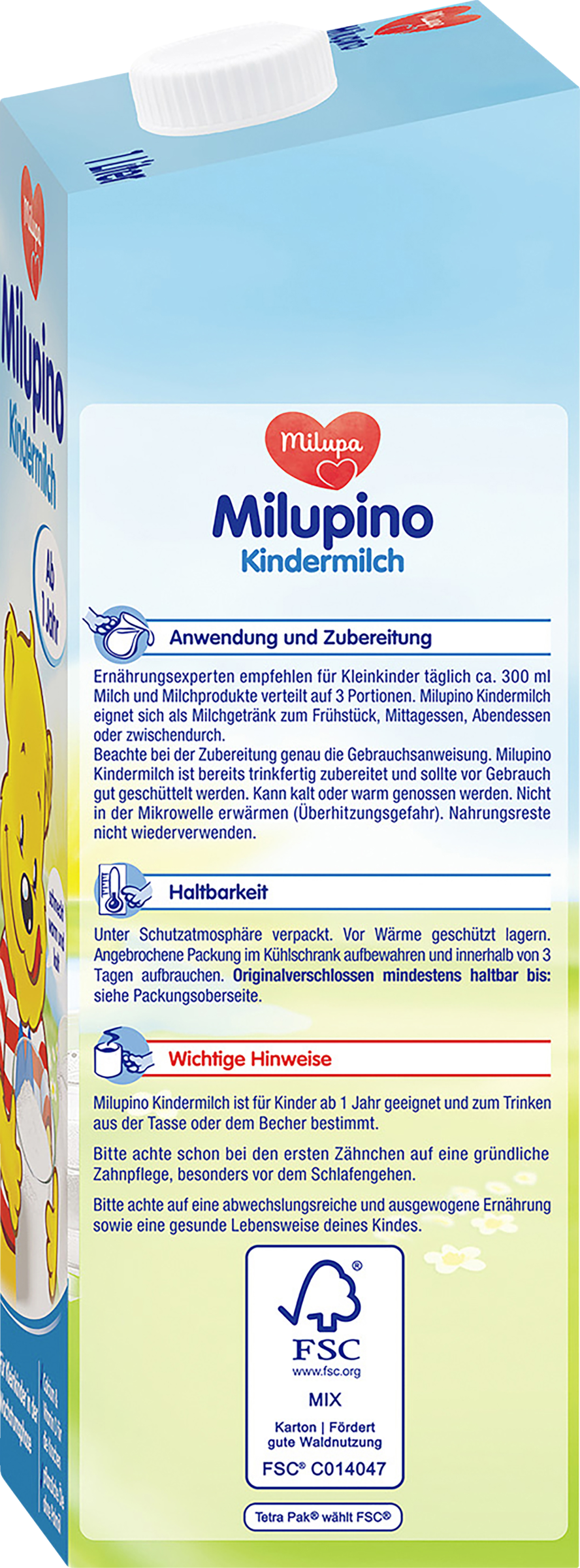 Milupino Kindermilch ist für Kleinkinder ab 1 Jahr zum Trinken aus der Tasse bestimmt. Wenn du die Milch dennoch aus dem Fläschchen gibst, überlasse es deinem Kind nicht zum Dauernuckeln. Häufiges oder dauerndes Nuckeln kohlenhydrathaltiger Nahrungen aus dem Fläschchen kann Karies verursachen und damit die Gesundheit beeinträchtigen. Bitte achte schon bei den ersten Zähnchen auf eine gründliche Zahnpflege besonders vor dem Schlafengehen. Bitte achte außerdem auf eine abwechslungsreiche und aussgewogene Ernährung und eine gesunde Lebensweise deines Kleinkindes.