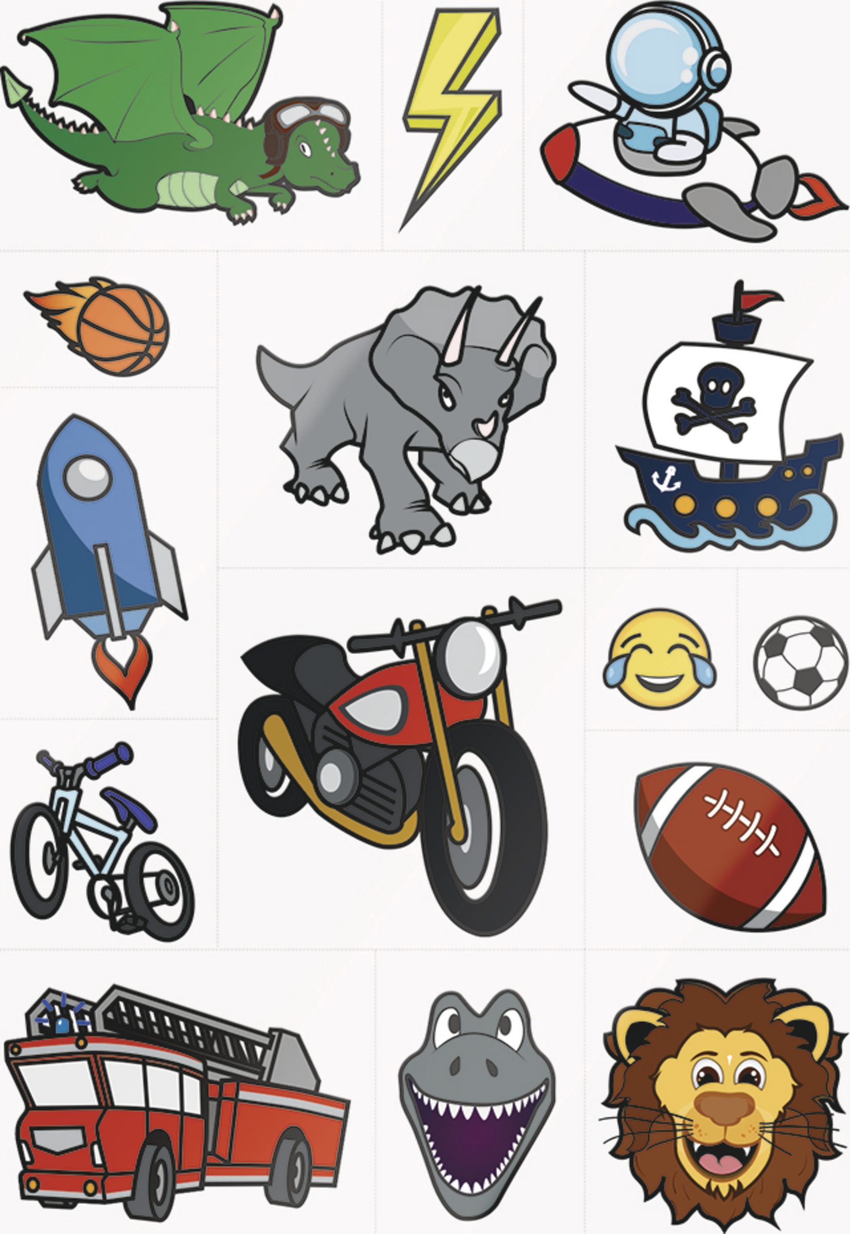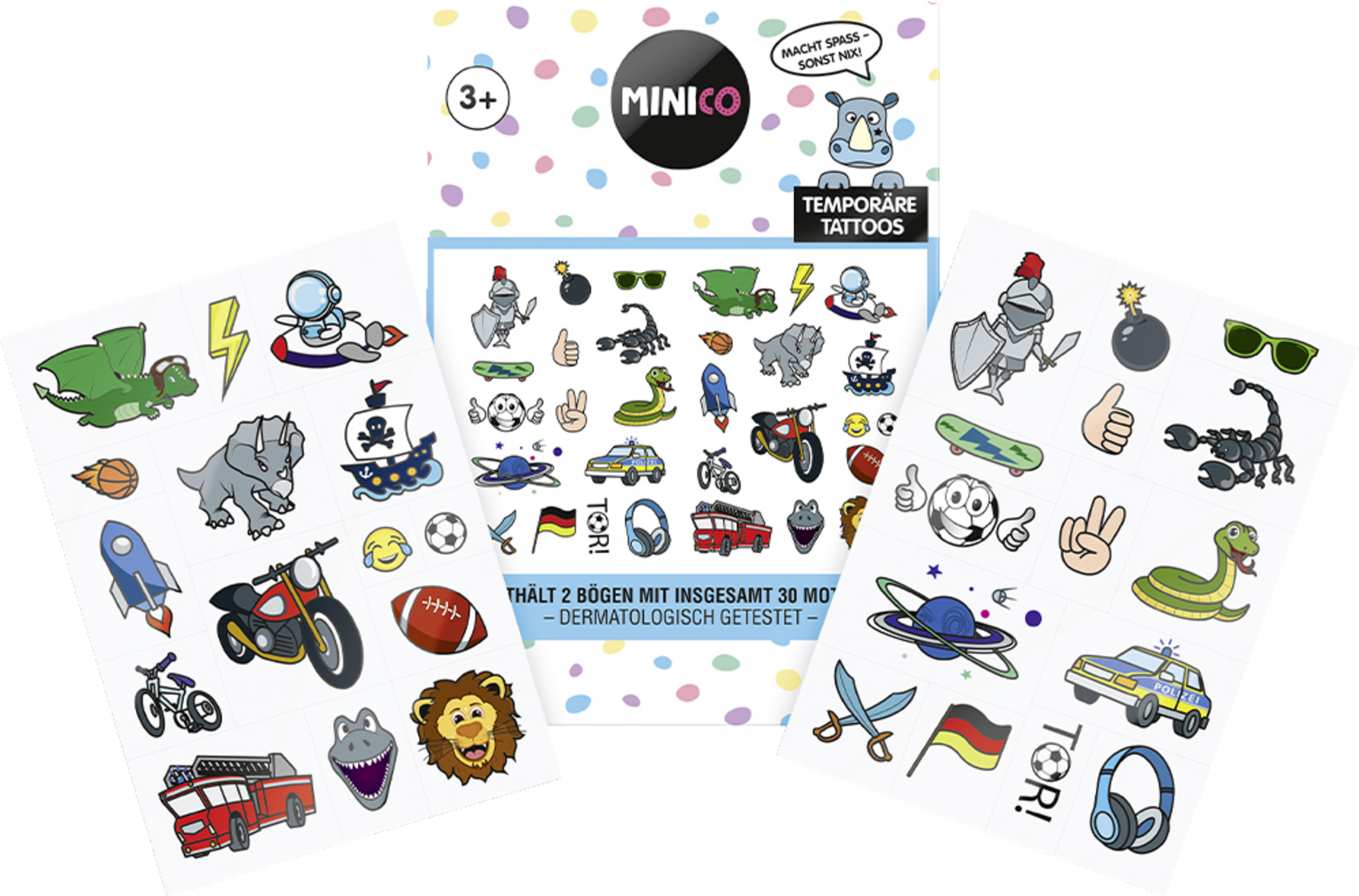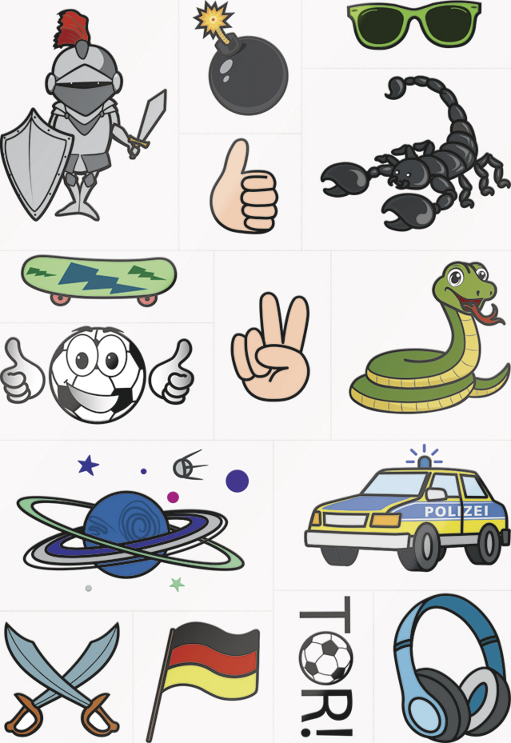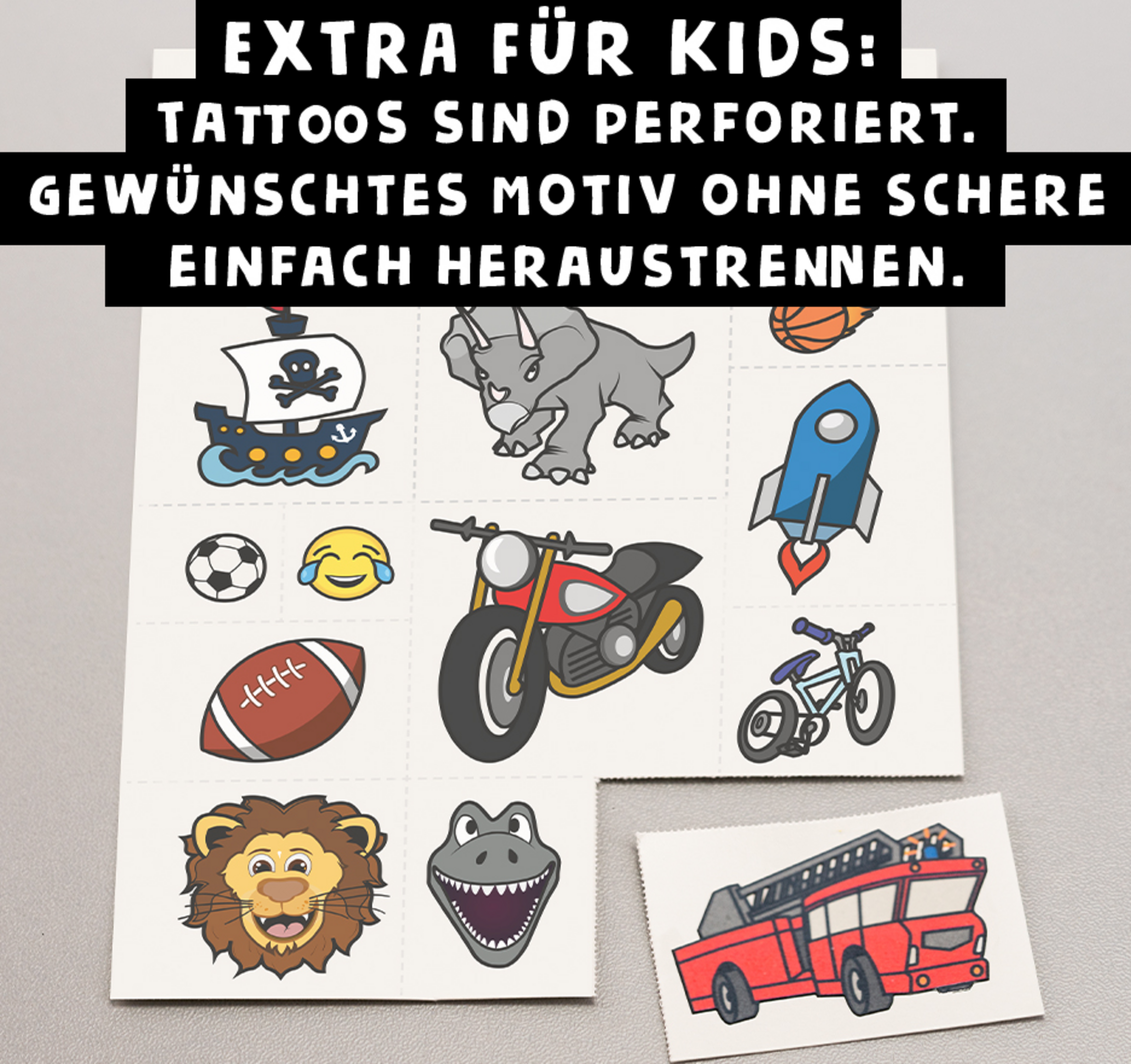 Extra für Kids: Die 30 Tattoomotive sind vorperforiert. Daher kann das gewünschte Motiv einfach herausgetrennt werden. Keine Schere benötigt.