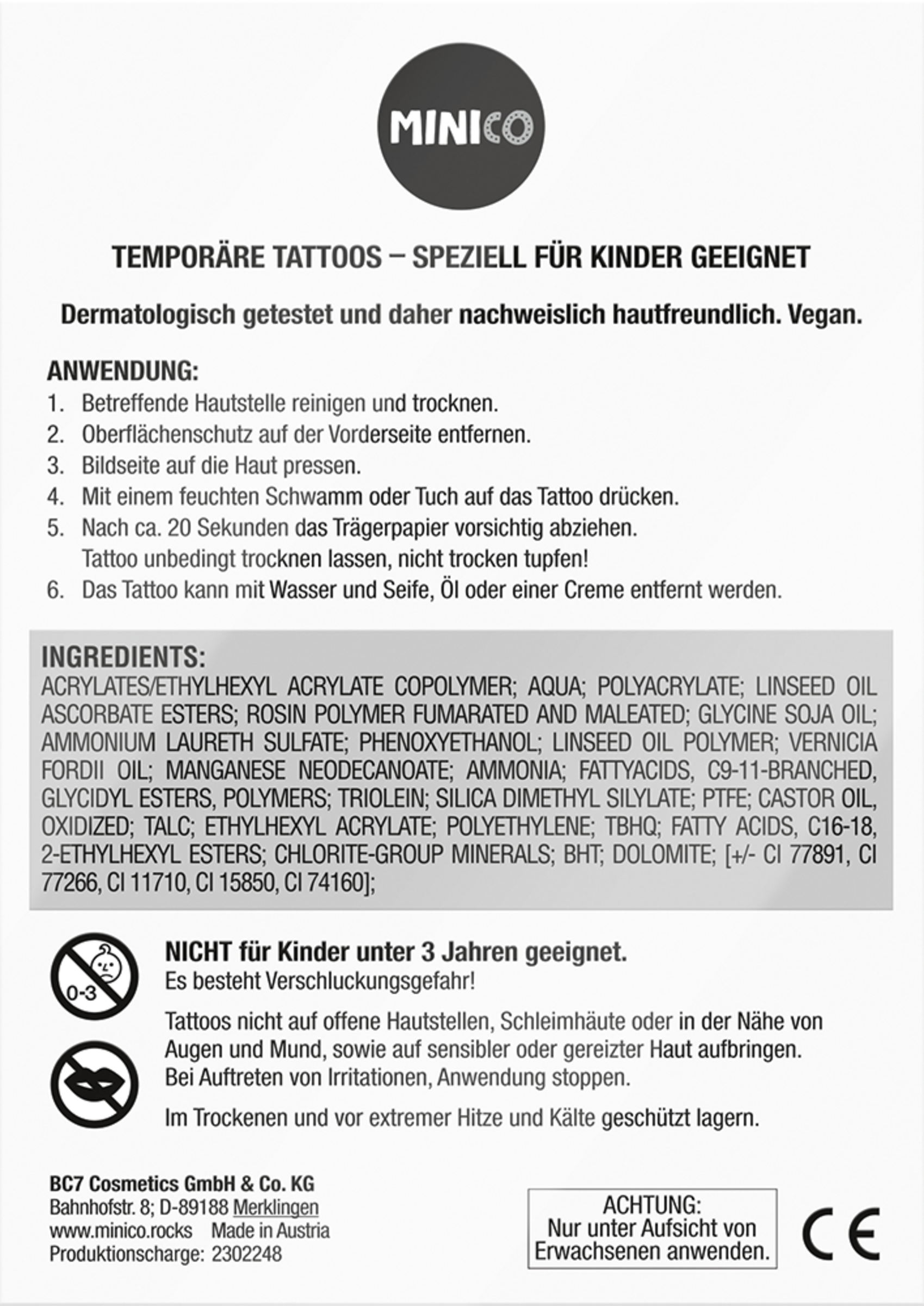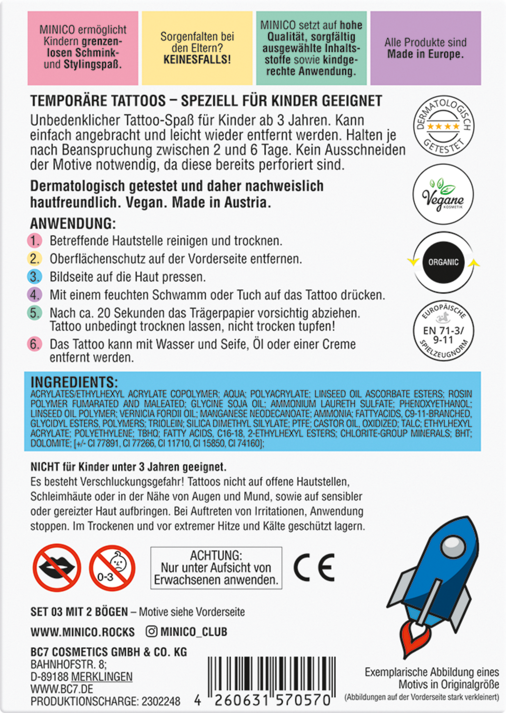 Tattoos nicht auf offene Hautstellen, Schleimhäute oder in der Nähe von Augen und Mund, sowie auf sensibler oder gereizter Haut aufbringen. Bei Auftreten von Irritationen, Anwendung stoppen.