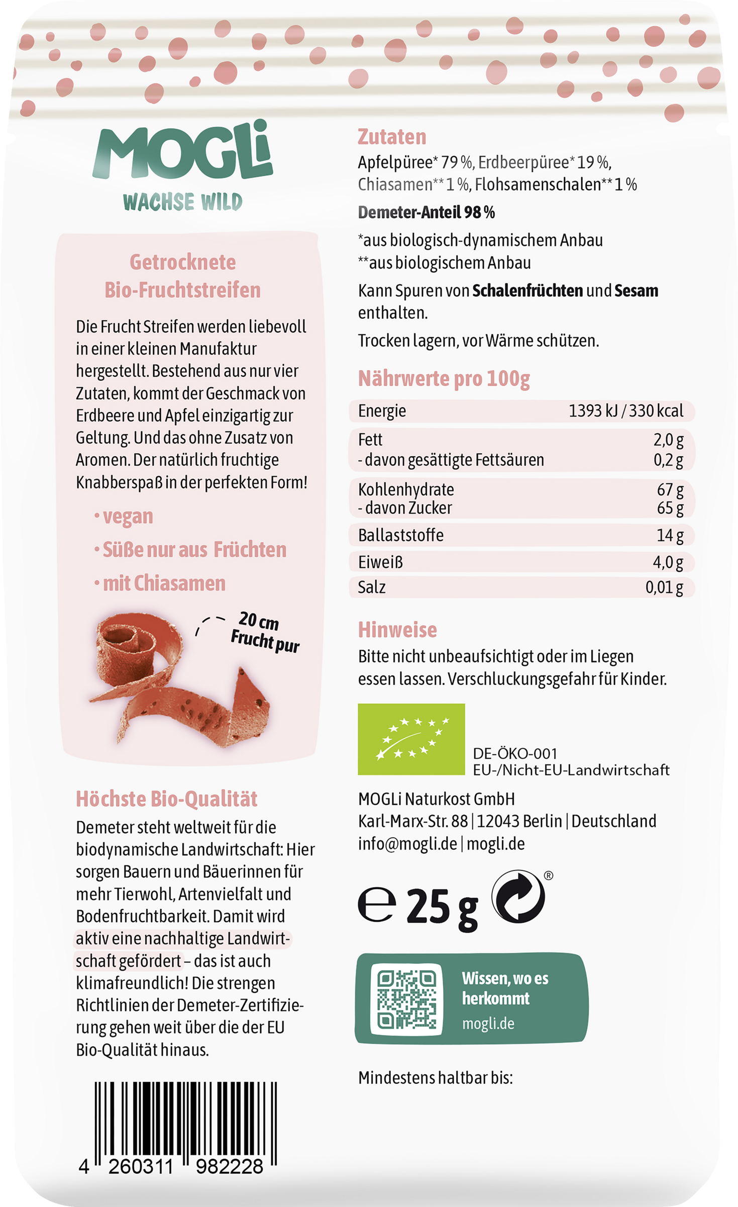Apfel* 79 %, Erdbeere** 19 %, Chia** 1%, Flohsamenschalen** 1 %. Demeter Anteil 79 %.