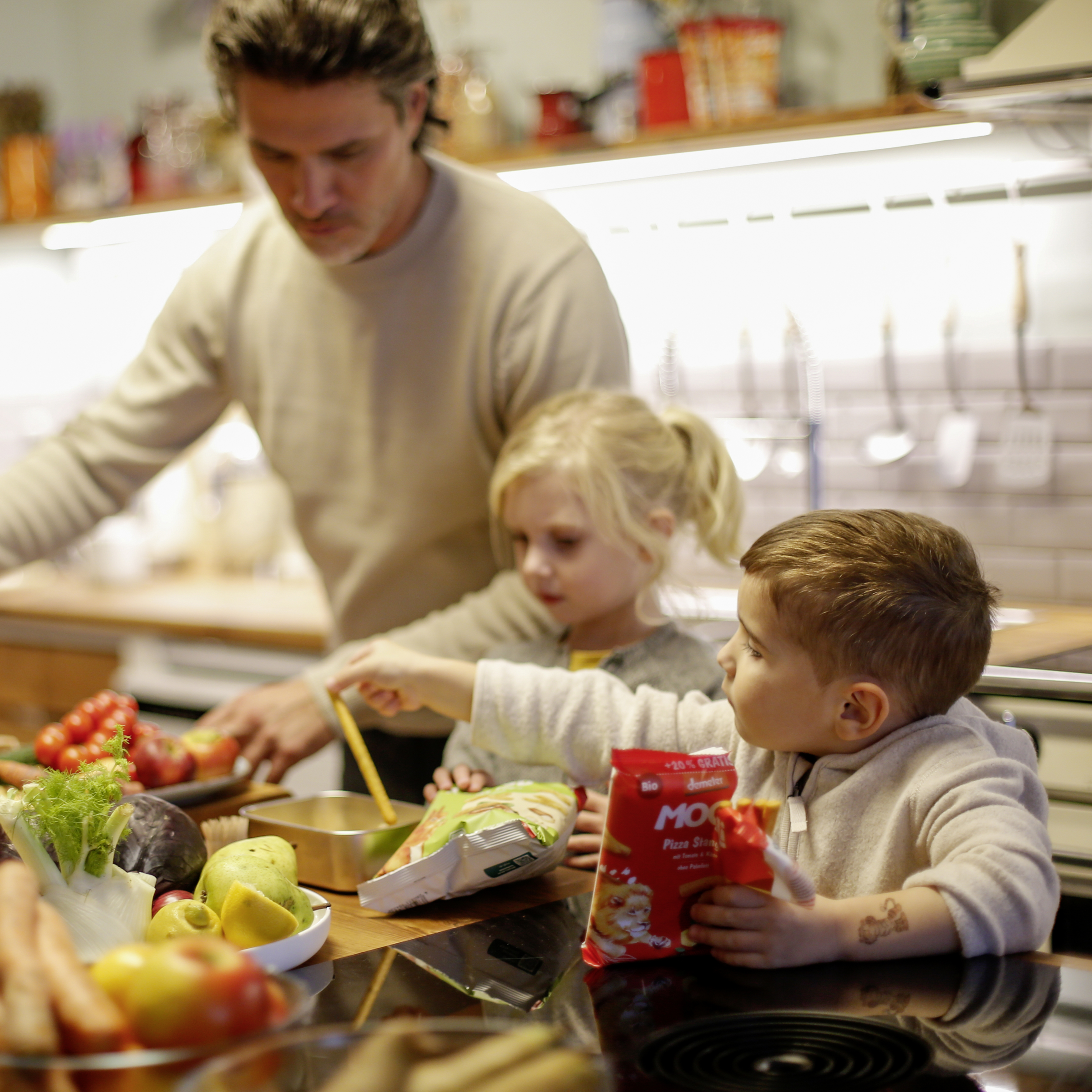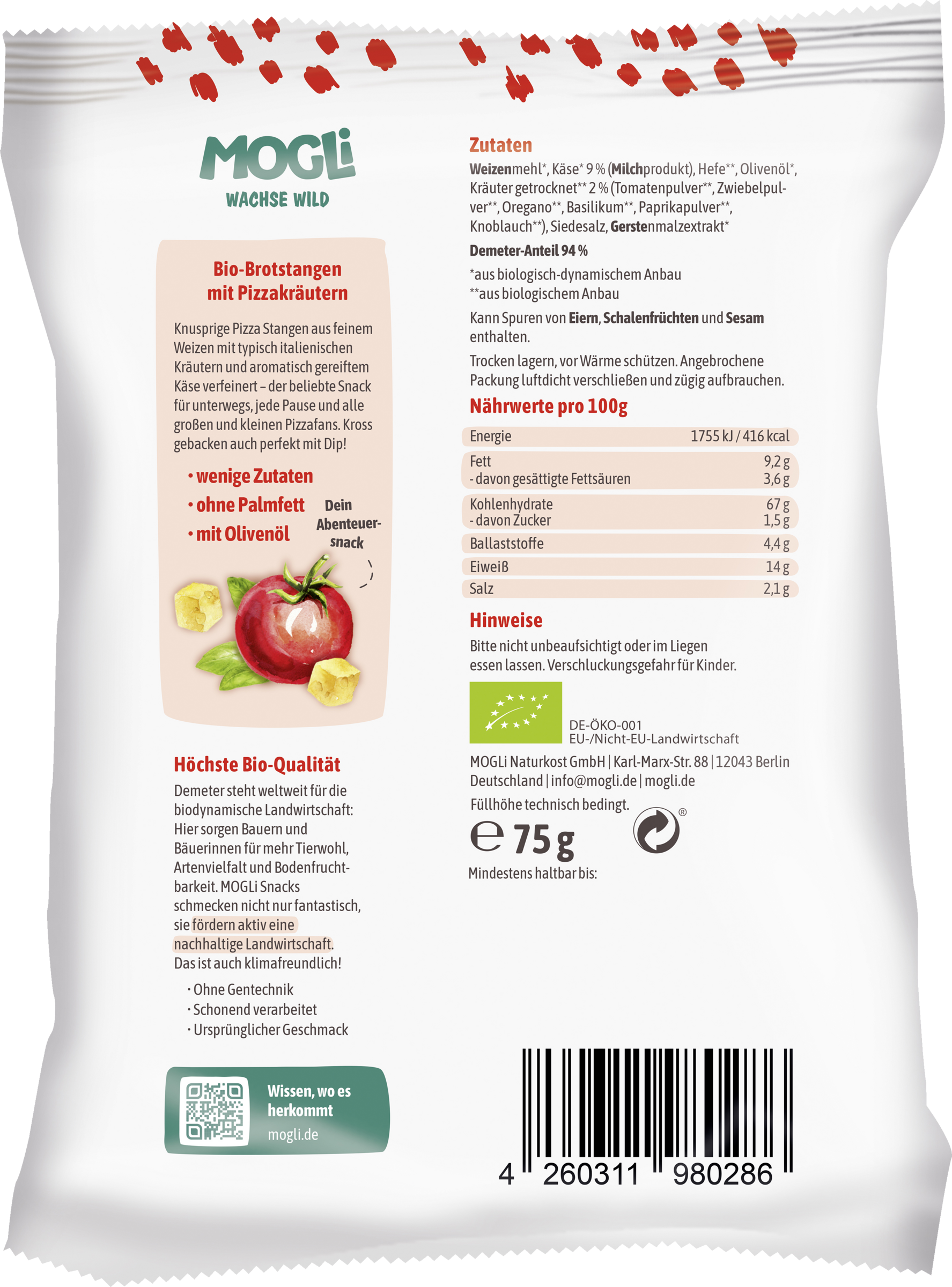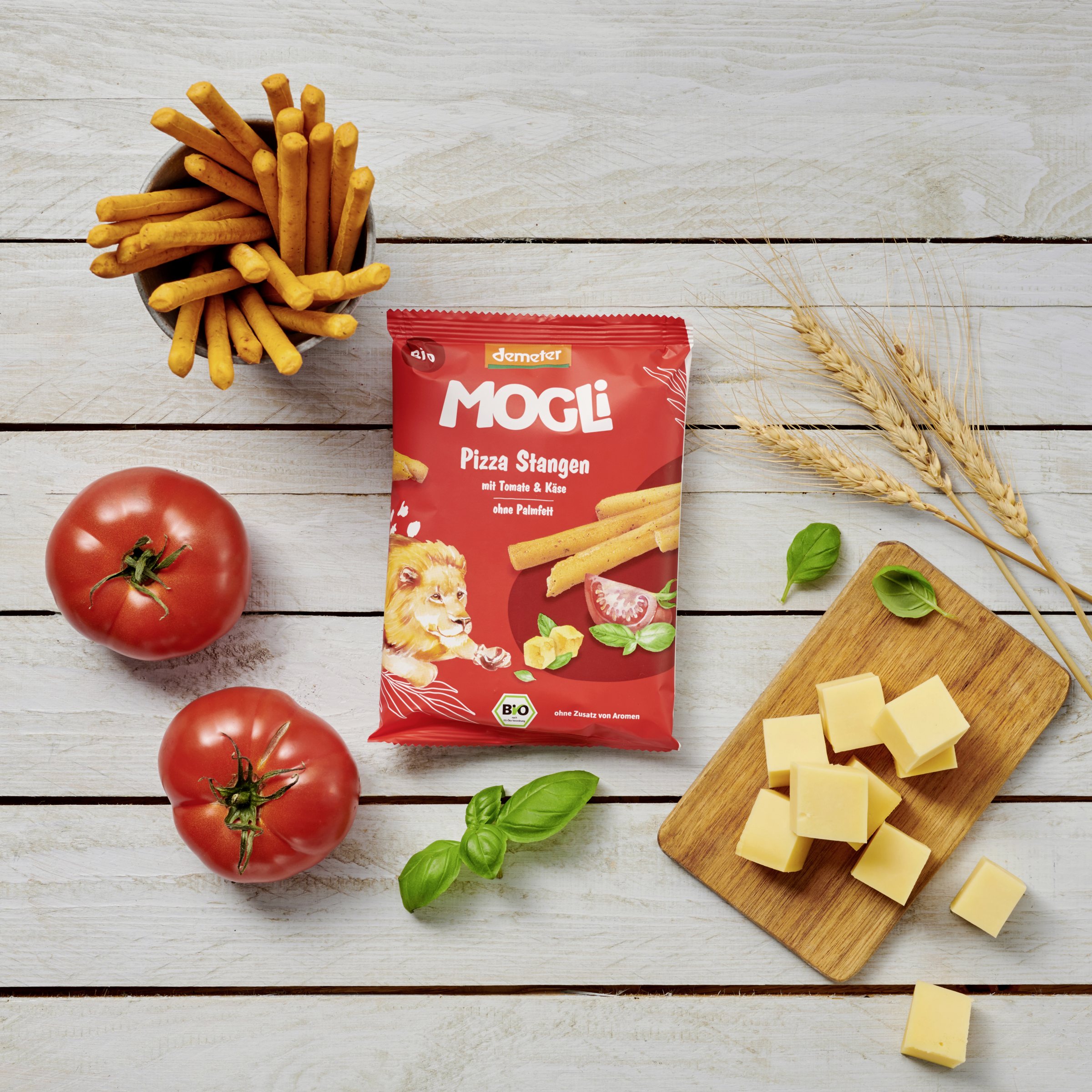 Demeter-Anteil 94%: WEIZENMEHL*, KÄSE* (9 %), Hefe**, Olivenöl*, Kräuter getrocknet** 2 % (Tomatenpulver**, Zwiebelpulver**, Oregano**, Basilikum**, Paprikapulver**, Knoblauch**), Siedesalz, GERSTENMALZEXTRAKT*