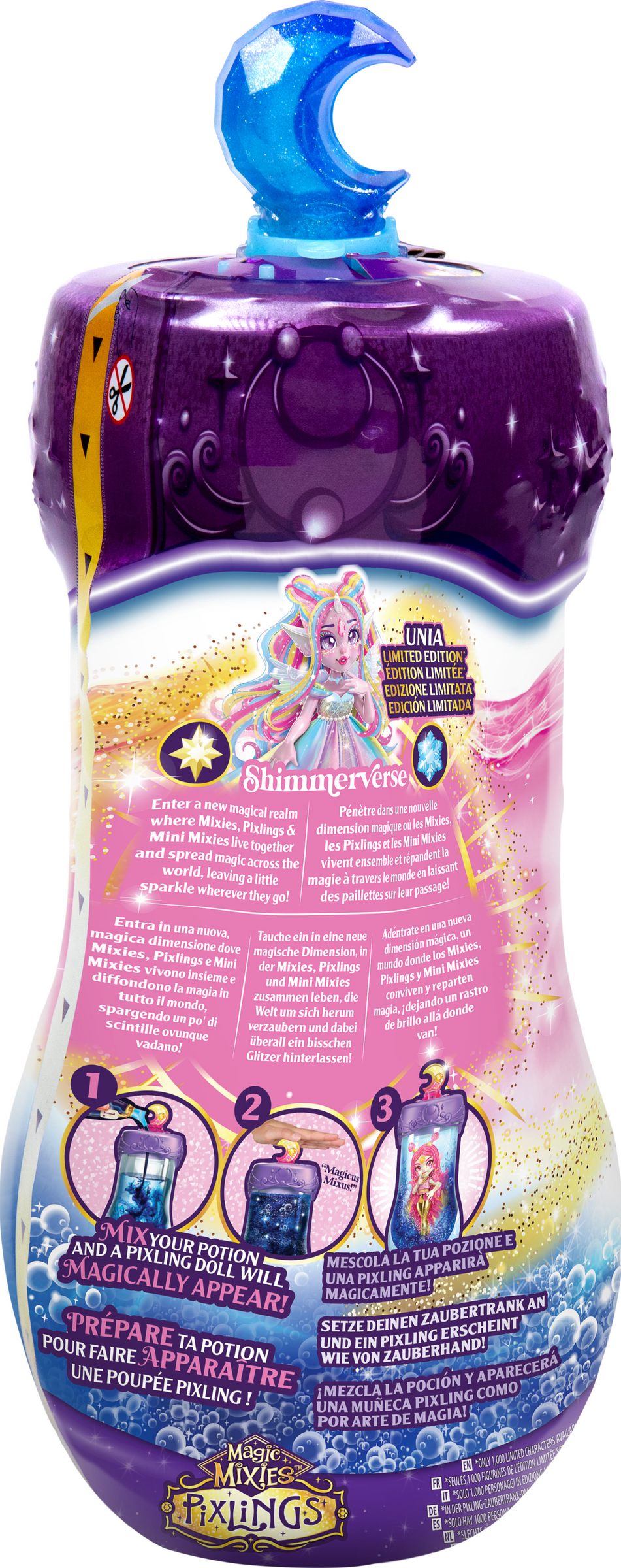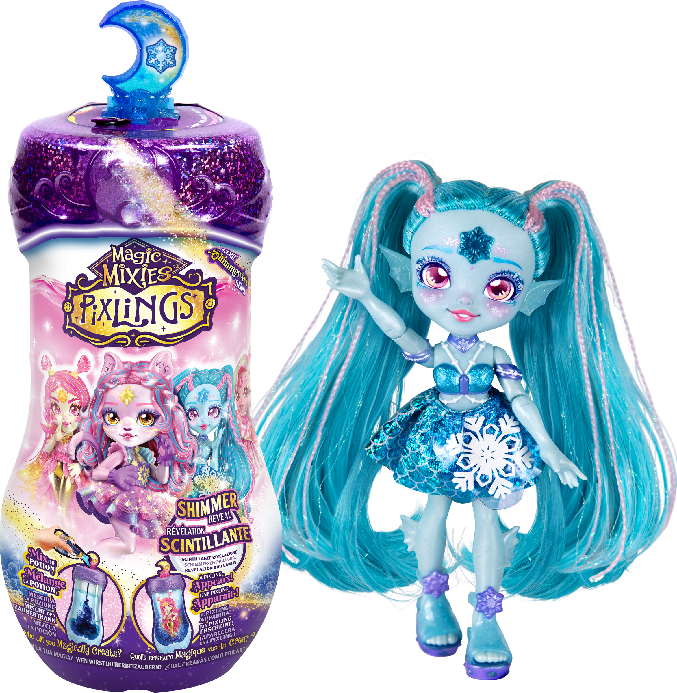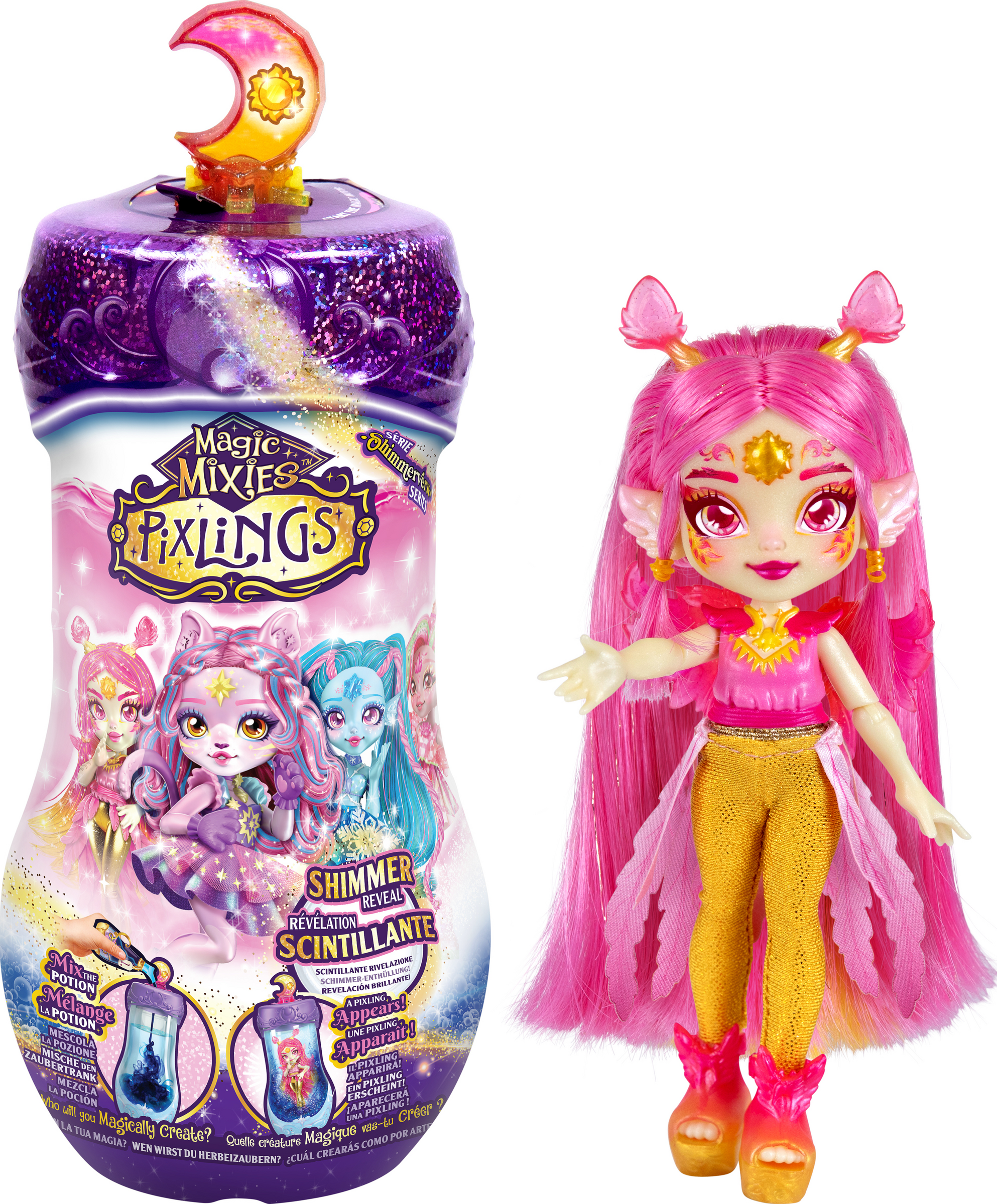 Betritt das Shimmerverse und braue einen Trank, der den magischen Katzen-Pixling Catlyn zu dir ruft! Mische dafür die Trankzutaten aus diesem Set in der Trankflasche. Wenn darin glitzernde Wirbel entstanden sind, sagst du die Zauberworte "Magicus Mixus" und drückst du den Mond-Kristall auf dem Deckel der Flasche. Dann erscheint Catlyn, eine bildschöne, bewegliche Pixling-Puppe. Catlyn der Katzen-Pixling hat wunderschönes langes violettes Haar, das glitzert und glänzt. Du kannst es wunderbar kämmen und frisieren. Auf der Stirn des Zauberwesens prangt ein Kristall und es hat schimmerndes Zubehör mitgebracht. Ihr magischer Kraft-Trank ist "Wünsche werden wahr''.