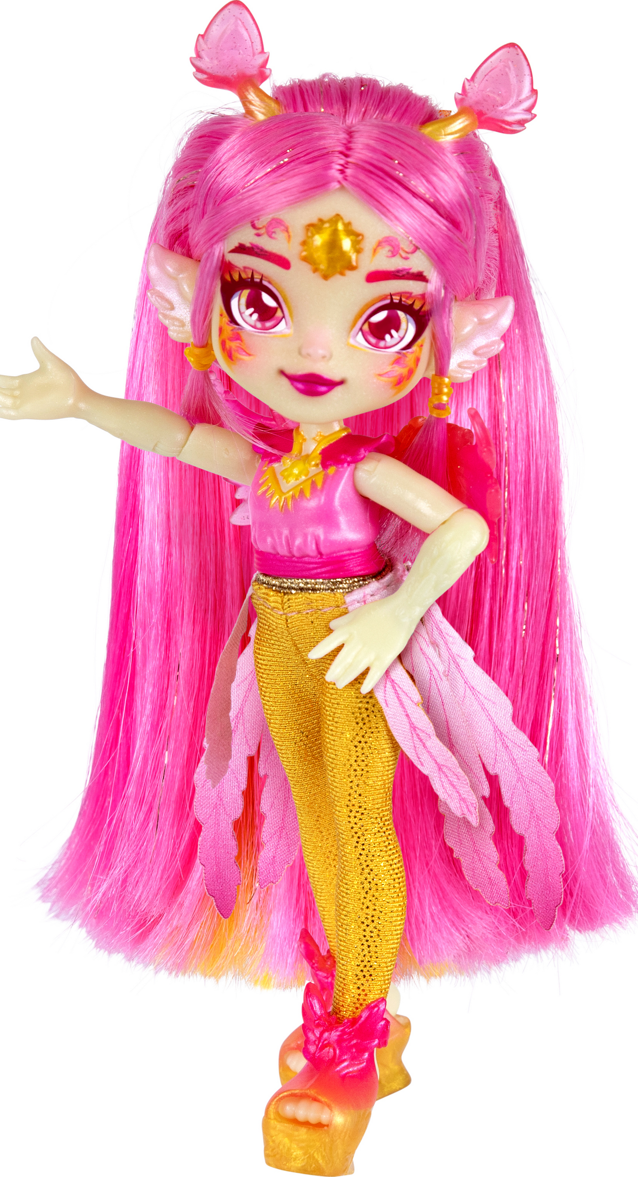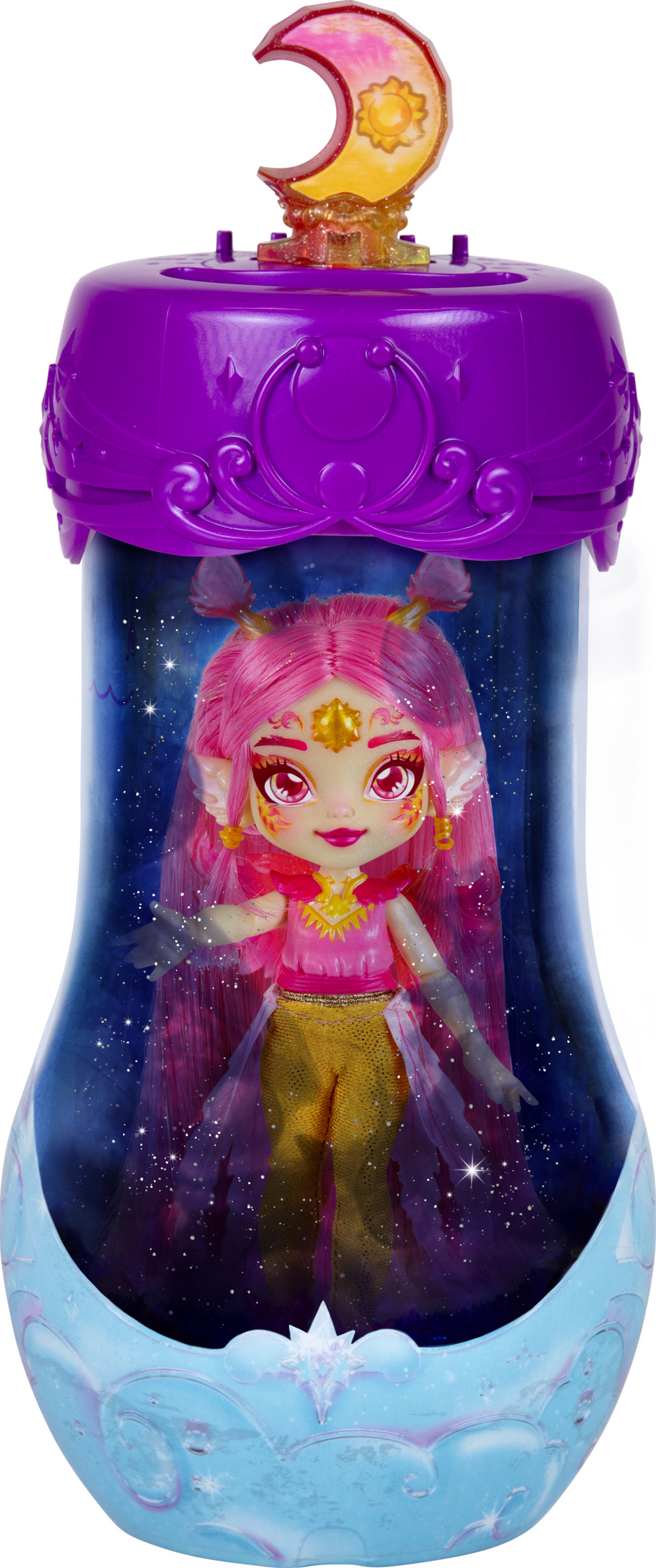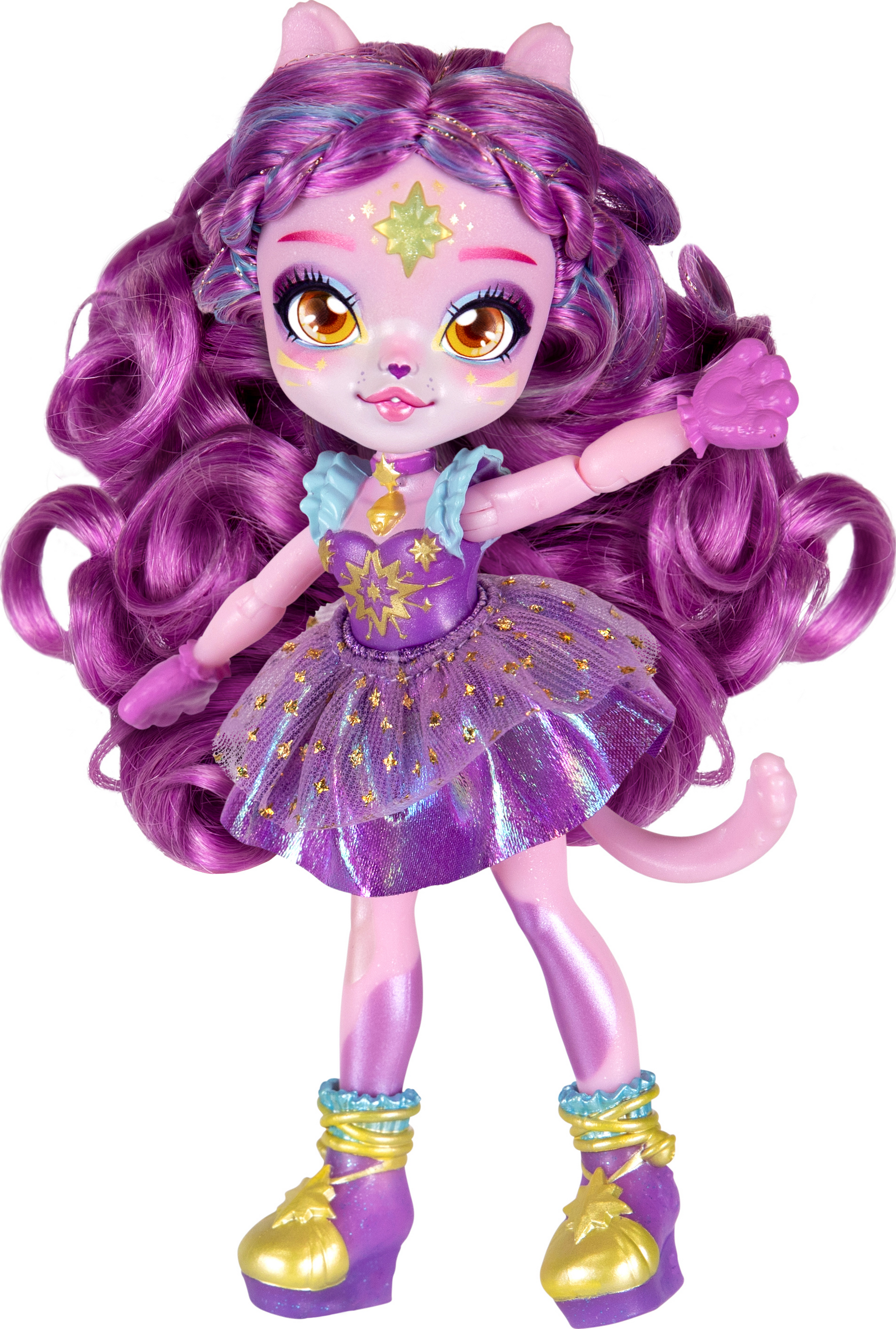 Betritt das Shimmerverse und braue einen Trank, der den magischen Katzen-Pixling Catlyn zu dir ruft! Mische dafür die Trankzutaten aus diesem Set in der Trankflasche. Wenn darin glitzernde Wirbel entstanden sind, sagst du die Zauberworte "Magicus Mixus" und drückst du den Mond-Kristall auf dem Deckel der Flasche. Dann erscheint Catlyn, eine bildschöne, bewegliche Pixling-Puppe. Catlyn der Katzen-Pixling hat wunderschönes langes violettes Haar, das glitzert und glänzt. Du kannst es wunderbar kämmen und frisieren. Auf der Stirn des Zauberwesens prangt ein Kristall und es hat schimmerndes Zubehör mitgebracht. Ihr magischer Kraft-Trank ist "Wünsche werden wahr''.