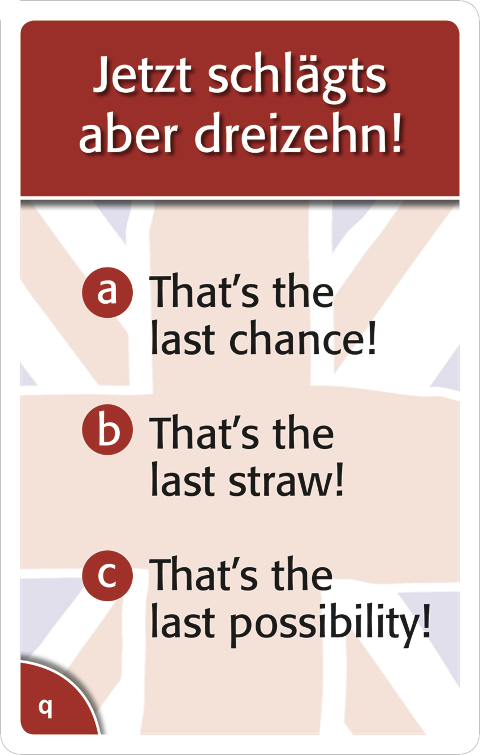 Endlich gibt es einen Nachfolgetitel zu dem beliebten Spiel um englische Redewendungen „Now goes me a light up“. Auf Sie warten 75 unterhaltsame denglische Sprüche und Begriffe. Wer schafft es, die denglischen Sprüche und Wörter in korrektes Englisch zu übersetzen? Und erkennen die Spieler die vermeintlich englischen Begriffe, die es im Englischen gar nicht gibt? Ob allein oder im Team – dieses Quiz bietet Ratespaß für die ganze Familie.