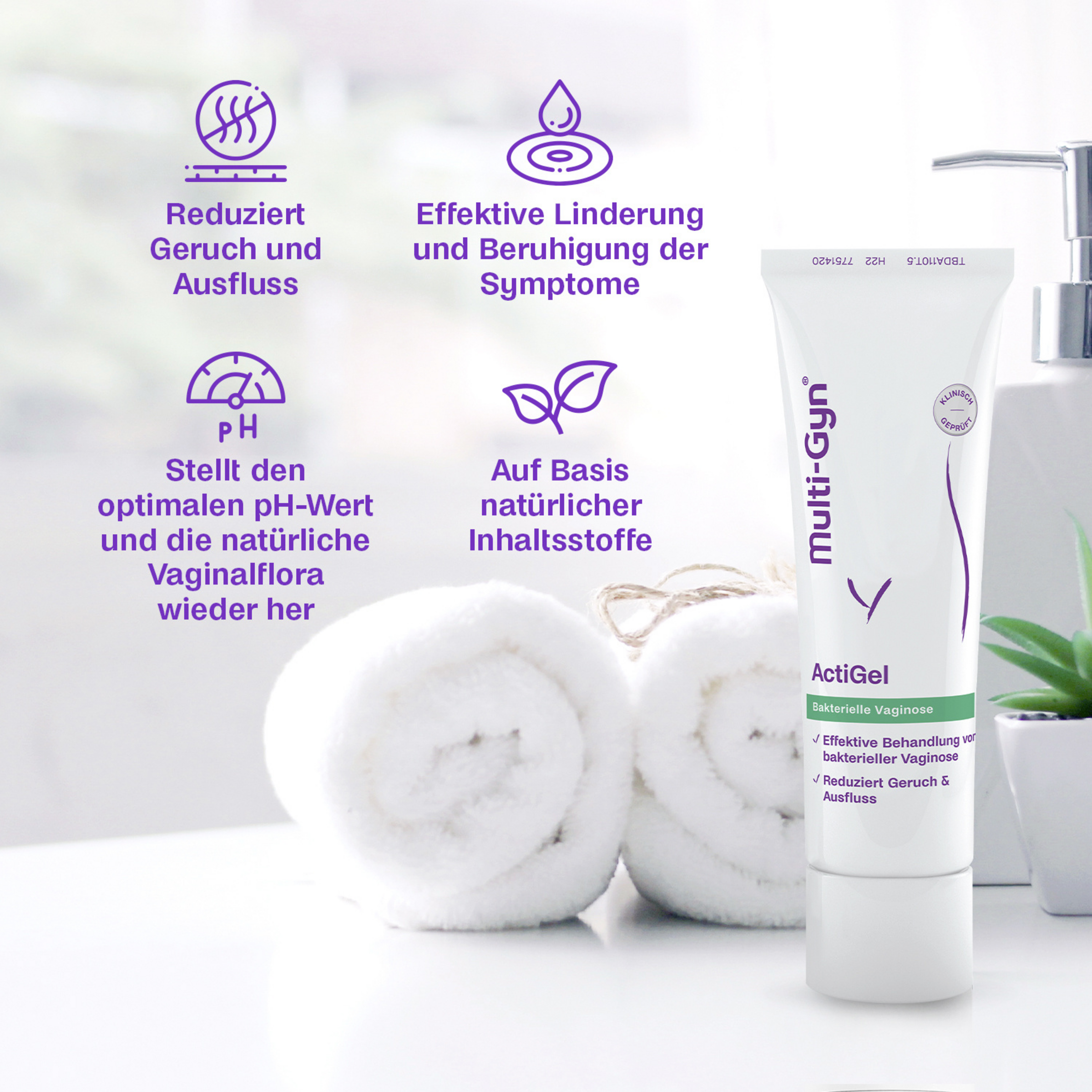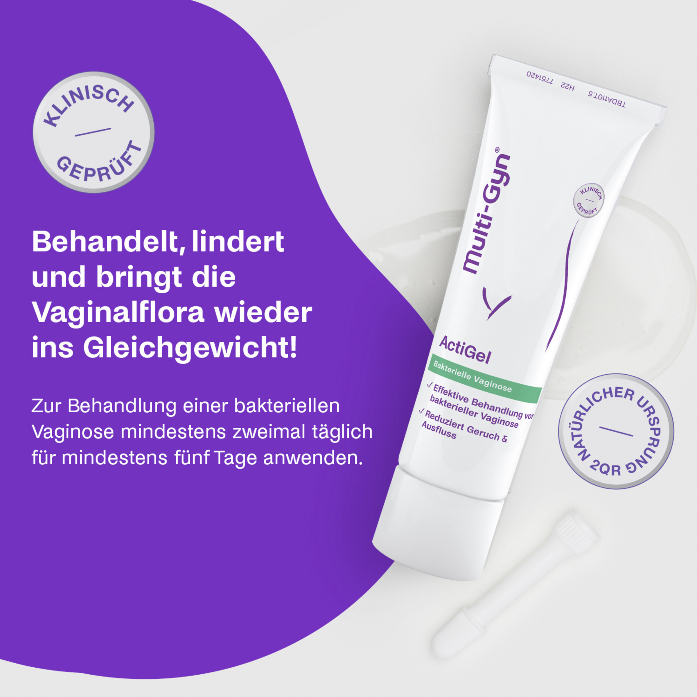 - Multi-Gyn ActiGel verbessert so die Scheidenflora, unterstützt das Gewebe bei der Regeneration und optimiert den vaginalen pH-Wert