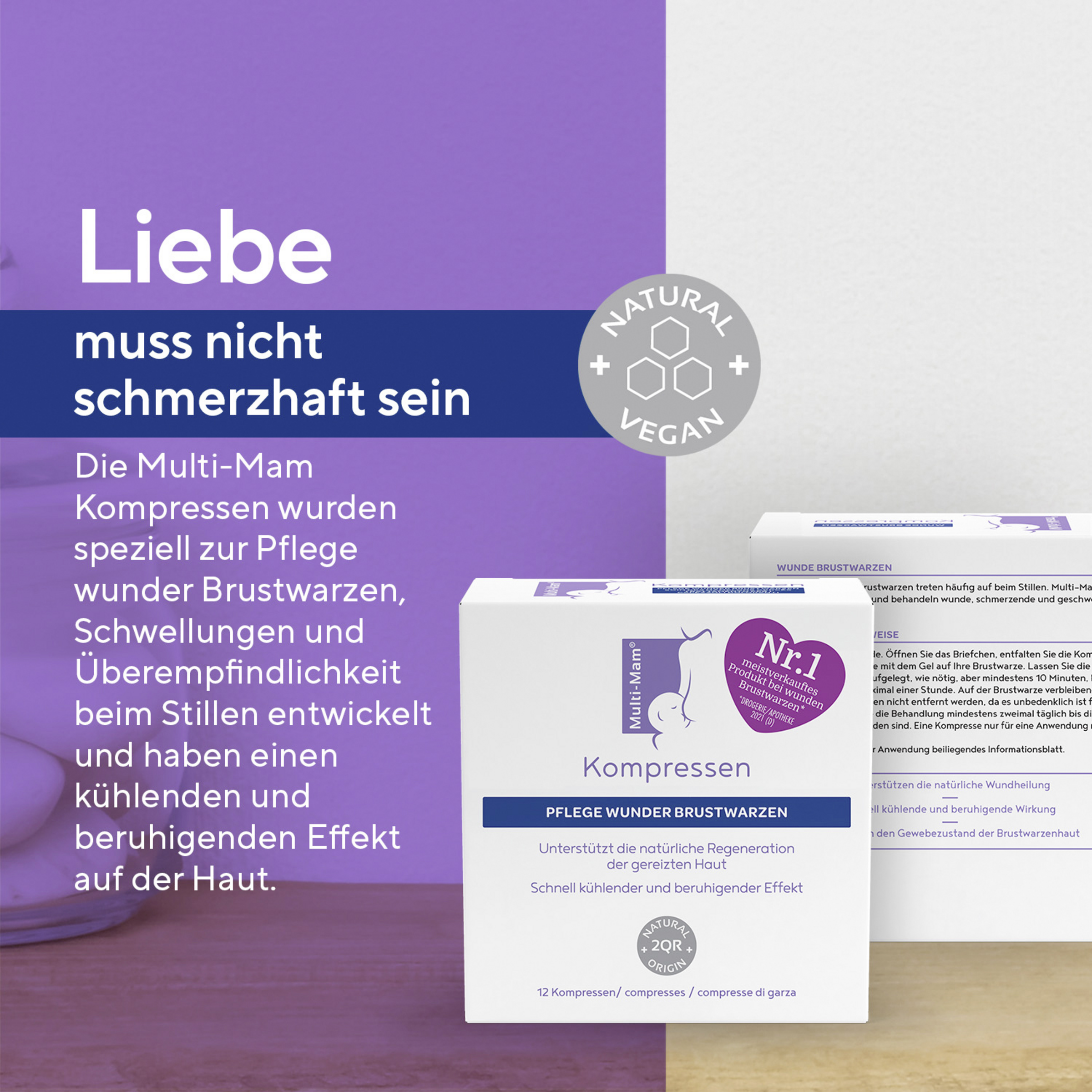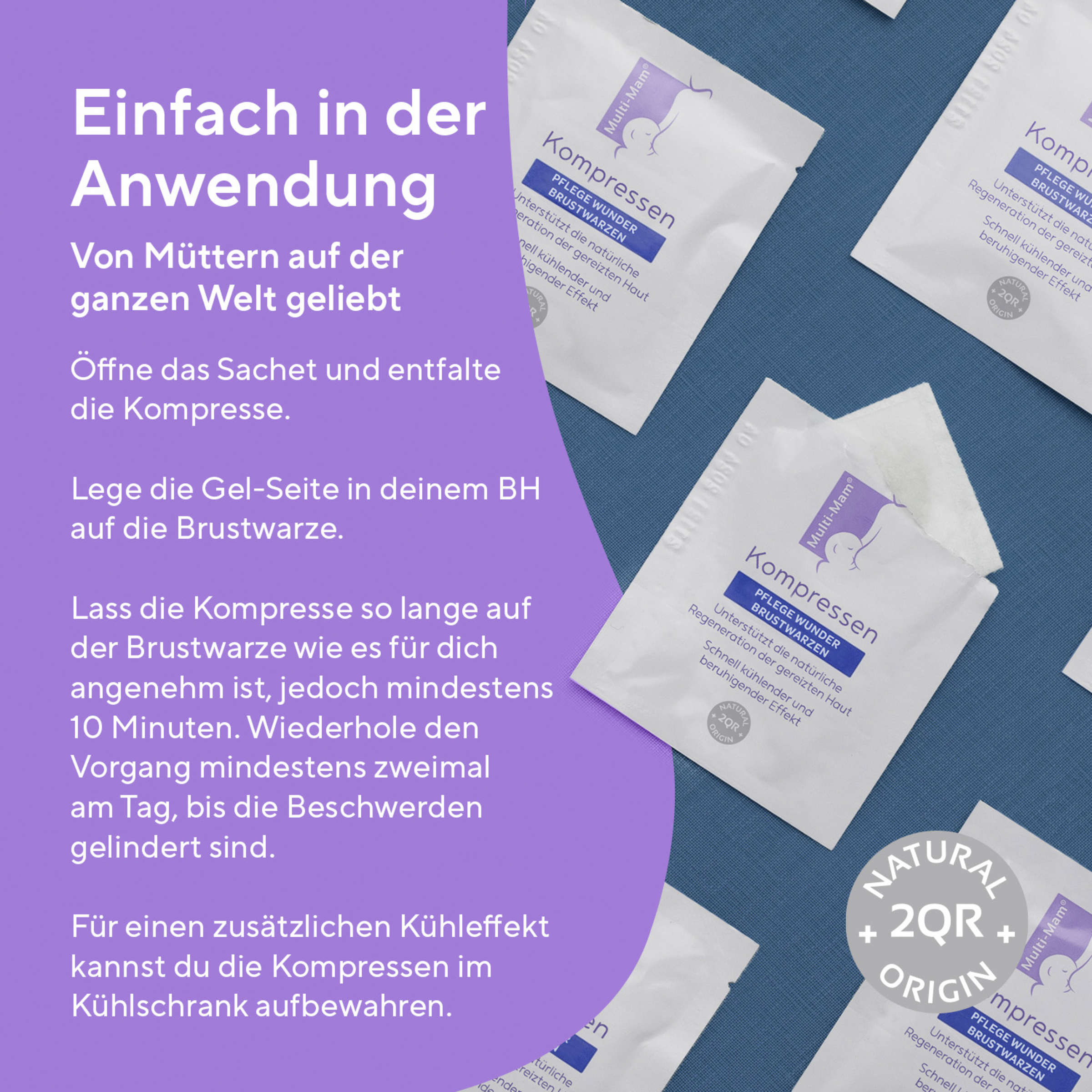 Die Multi-Mam Kompressen unterstützen bei Beschwerden beim Stillen wie zum Beispiel Brustwarzenschmerzen, Schwellungen und Überempfindlichkeit und haben dabei einen schnell kühlend und beruhigenden Effekt. Die Kompressen bilden einen weichen und angenehmen Schutz und pflegen wunde Brustwarze. Der Hauptbestandteil des Produkts ist ein pflanzliches Gel, das für Feuchtigkeit sorgt, einen Schutz vor schädlichen Bakterien bildet und den natürlichen Heilungsprozess unterstützt. Vor dem Stillen müssen Rückstände des Gels nicht entfernt werden.