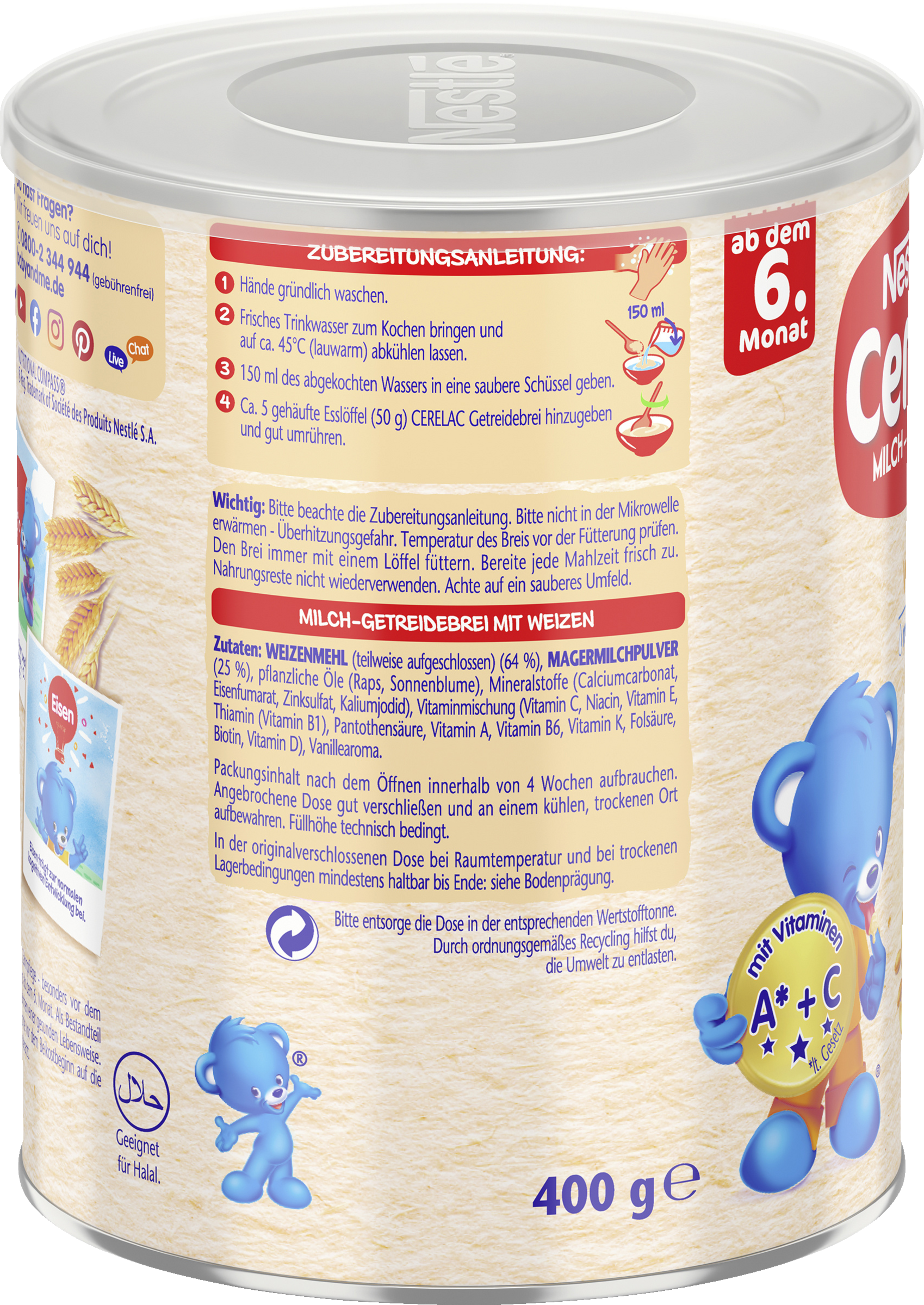 WEIZENMEHL (teilweise aufgeschlossen) (64%), MAGERMILCHPULVER (25%), pflanzliche Öle (Raps, Sonnenblume), Mineralstoffe (Calciumcarbonat, Eisenfumarat, Zinksulfat, Kaliumjodid), Vitaminmischung (Vitamin C, Niacin, Vitamin E, Thiamin (Vitamin B1), Pantothensäure, Vitamin A, Vitamin B6, Vitamin K, Folsäure, Biotin, Vitamin D), Vanillearoma.