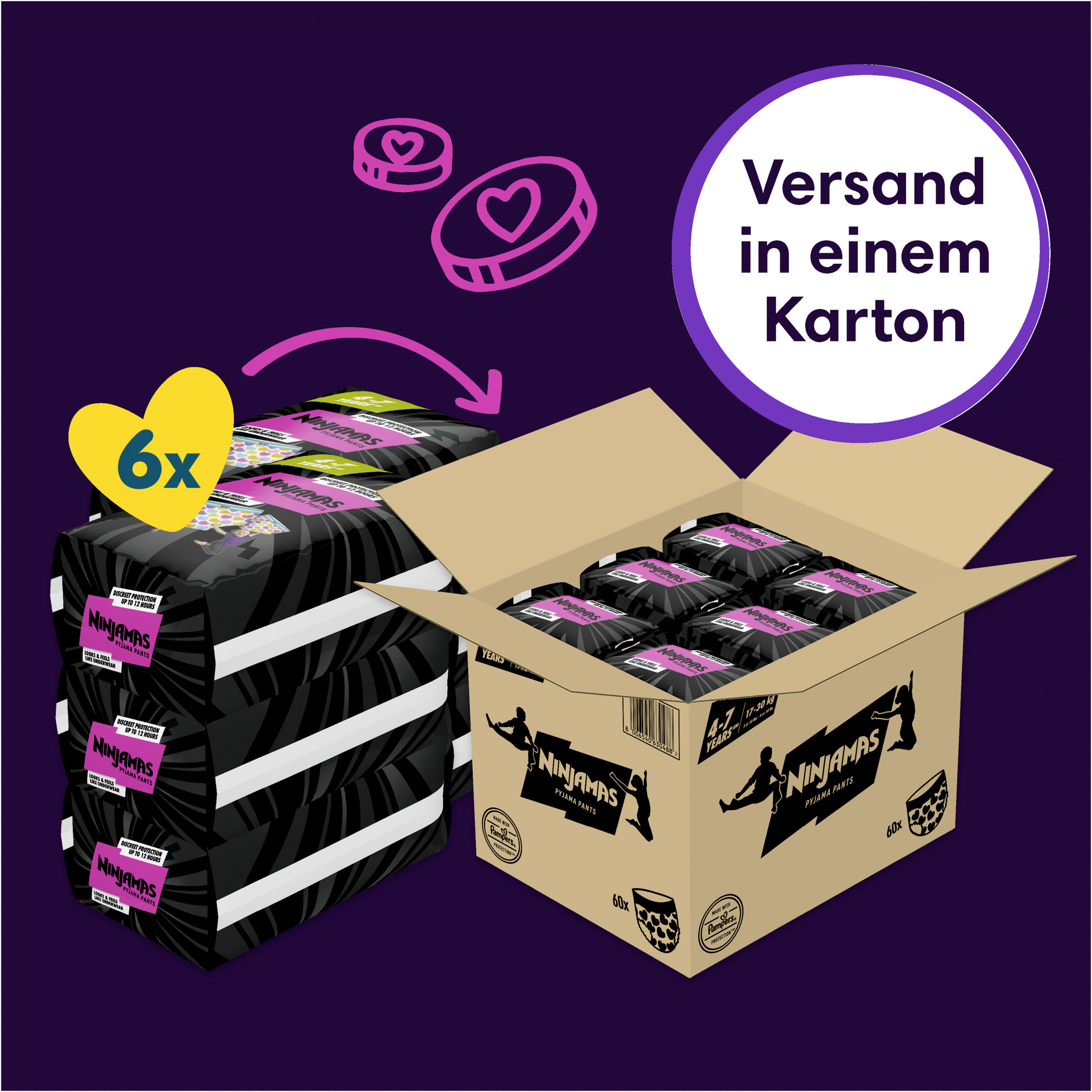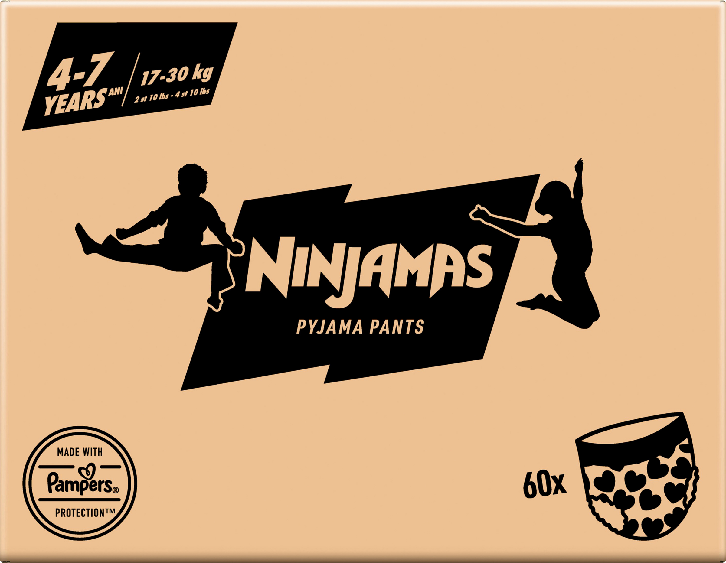 Entdecke Ninjamas absorbierende Nachthöschen! Unterstützt beim Bettnässen und sorgt dank des Auslaufschutzes für die ganze Nacht, dass dein Kind selbstbewusst aufwachen kann. Die sofort absorbierende Technologie von Ninjamas nimmt Feuchtigkeit sofort auf und bietet verlässlichen Schutz wie nie zuvor. Das 360° FormFit-Bündchen passt sich an den Bauch deines Kindes an und sitzt so diskret und bequem wie Unterwäsche. Für ein ninjastarkes Gefühl am Morgen. Genau wie für dich steht die Sicherheit deines Kindes für Pampers an erster Stelle. Ninjamas absorbierende Nachthöschen sind dermatologisch getestet, frei von EU-Parfümallergenen (wie in der EU-Kosmetikverordnung Nr. 1223/2009 reguliert) und gemäß Oekotex-Standard 100 zertifiziert.