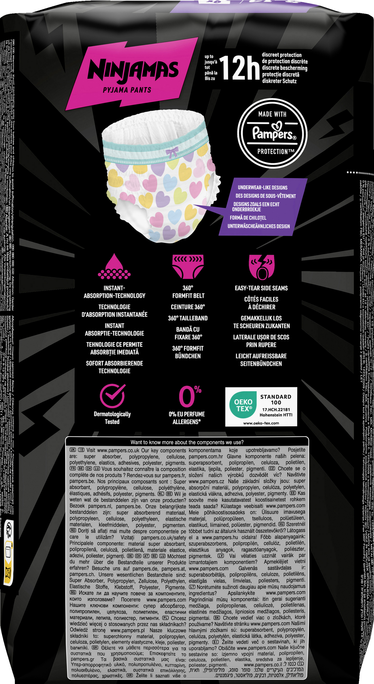 Genau wie für dich steht die Sicherheit deines Kindes für Pampers an erster Stelle. Ninjamas absorbierende Nachthöschen sind dermatologisch getestet, frei von EU-Parfümallergenen (wie in der EU-Kosmetikverordnung Nr. 1223/2009 reguliert) und gemäß Oekotex-Standard 100 zertifiziert.