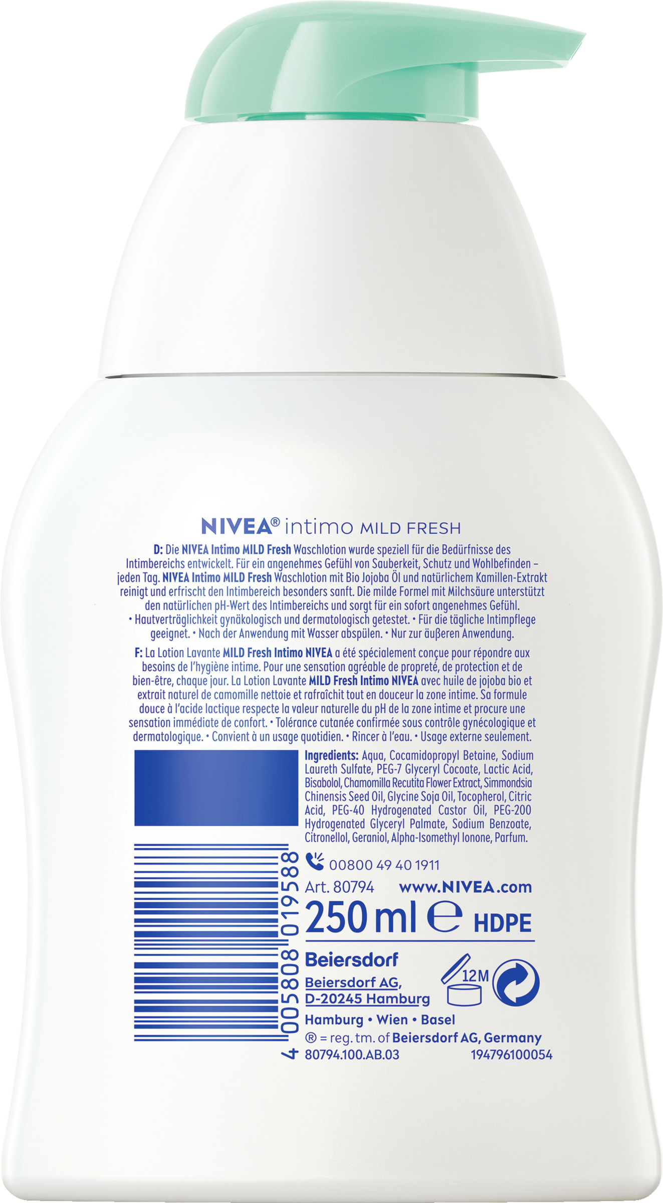 Die NIVEA Intimo Mild Fresh Waschlotion wurde speziell entwickelt, um die Ansprüche des Intimbereichs zu erfüllen. Mit ihrer schonenden Formel, die frei von Seifen und Farbstoffen ist, bietet sie täglich ein angenehmes Gefühl von Sauberkeit, Schutz und Wohlbefinden. Dies von NIVEA entwickelte Waschlotion enthält Bio Jojoba Öl und natürlichen Kamillen-Extrakt, die den Intimbereich sanft reinigen und erfrischen. Die milde Formel der NIVEA Intimo Mild Fresh Waschlotion ist besonders hautfreundlich und unterstützt den natürlichen pH-Wert des Intimbereichs. Sie ist für alle Hauttypen geeignet und hinterlässt sofort ein angenehmes Gefühl. Diese Waschlotion bietet nicht nur Reinigung, sondern auch Pflege und Frische für den sensiblen Intimbereich. Vertrauen Sie auf NIVEA Intimo Mild Fresh Waschlotion für ihre tägliche Intimhygiene