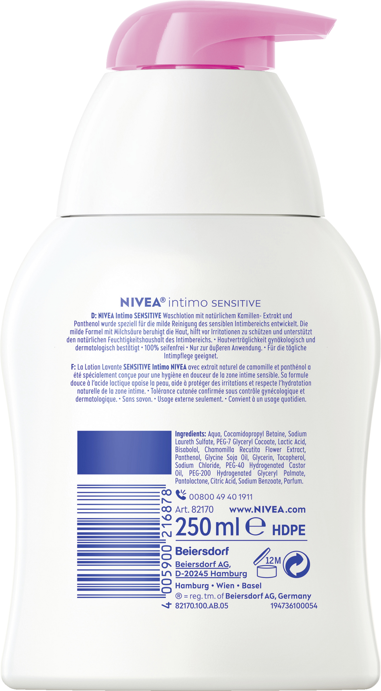 Die NIVEA Intimo Waschlotion Sensitive mit natürlichem Kamillenextrakt und Panthenol wurde speziell für die milde Reinigung des sensiblen Intimbereichs entwickelt, die für die tägliche Intimpflege geeignet ist. Die milde Formel, angereichert mit Milchsäure, verleiht der Waschlotion beruhigende Eigenschaften, die die Haut pflegen, Irritationen vorbeugen und zugleich den natürlichen Feuchtigkeitshaushalt des Intimbereichs unterstützen.